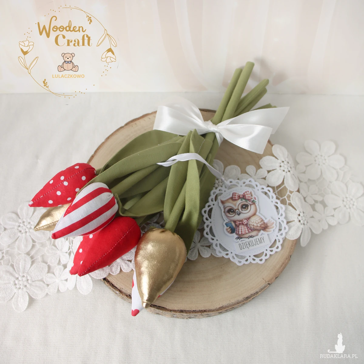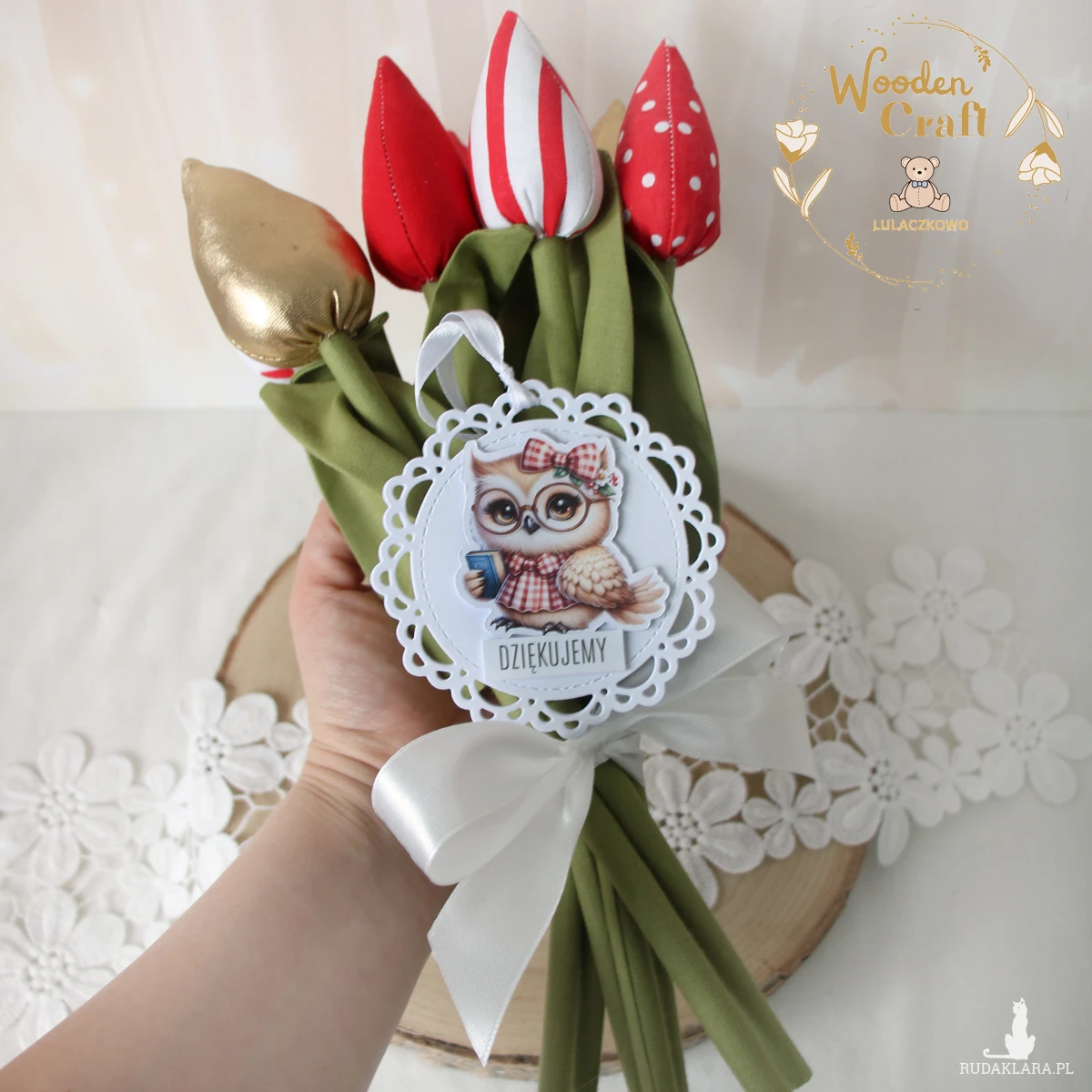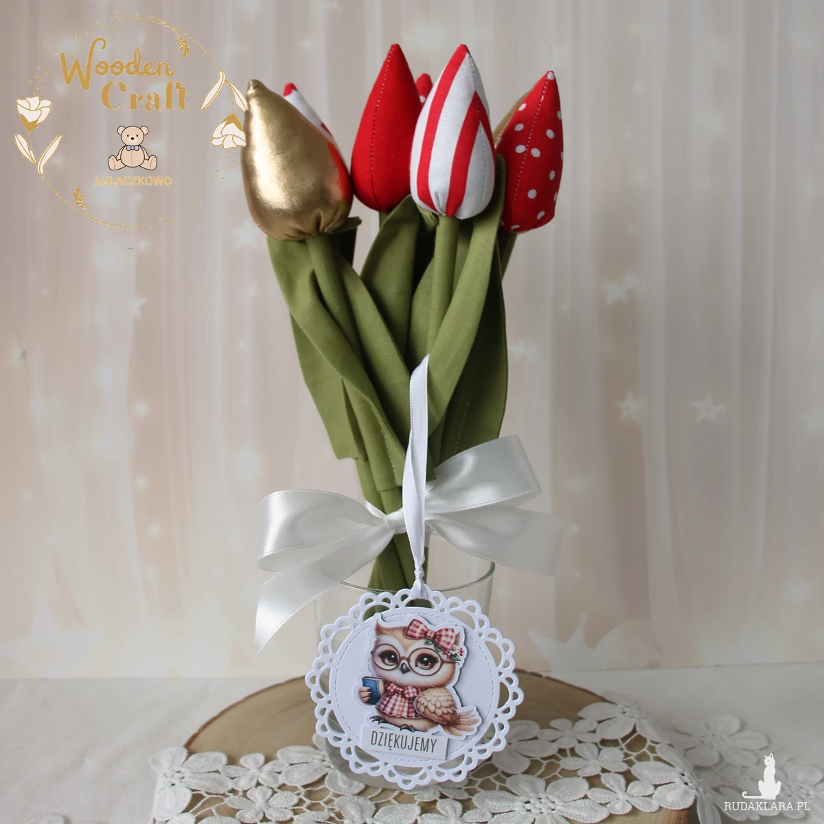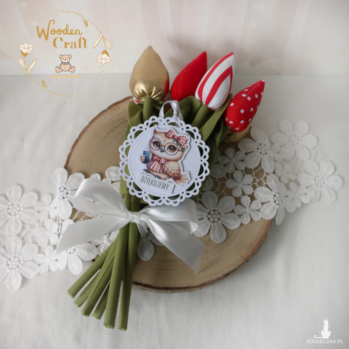 Śliczne, ręcznie szyte materiałowe tulipany, idealne jako prezent na zakończenie roku szkolnego dla nauczyciela, wychowawcy. Bukiet ma dołączony bilecik z uroczą sową oraz napisem "Dziękujemy" na odwrocie mogę również umieścić dowolną dedykację.
