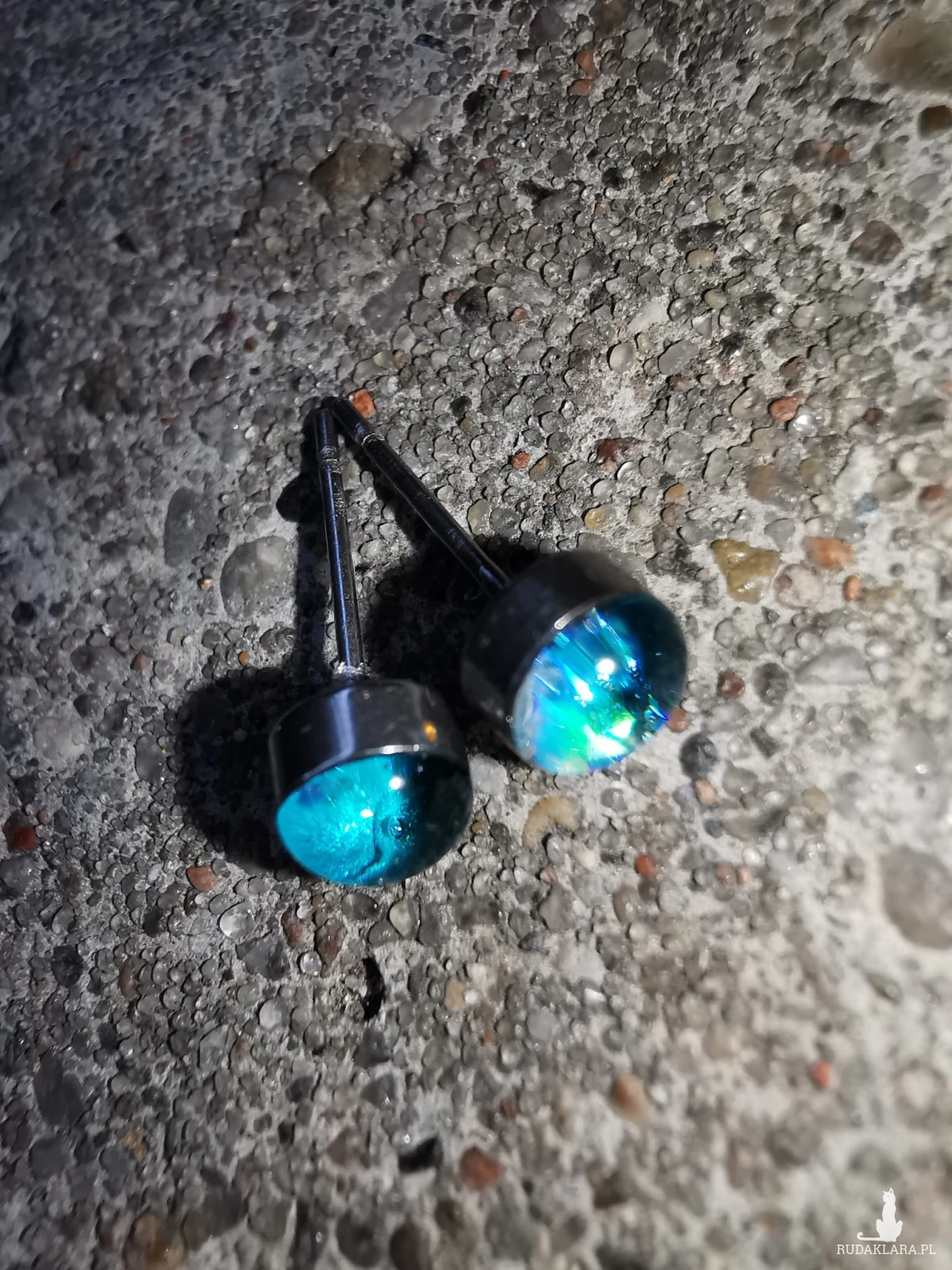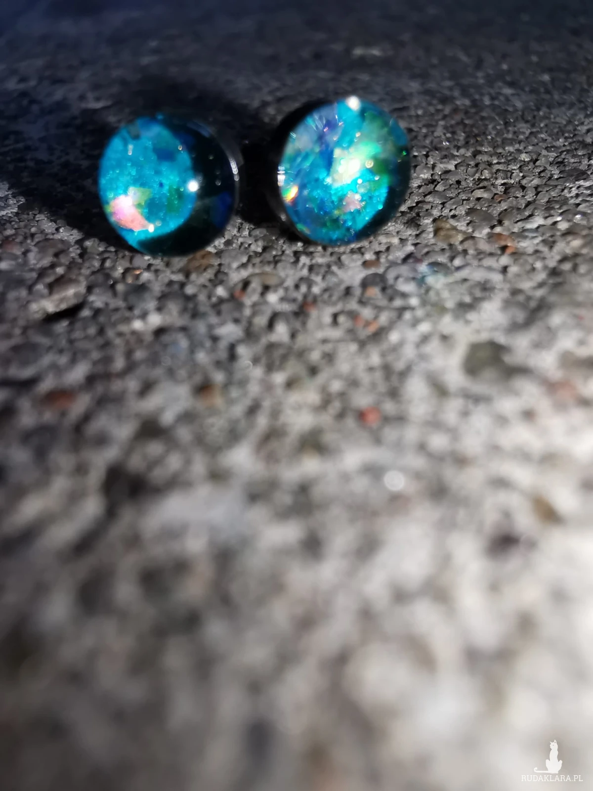 Drobne kolczyki stalowe 4mm, ręcznie wypełnione żywicą epoksydową i brokatami. Mocno się mienia różnymi kolorami. Są gustownym dodatkiem do różnych stylizacji.