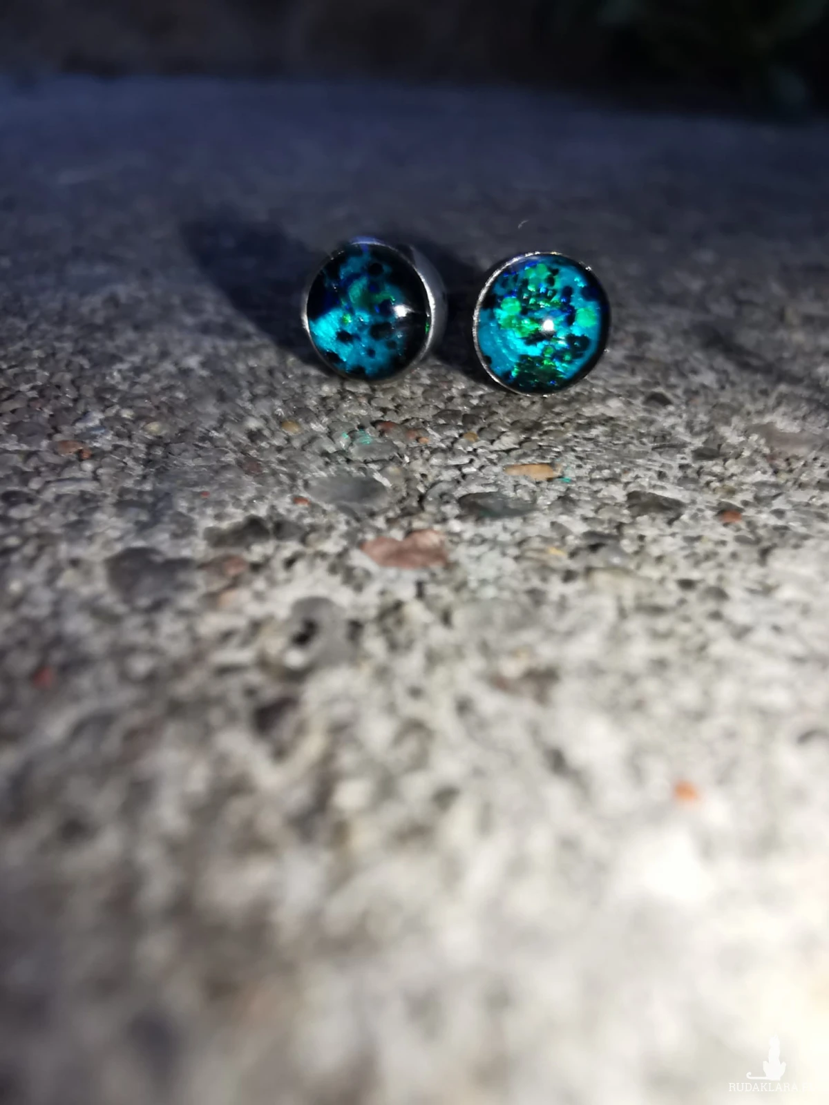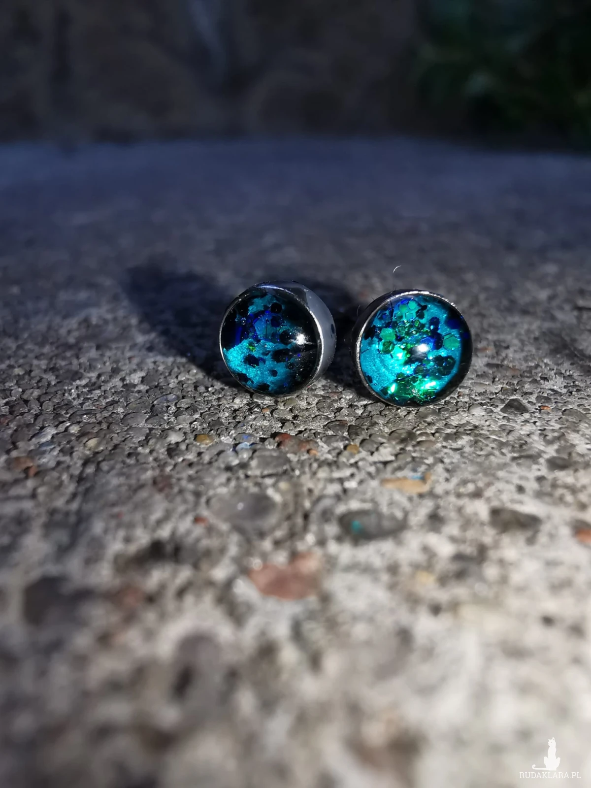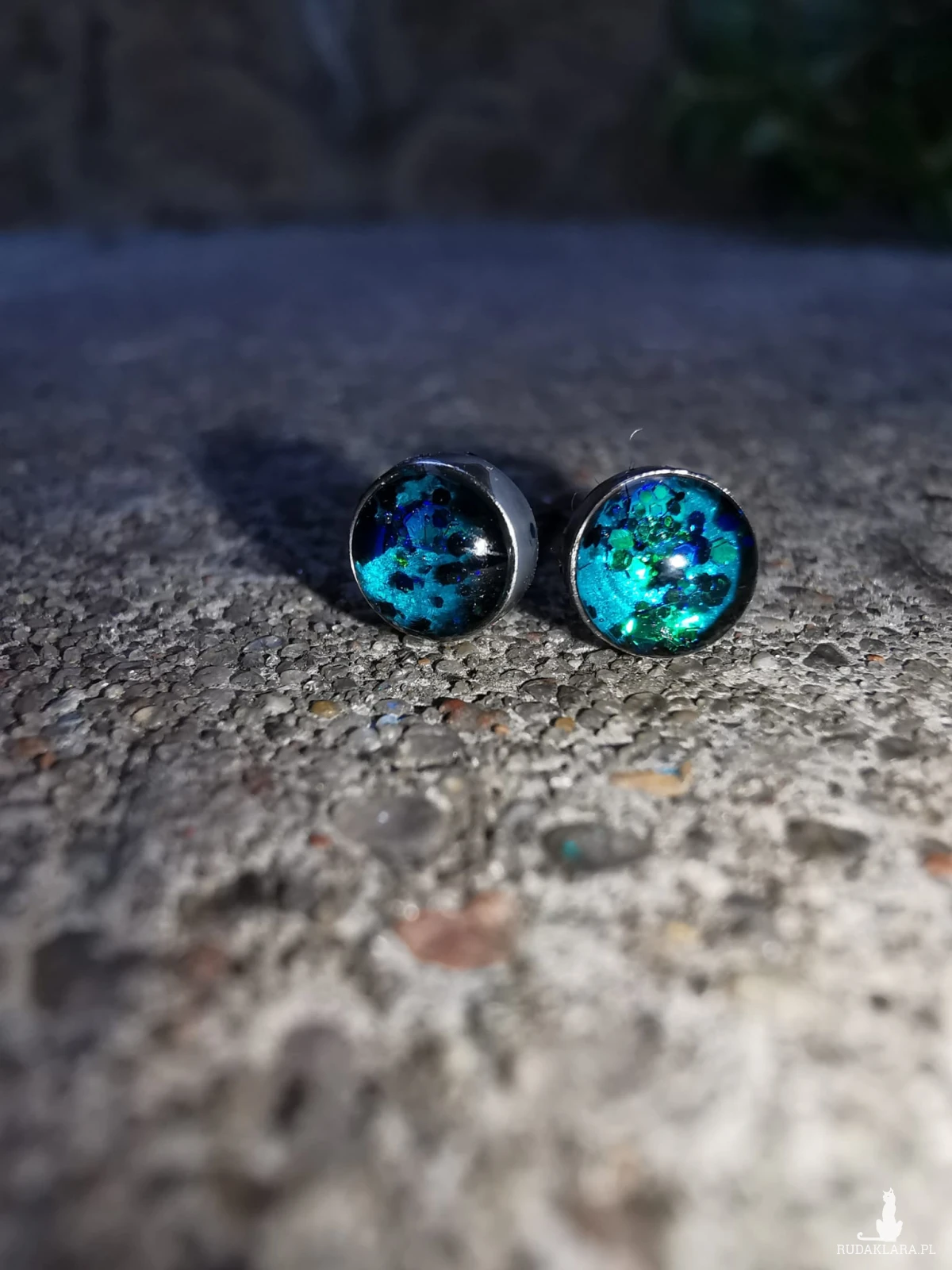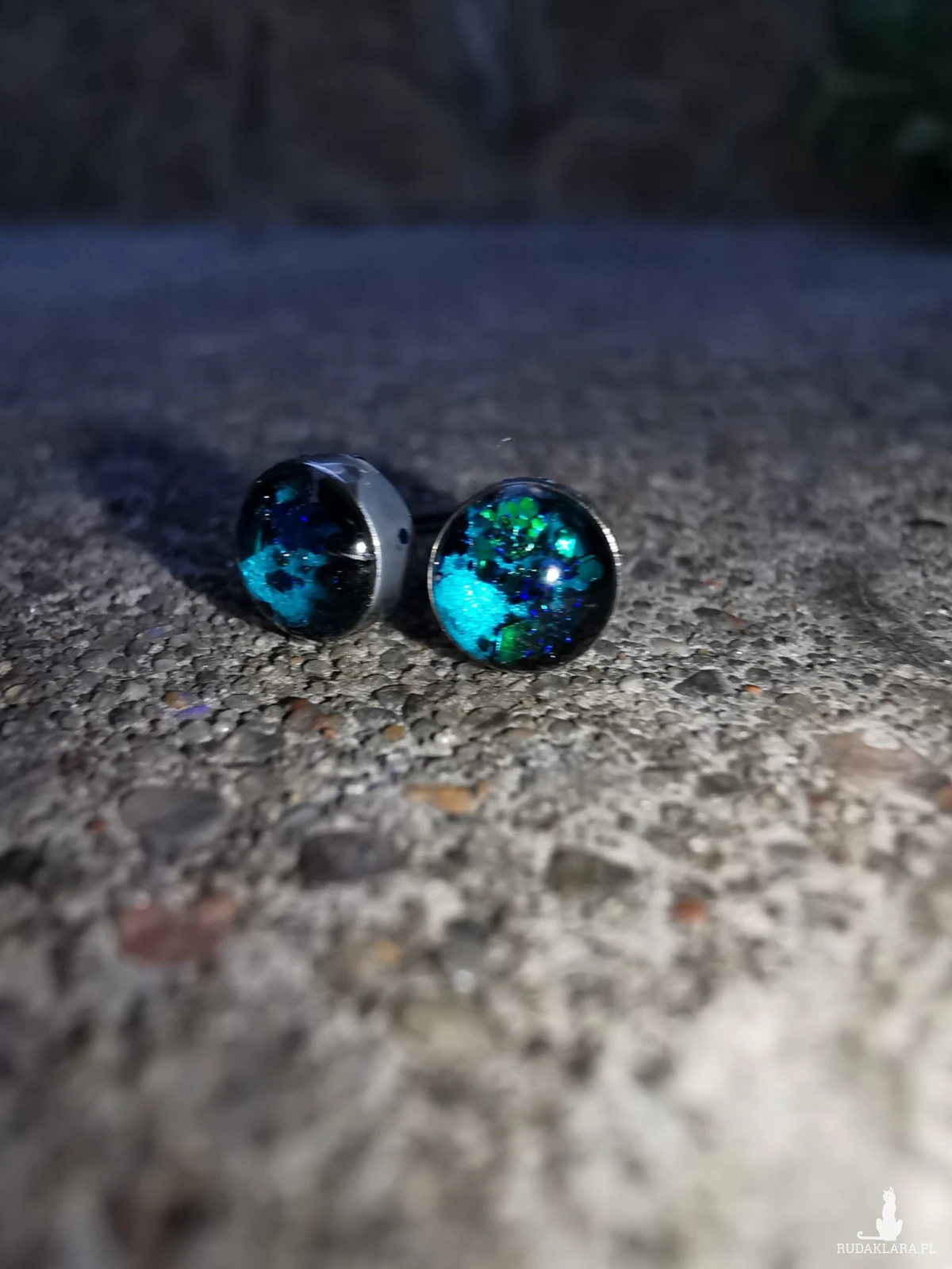 Drobne kolczyki stalowe 4mm, ręcznie wypełnione żywicą epoksydową i brokatami. Mocno się mienia różnymi kolorami. Są gustownym dodatkiem do różnych stylizacji.