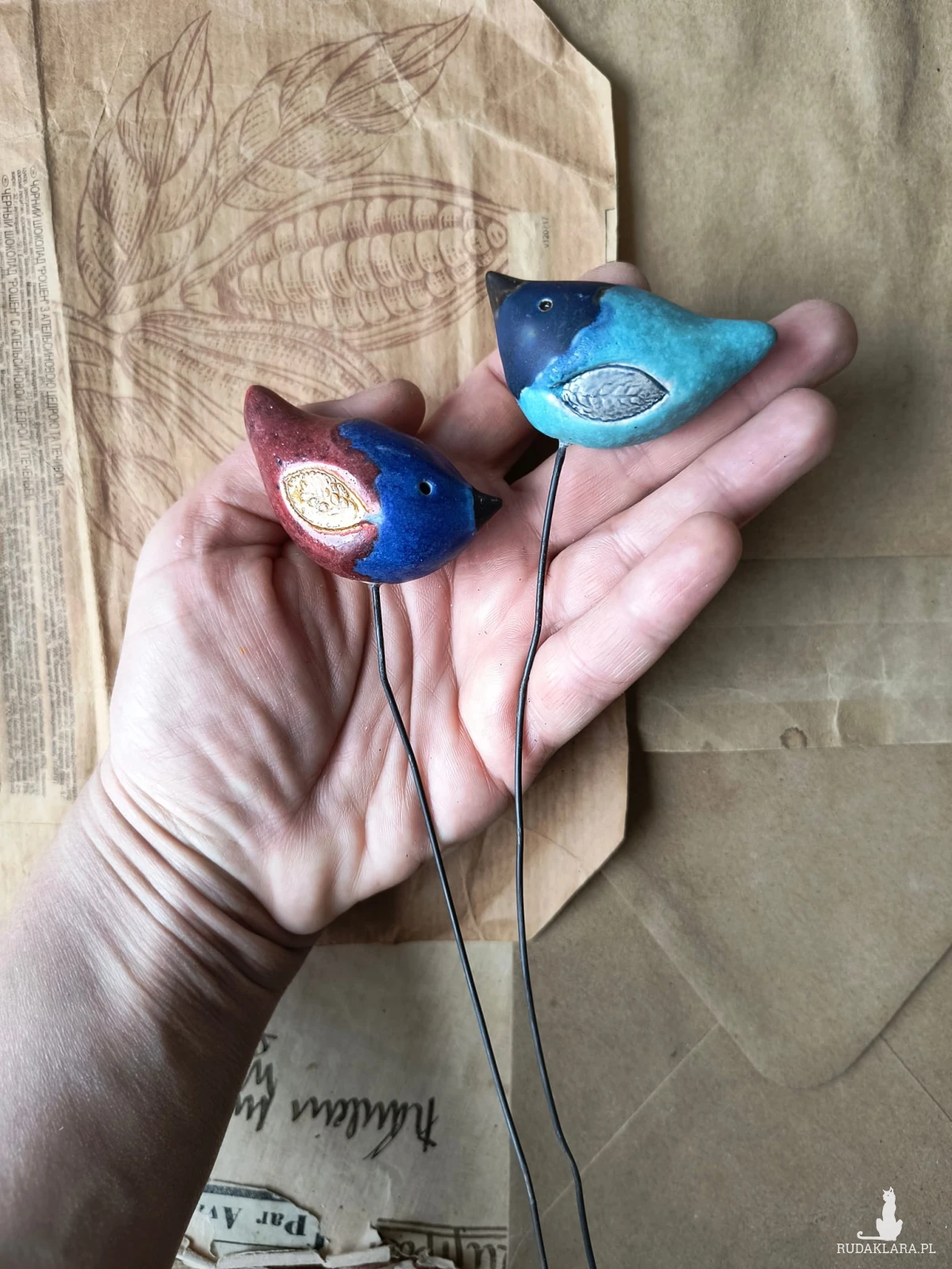 Komplet ptaszków ceramicznych na piku, wykonanych z gliny szamotowe, wypalonych na biskwit, a następnie szkliwionych w temp. ok 1260 stopni C. Wymiary 6 cm x 5,5 cm. Do postawienia na półeczce, lustrze lub jako przycisk do papieru czy serwetek. Dostępne również osobno. Serdecznie polecam!!!