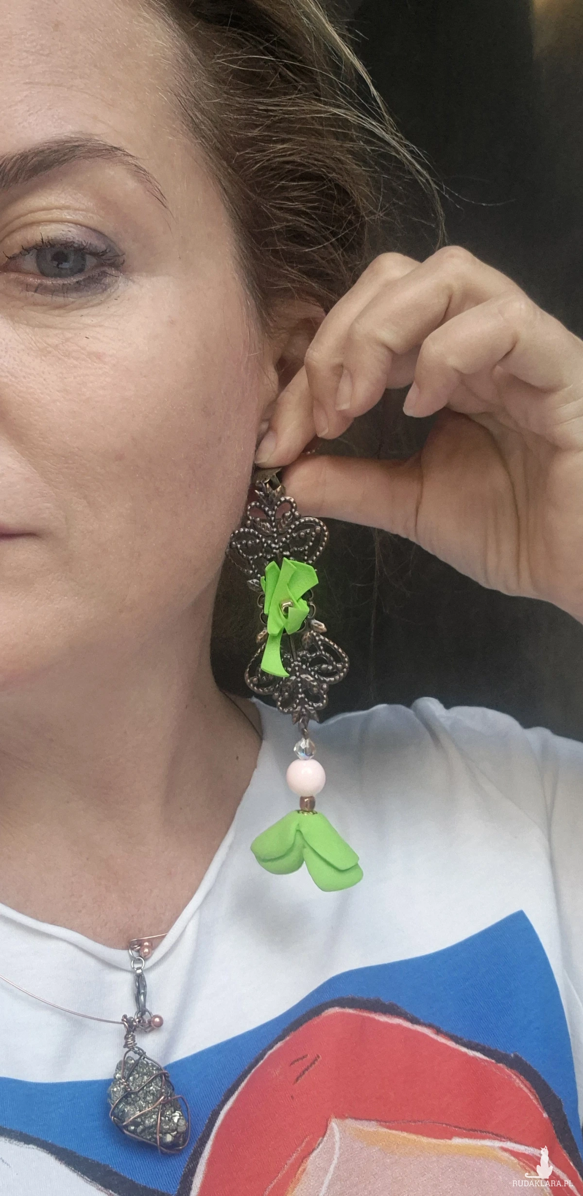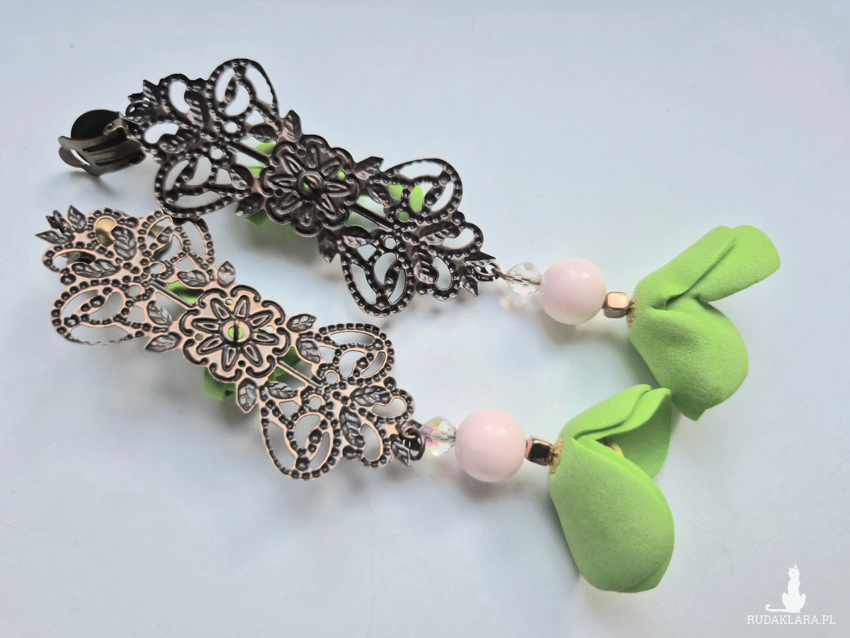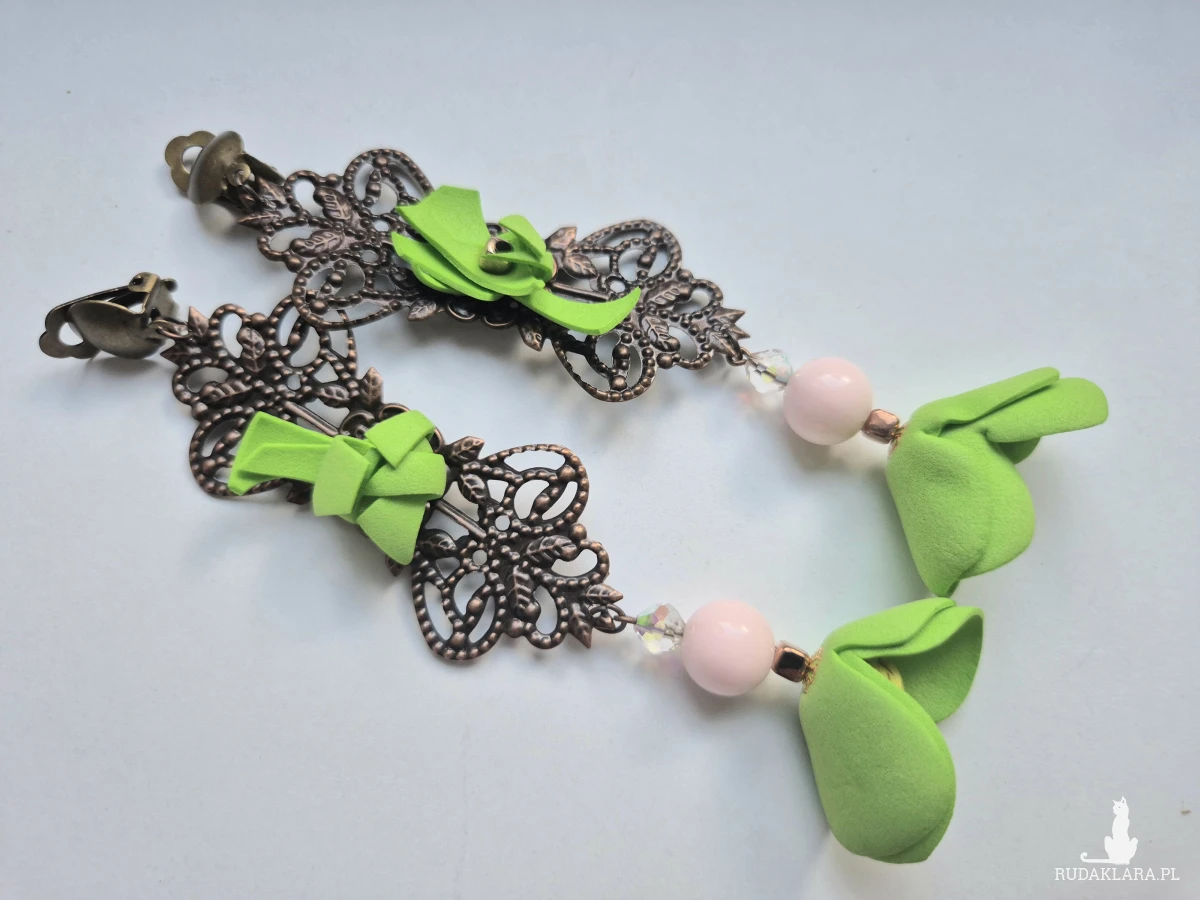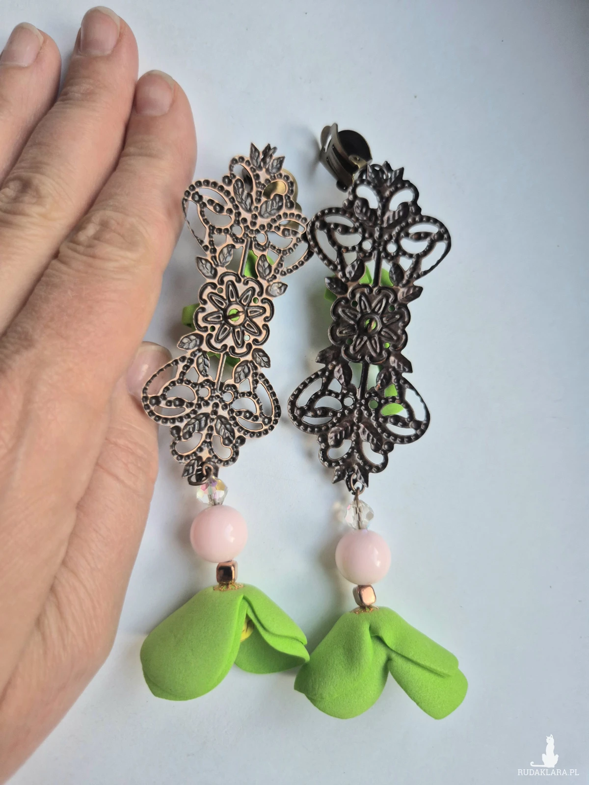 Klipsy długie zielone kwiaty i filigrany bardzo stylowe polecam zwracają uwagę duże leciutkie cudne Box X1