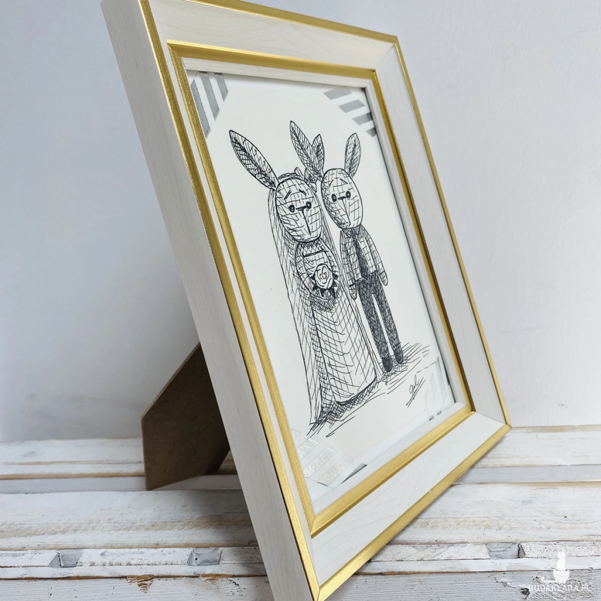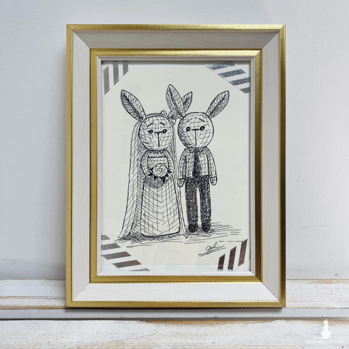 Młoda Para – rysowane piórkiem króliczki w ozdobnej ramce – ręcznie robiony prezent ślubny