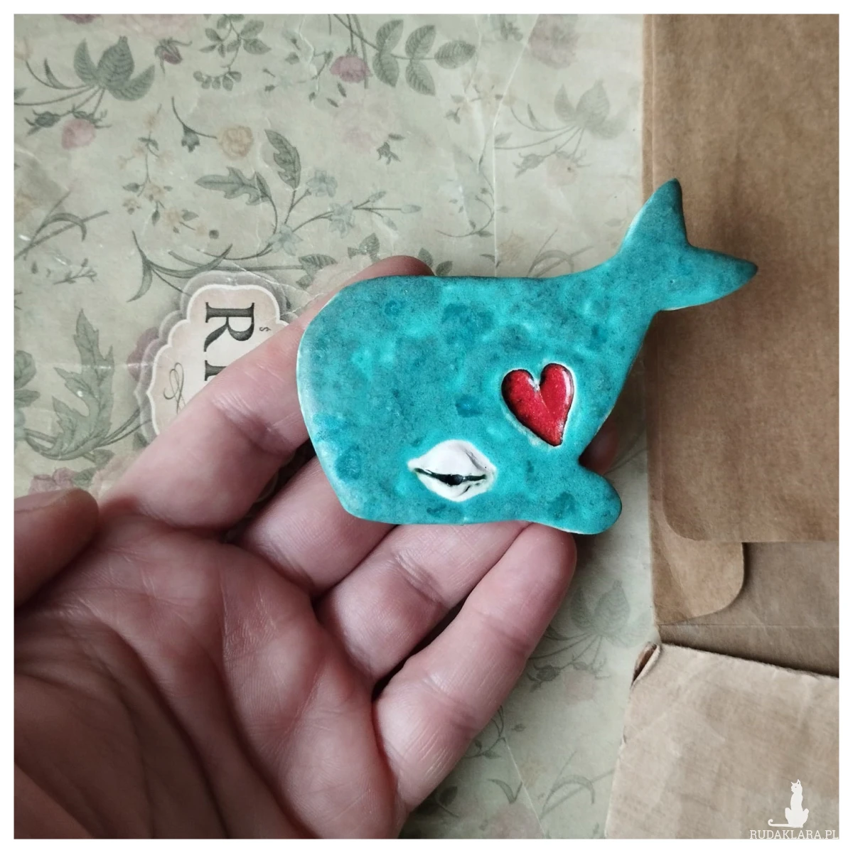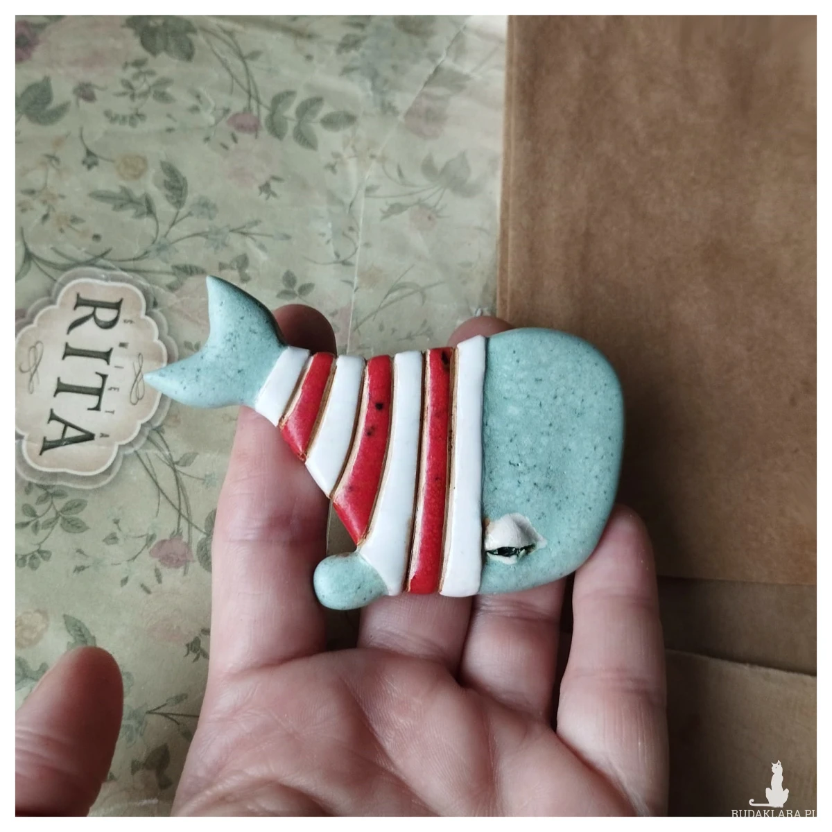 Broszki wielorybki wykonane z gliny szamotowej, wypalone na biskwit, a następnie szkliwione w temperaturze ok 1260 stopni C. O wymiarach ok; 4,5 cm x 8,5 cm. Serdecznie polecam wszystkim Paniom poszukującym nietuzinkowej biżuterii.