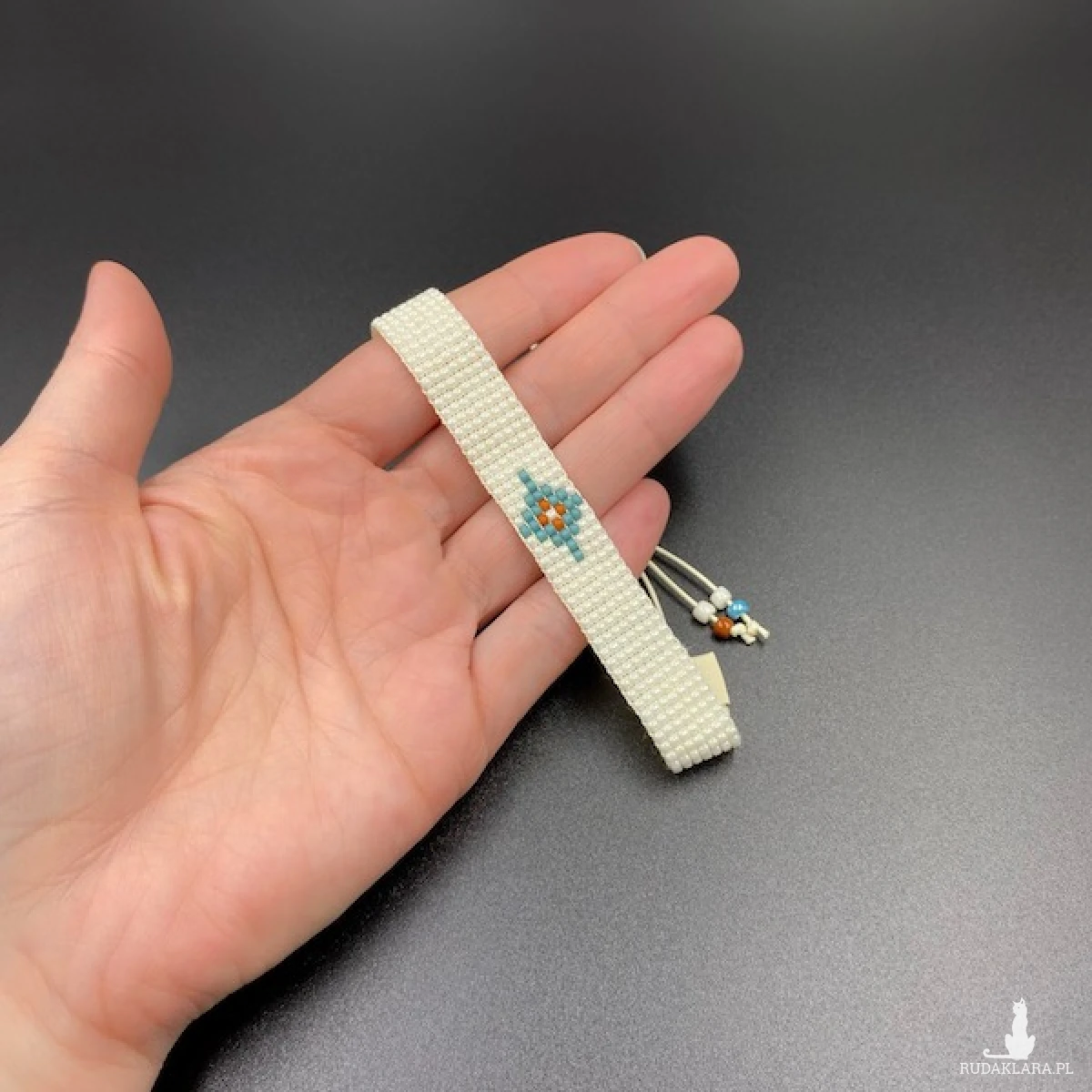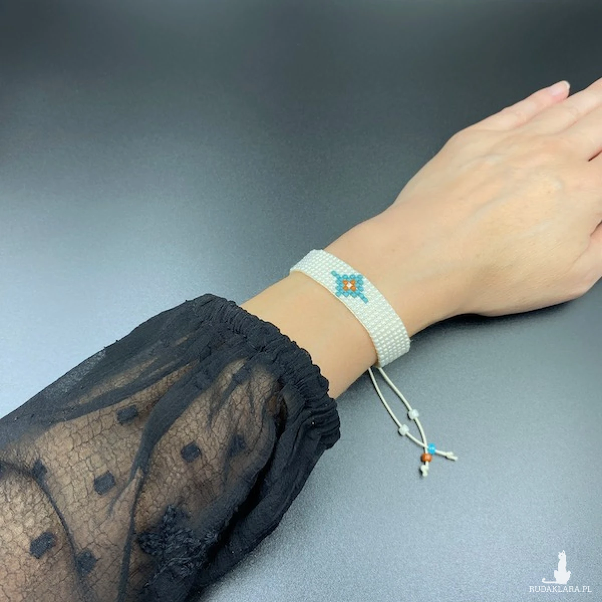 Bransoletka została utkana na krośnie z koralików Toho. Jest bardzo plastyczna i swobodnie układa się na nadgarstku.