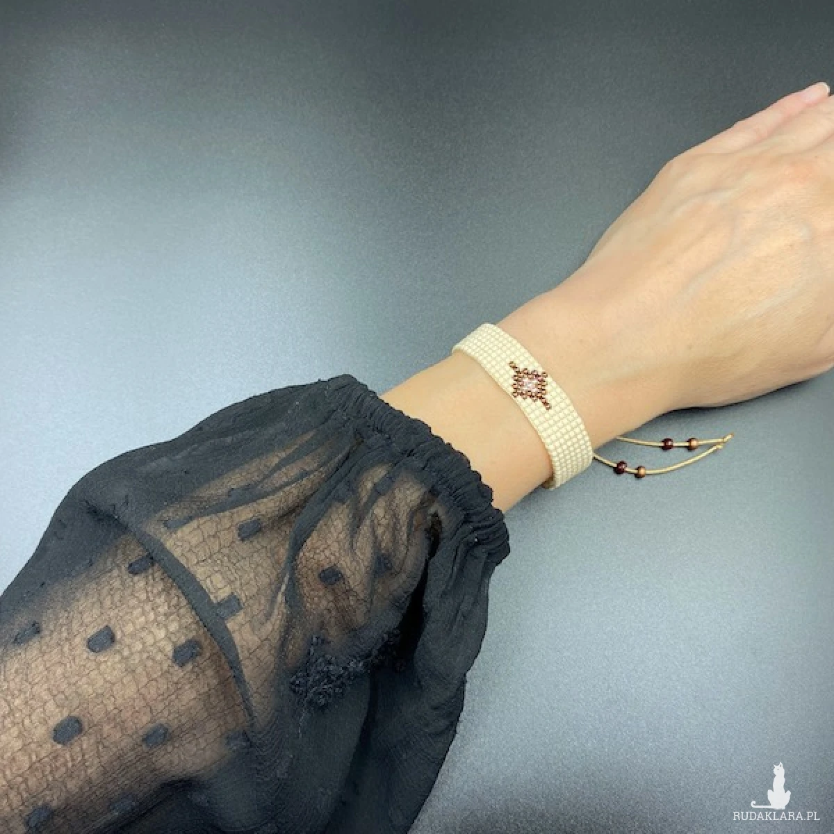 Bransoletka została utkana na krośnie z koralików Toho. Jest bardzo plastyczna i swobodnie układa się na nadgarstku.