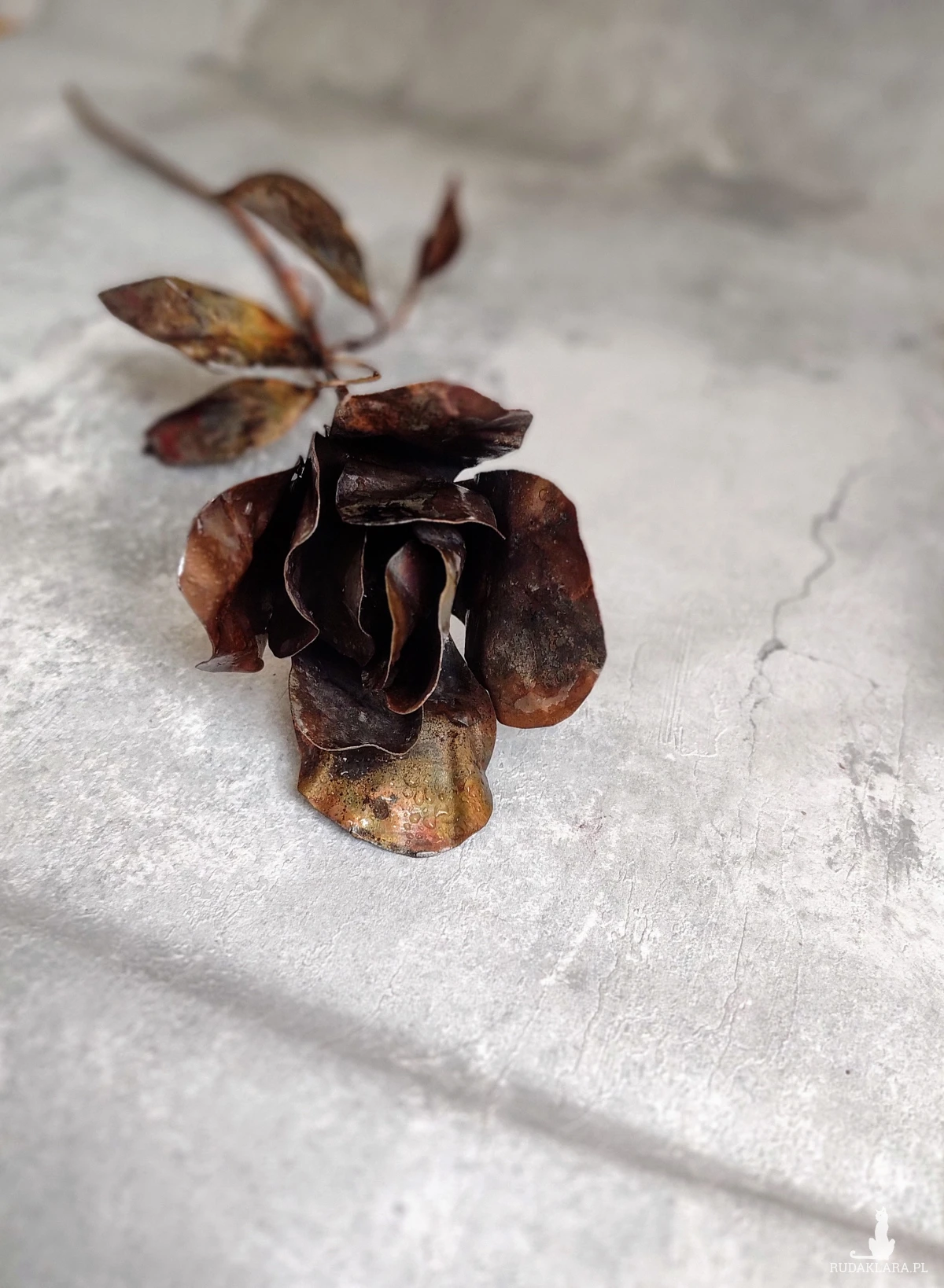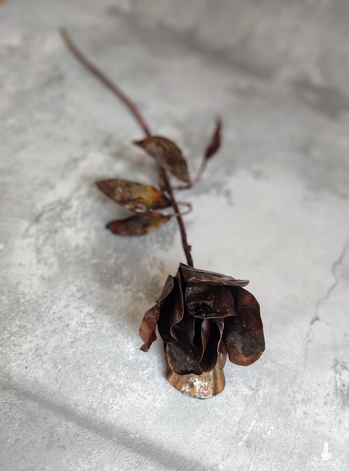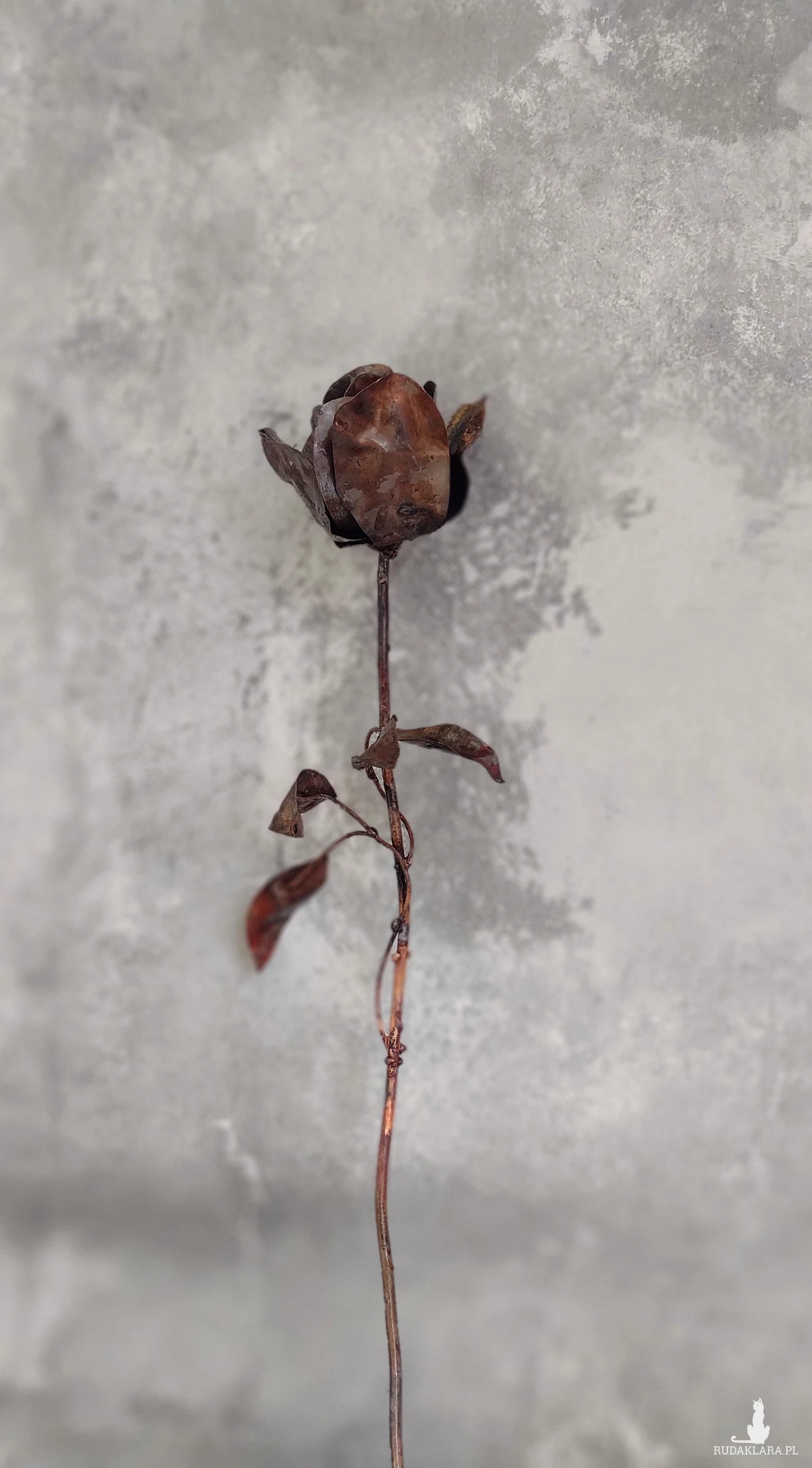 Miedziana róża. Wykonywana całkowicie ręcznie. Wysokość około 50 cm.