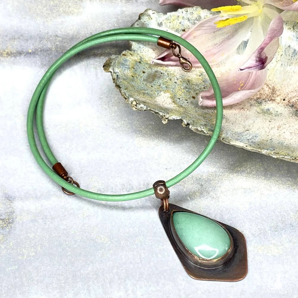 Delikatna mięta i ciepła miedź tworzą wyrazistą, ale harmonijną parę. Centralny punkt naszyjnika stanowi geometryczna zawieszka z pastelowym jadeitem, który przyciąga wzrok subtelnym, rozświetlającym odcieniem. Otulony polerowaną i oksydowaną miedzią kamień zyskuje szlachetny charakter, a zielony rzemień nadaje całości lekkości i nowoczesnej swobody.