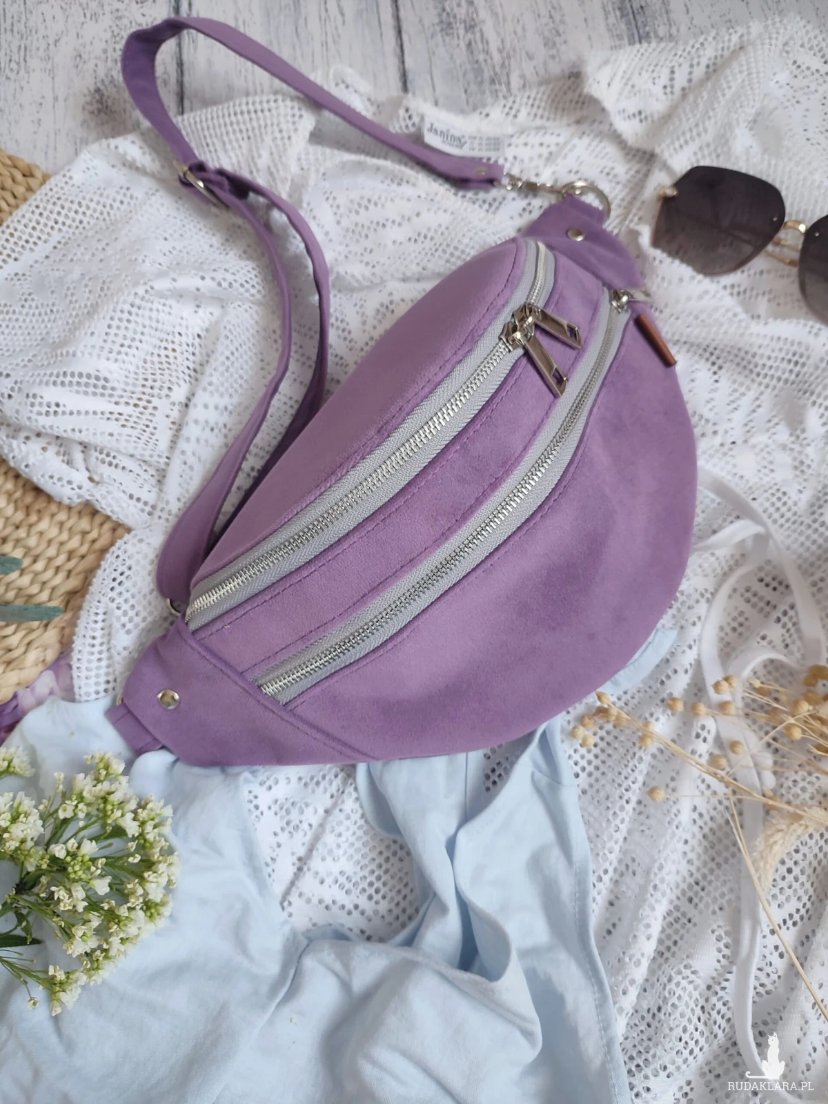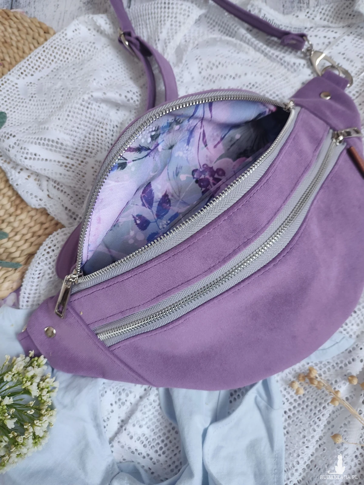 Uszyta z weluru w kolorze lawendowym. Podszewka z tkaniny wodoodpornej z wzorem. Okucia metalowe w kolorze srebrnym.