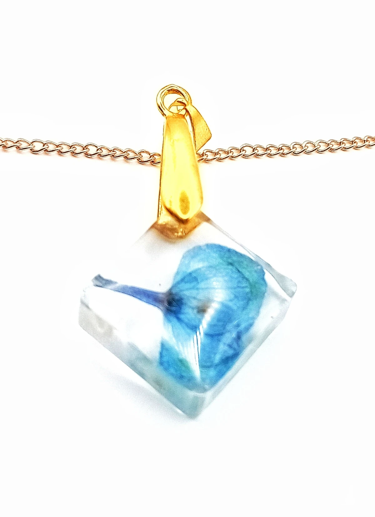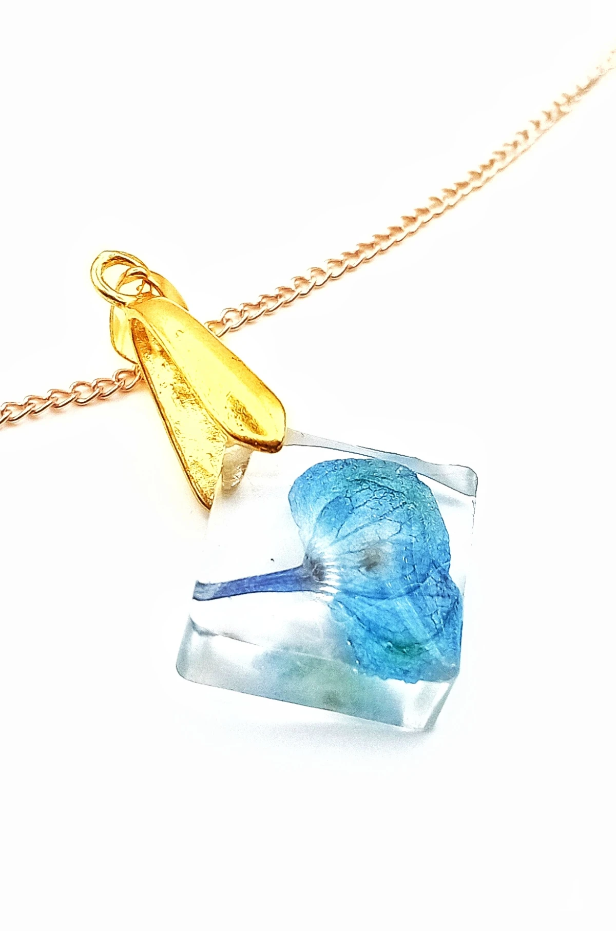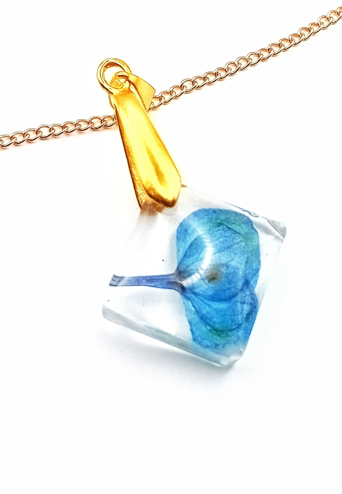 wisiorek z żywicy handmade, biżuteria z kwiatami, hortensja w żywicy, prezent dla kobiety, zawieszka z rośliną, naturalna biżuteria, żywica epoksydowa biżuteria, biżuteria boho, kwiat w żywicy, elegancki prezent handmade, zawieszka z kwiatem