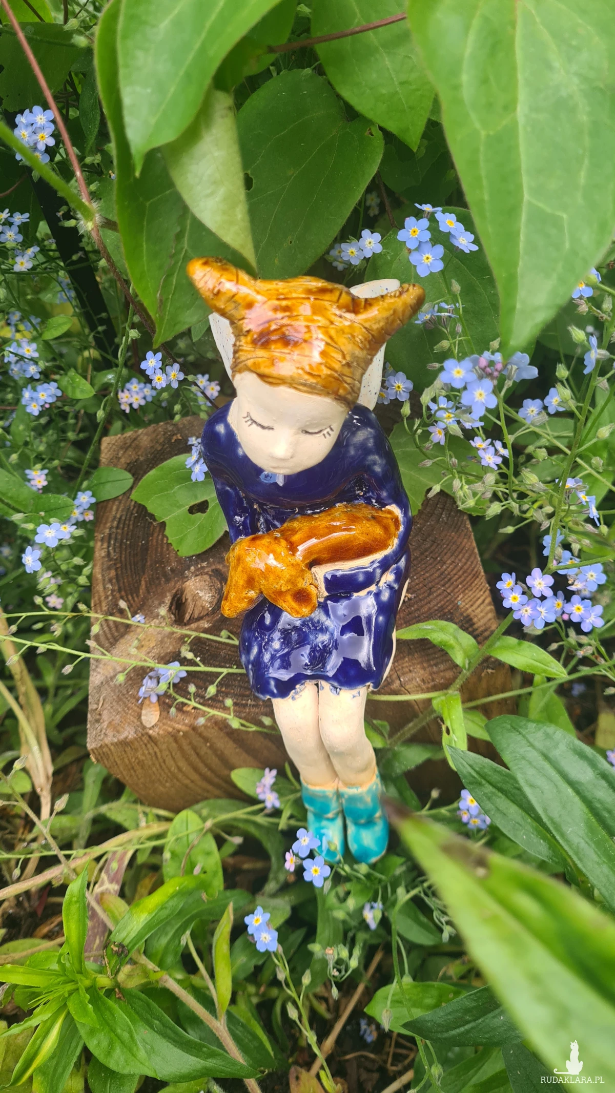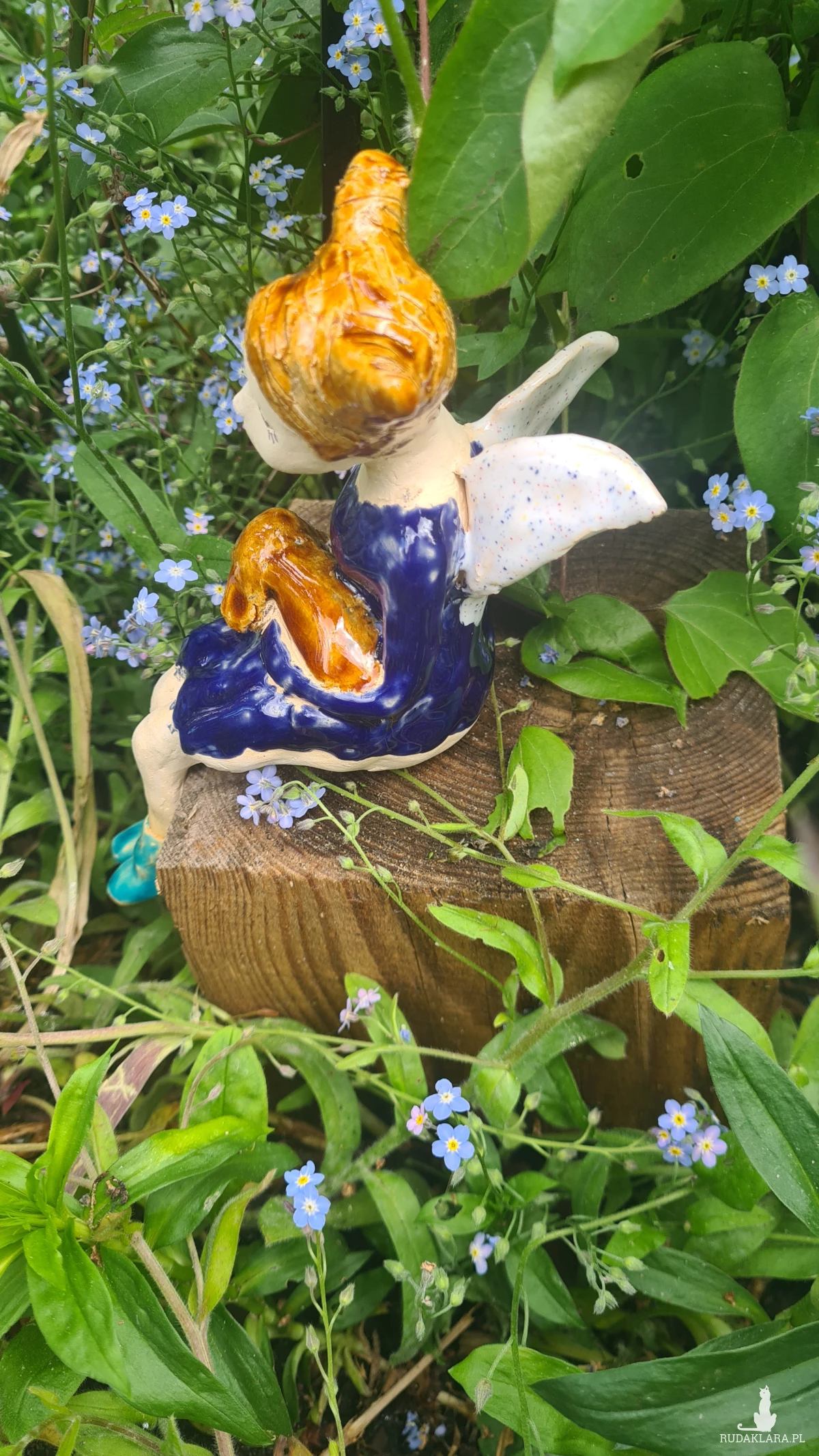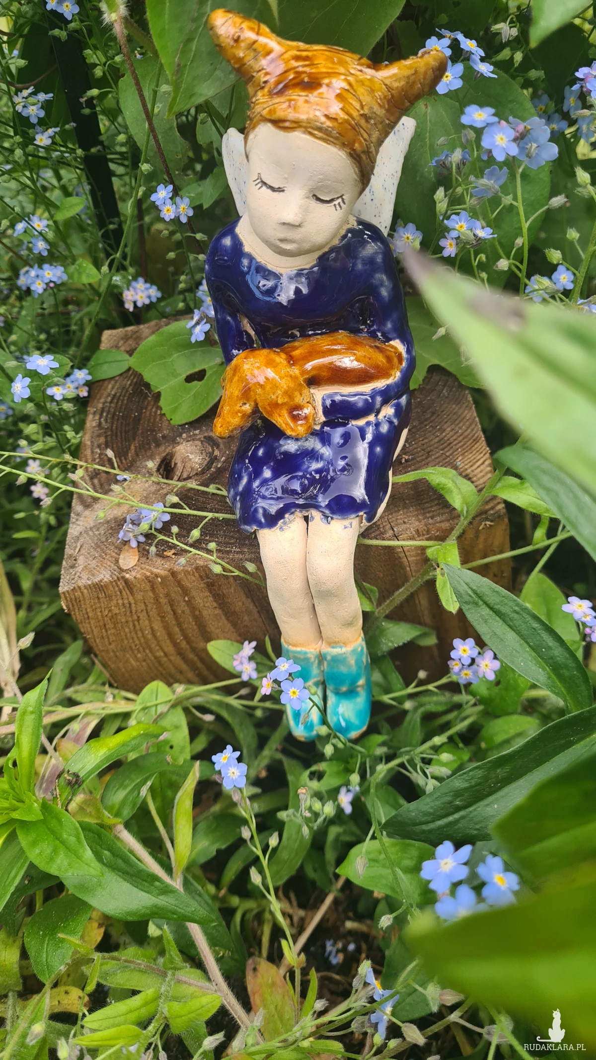 Piękny ceramiczny anioł z pieskiem wykonany z jasnej gliny, pokryty błyszczącymi szkliwami, dwukrotnie wypalany w piecu. Wymiary 20 cm.
