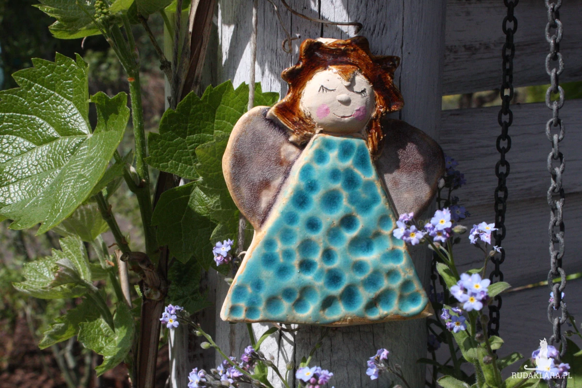 Anioł ceramiczny wykonany z jasnej gliny, pokryty błyszczącymi szkliwami ceramicznymi, dwukrotnie wypalany w wysokiej temperaturze. Wysokość 11 cm, do zawieszenia na ścianie lub w ogrodzie.