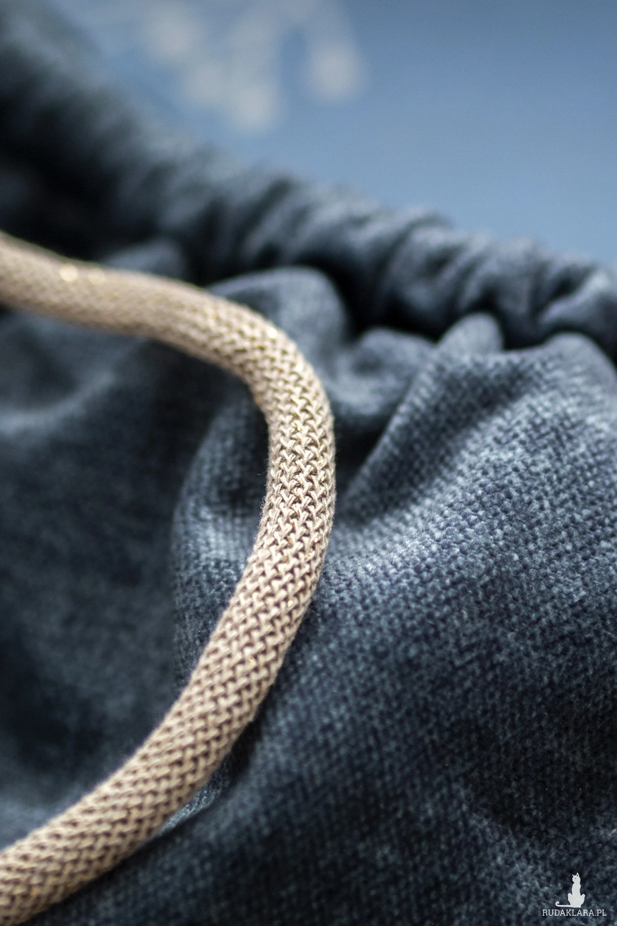 Plecak worek wykonany z filcu w kolorze brudnoniebieskim.