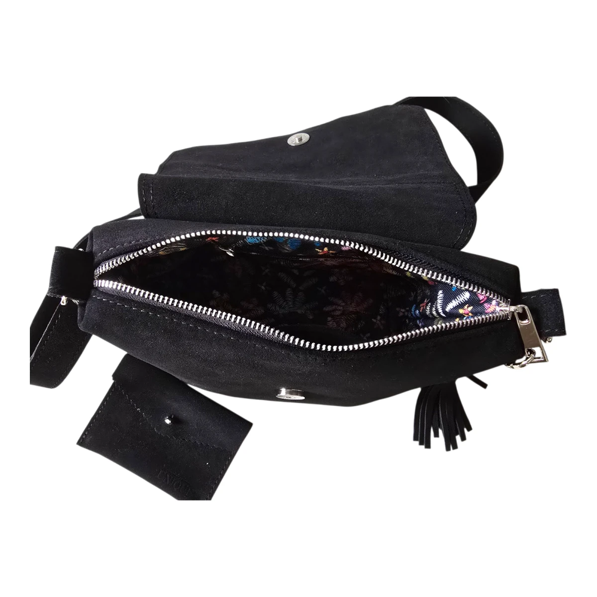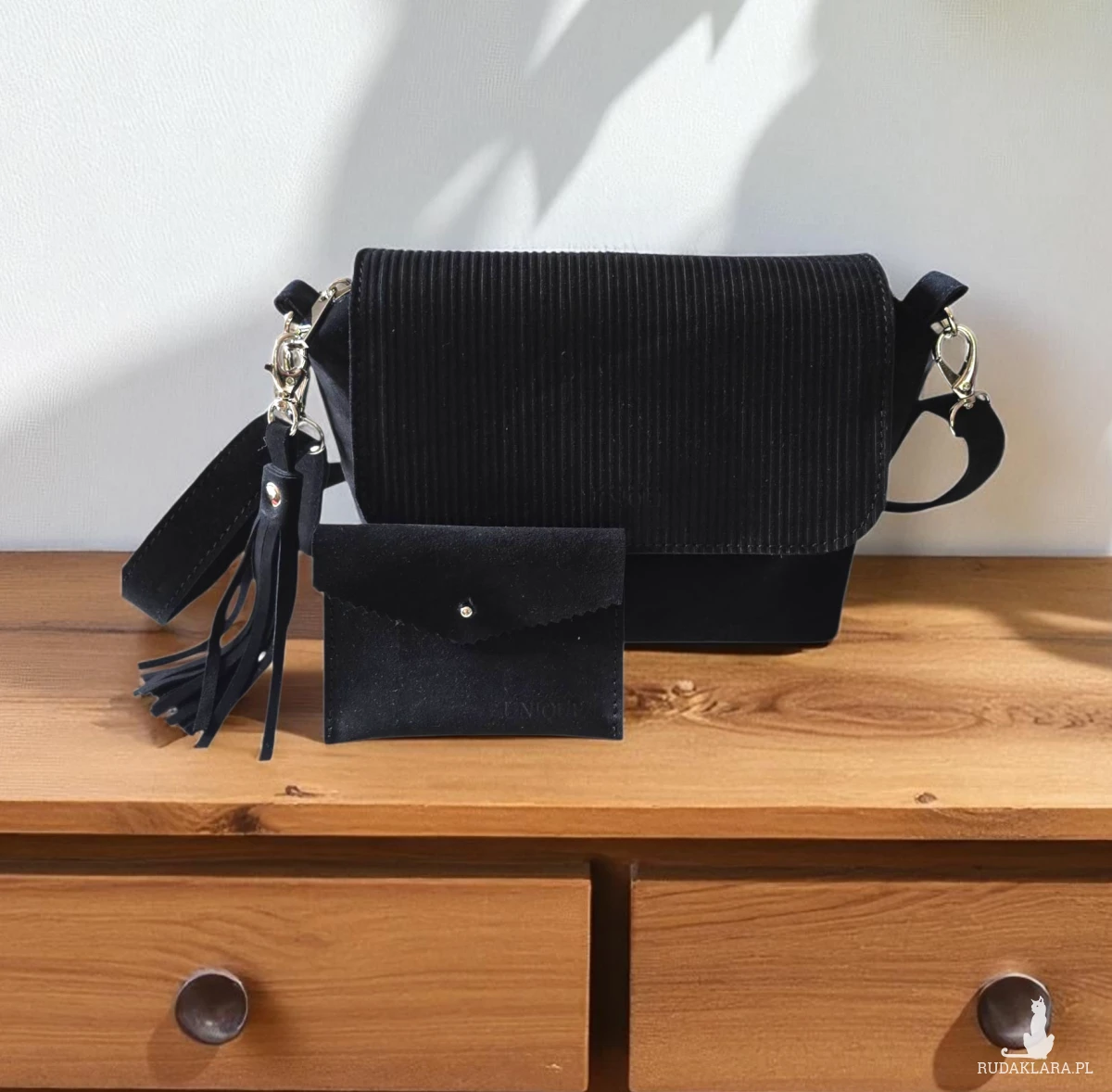 Uszyta z naturalnej skóry zamszowej, klapka tłoczona w prążki tzw. 'sztruks'.