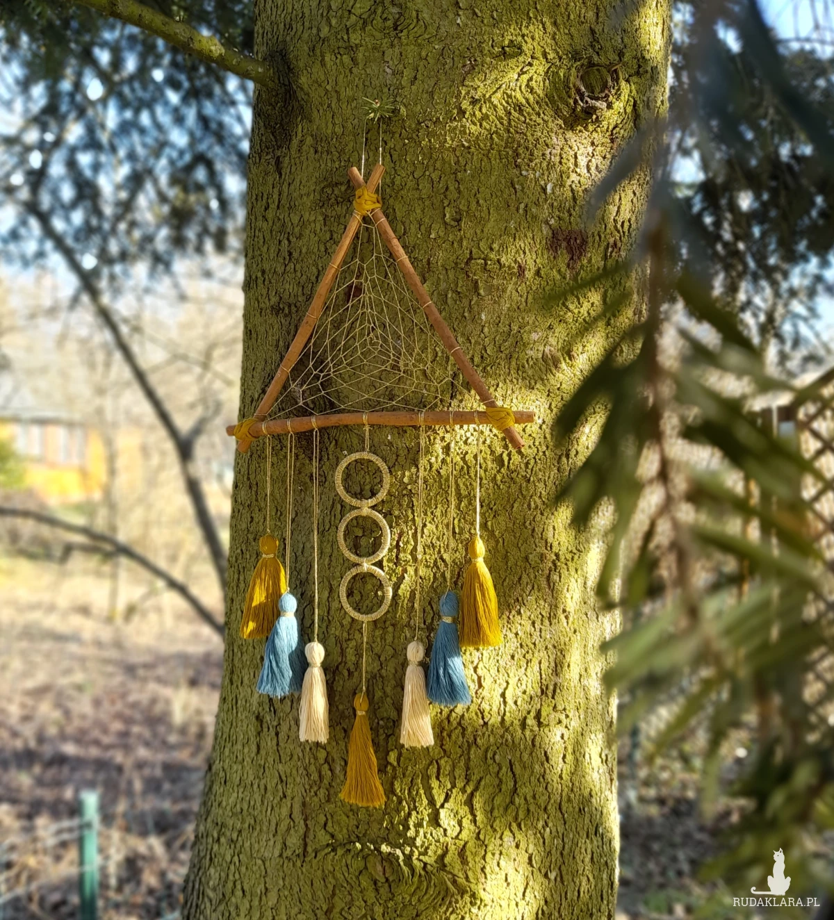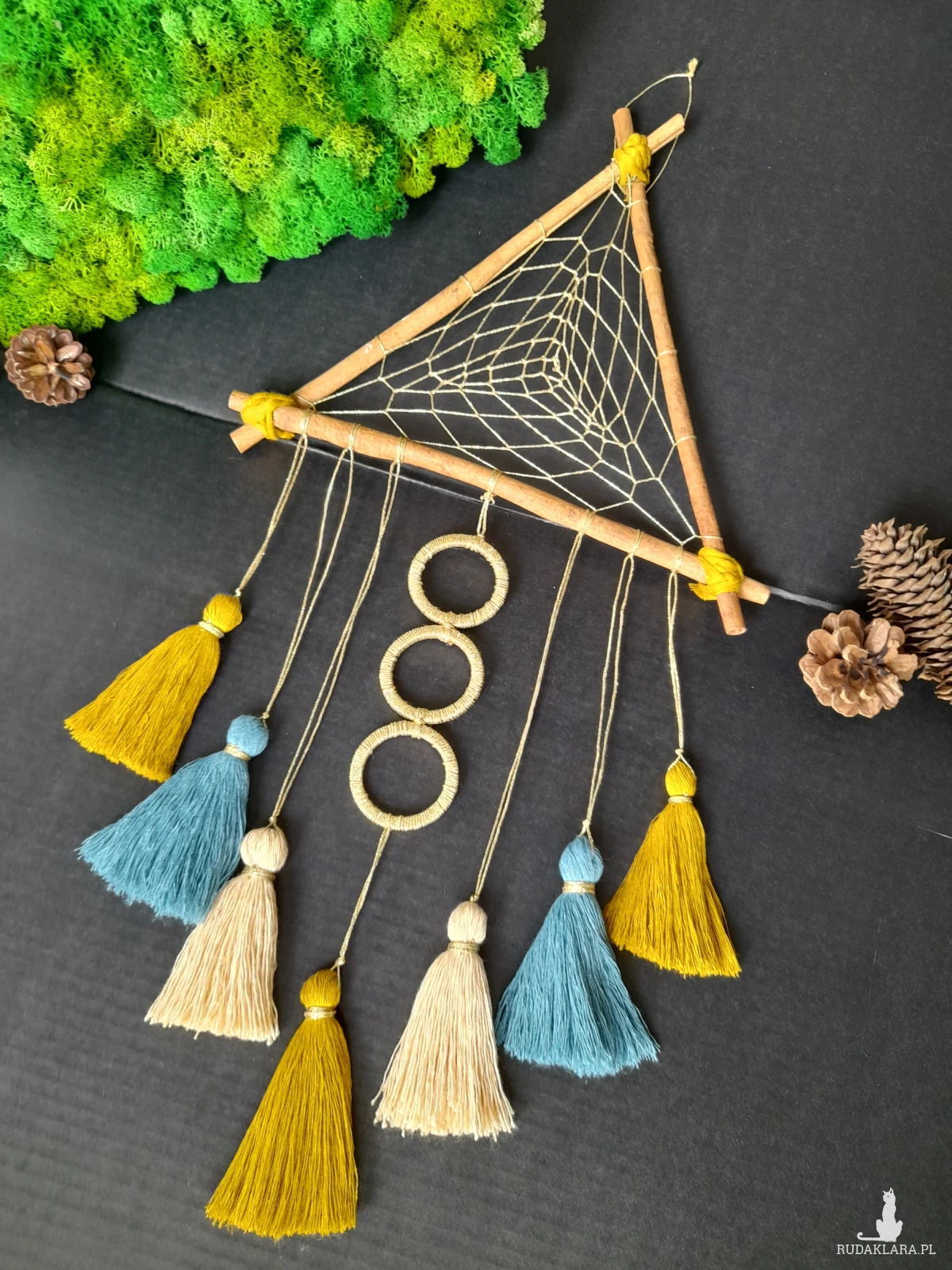Trójkątny kształt i detale ze złotej nici oraz ręcznie tkane kółeczka nadają całości elegancji i lekkości, dzięki czemu makrama pasuje zarówno do przytulnych, rustykalnych wnętrz, jak i nowoczesnych, boho aranżacji.