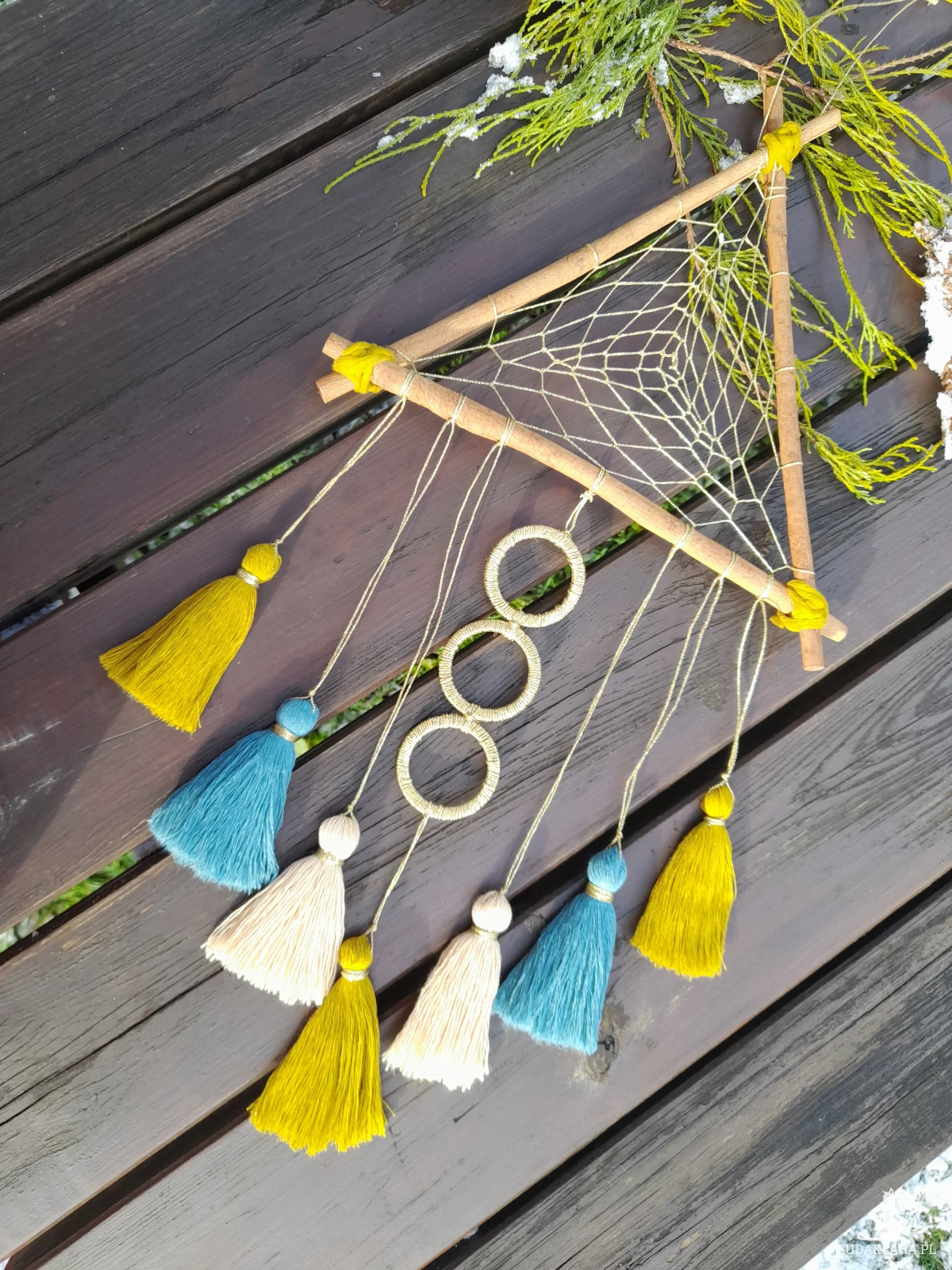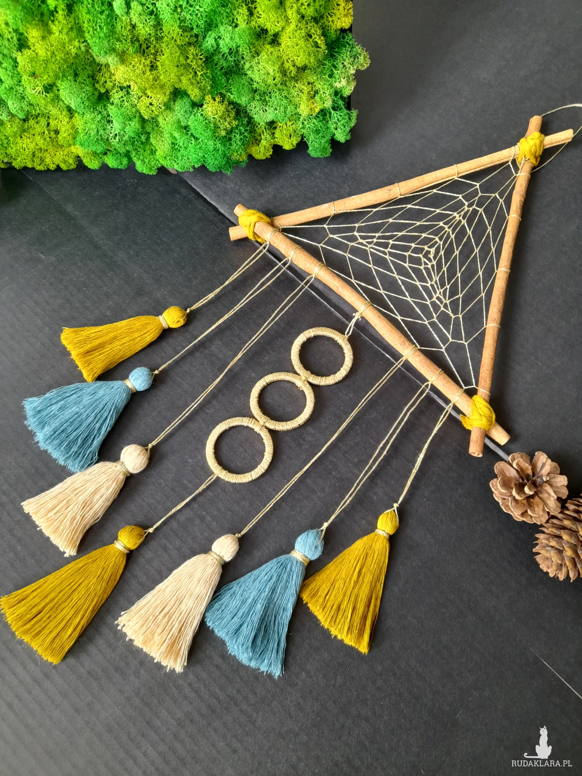 Wyjątkowy, kolorowy łapacz snów w stylu boho, który zachwyca nie tylko wyglądem, ale i zapachem 🌿✨. Ręcznie wykonany z naturalnych lasek cynamonu, delikatnej, plecionej sieci oraz kolorowych frędzli w odcieniach musztardowym, błękitnym i kremowym.