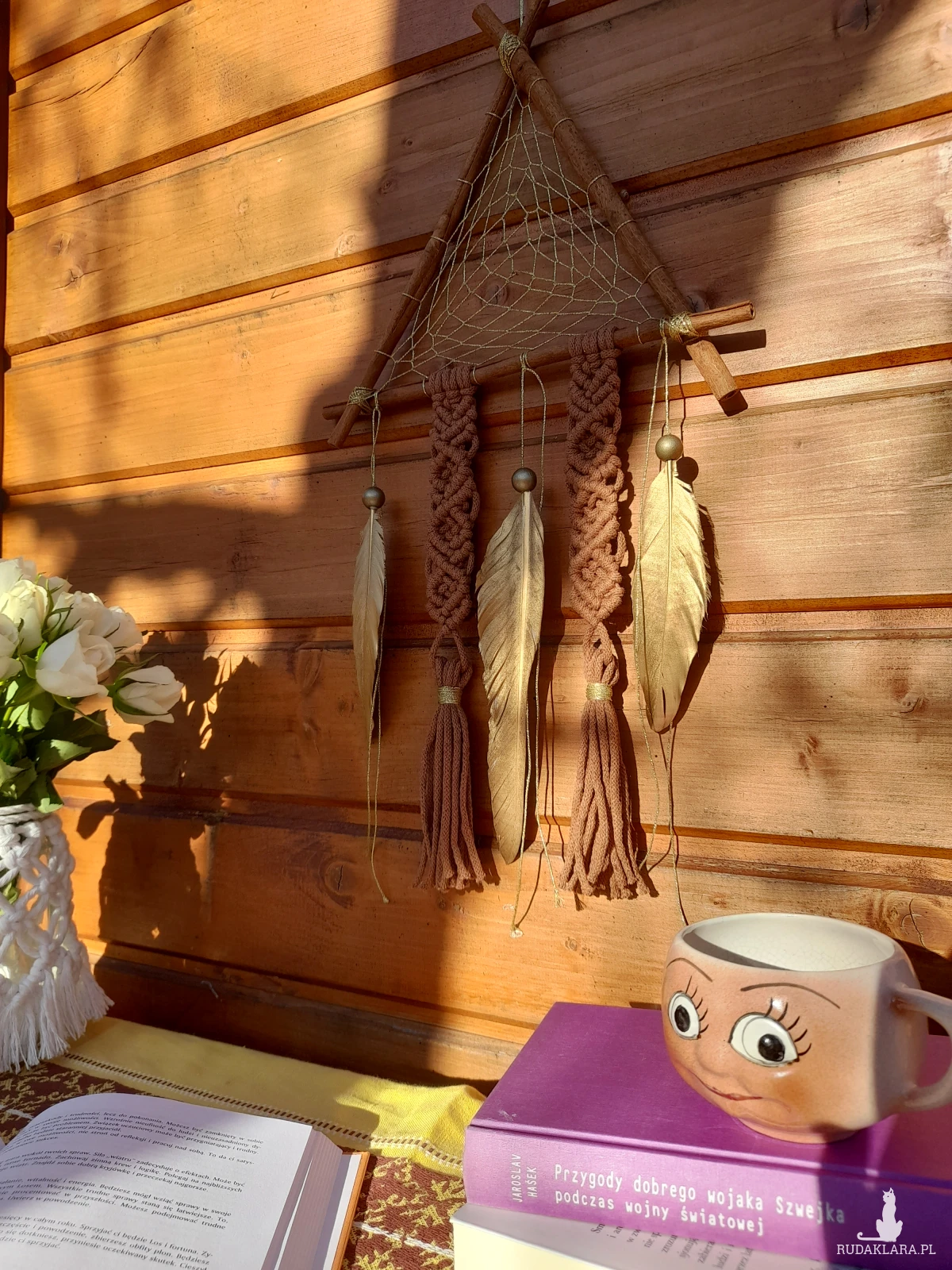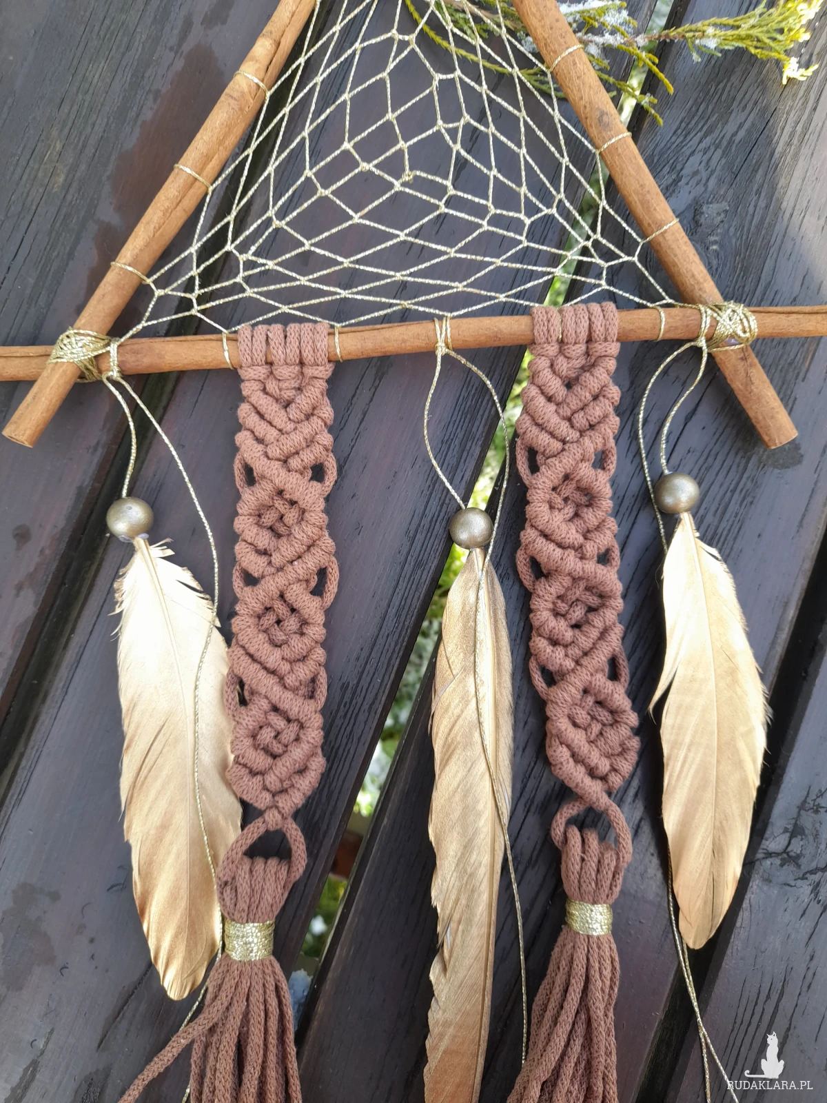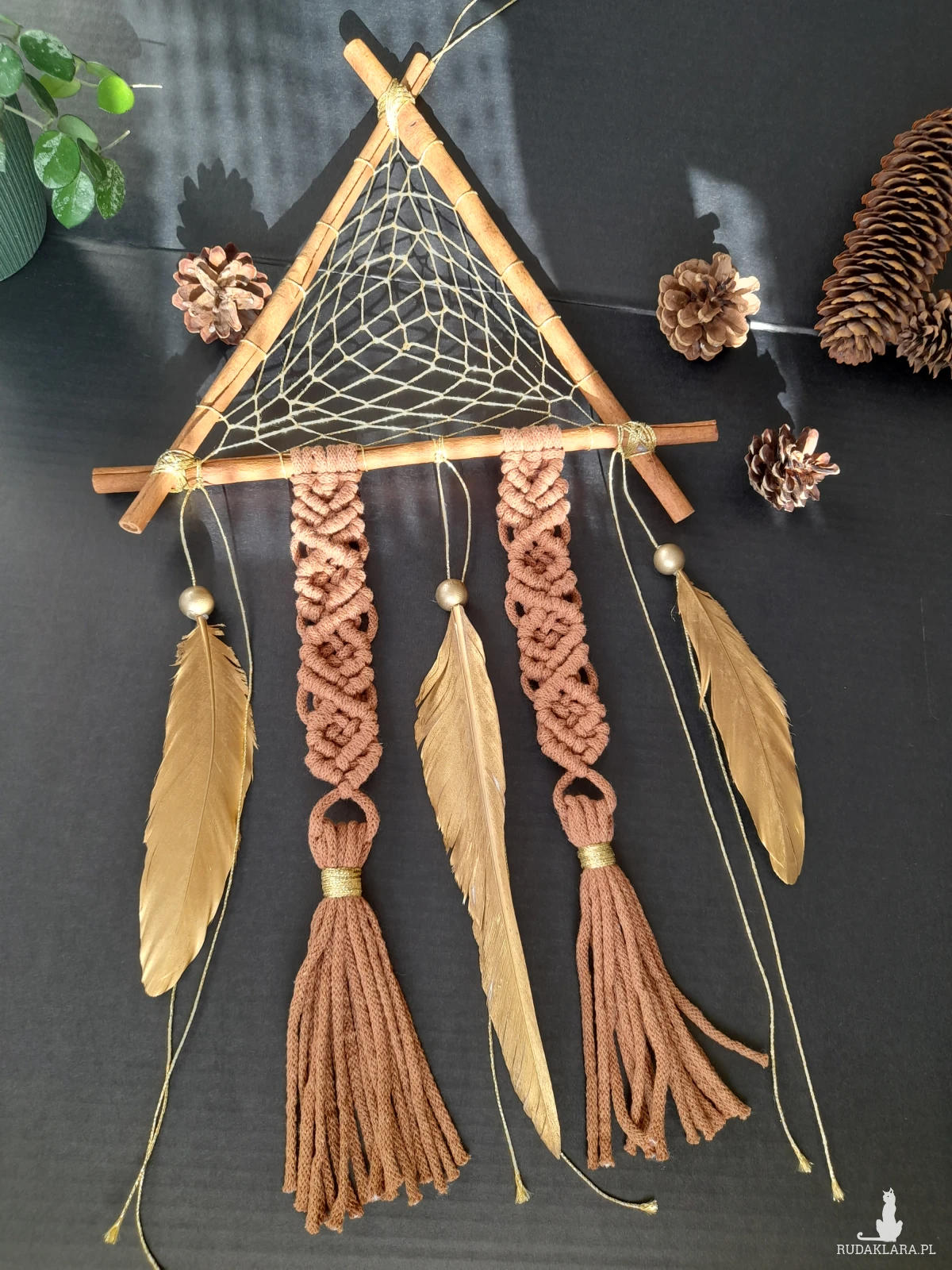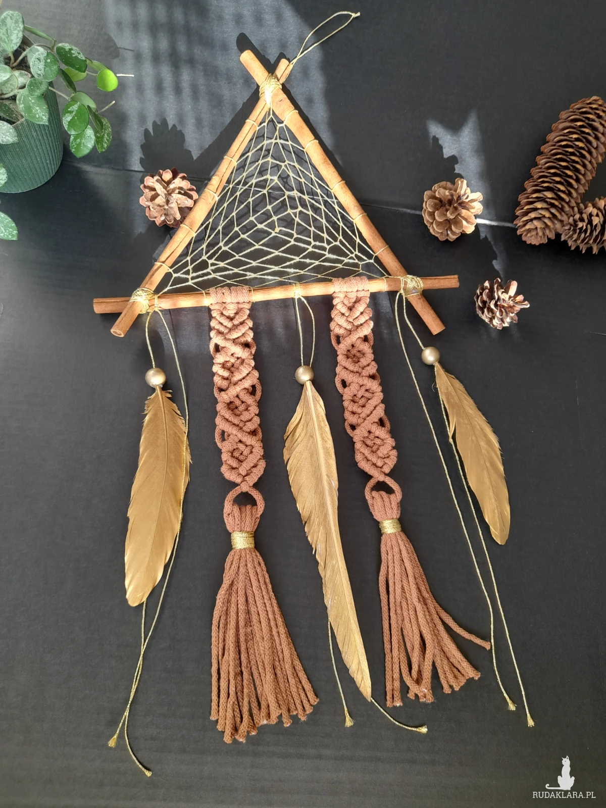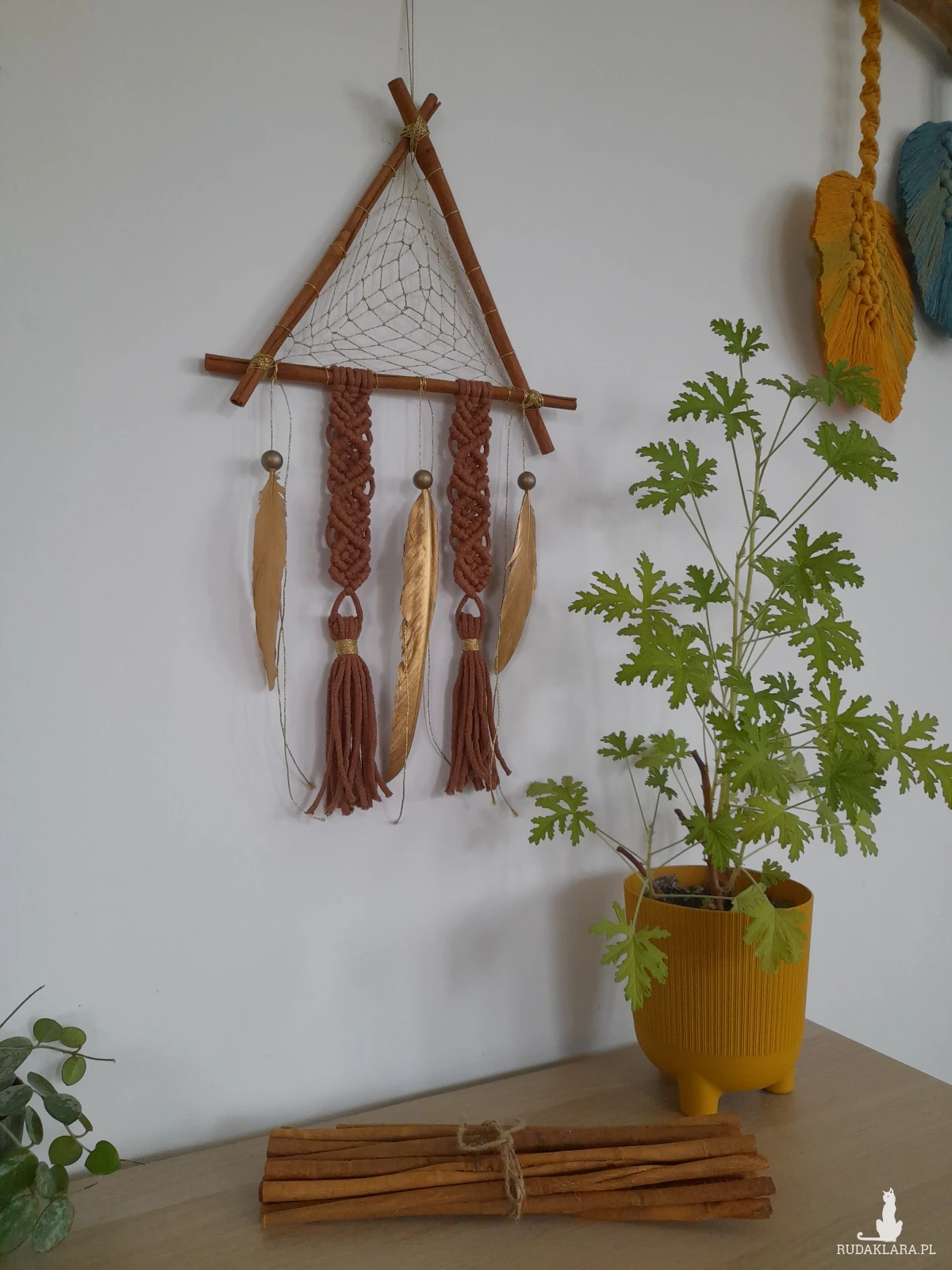 Ręcznie wykonany, trójkątny łapacz snów w stylu boho, który łączy w sobie naturalne laski cynamonu, makramowe sploty i złote piórka 🪶💛. To niezwykła dekoracja ścienna, która wniesie ciepło, urok i dobrą energię do każdego wnętrza 🌿.