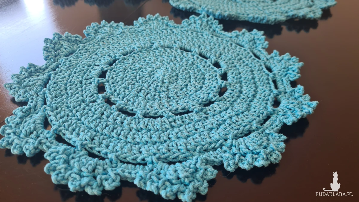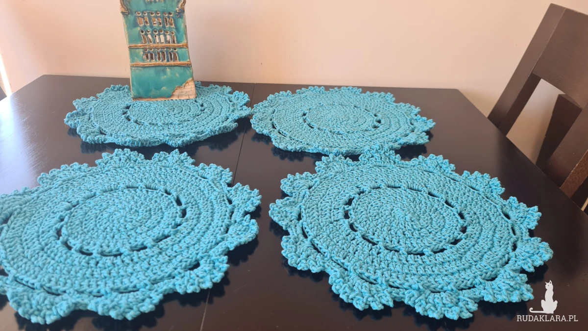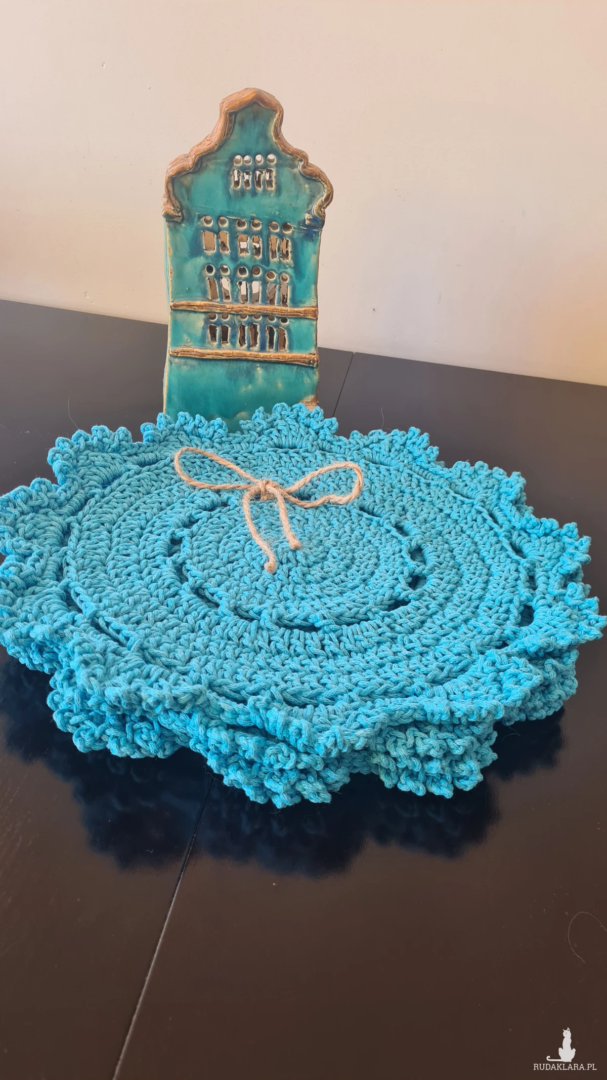 Podkładki na stół wykonane z wysokiej jakości sznurka bawełnianego. Średnica około 32 cm. Można prać w pralce i prasować.