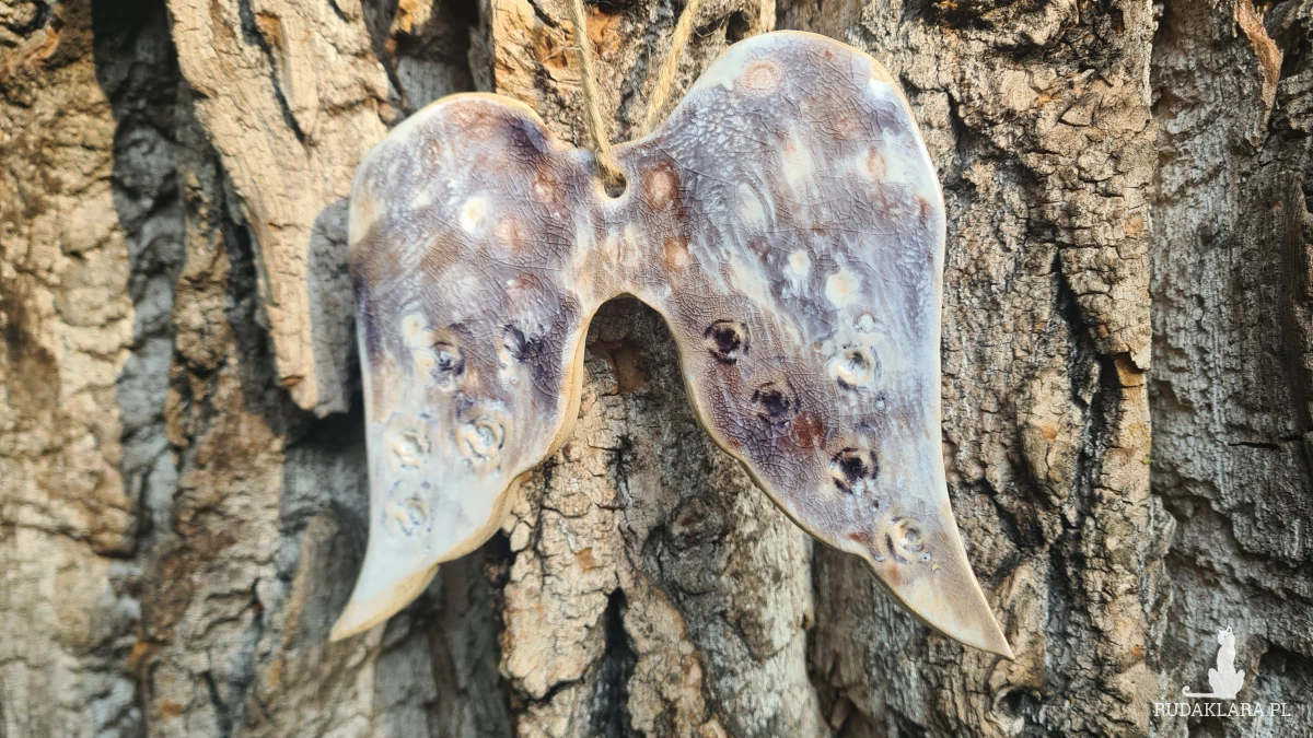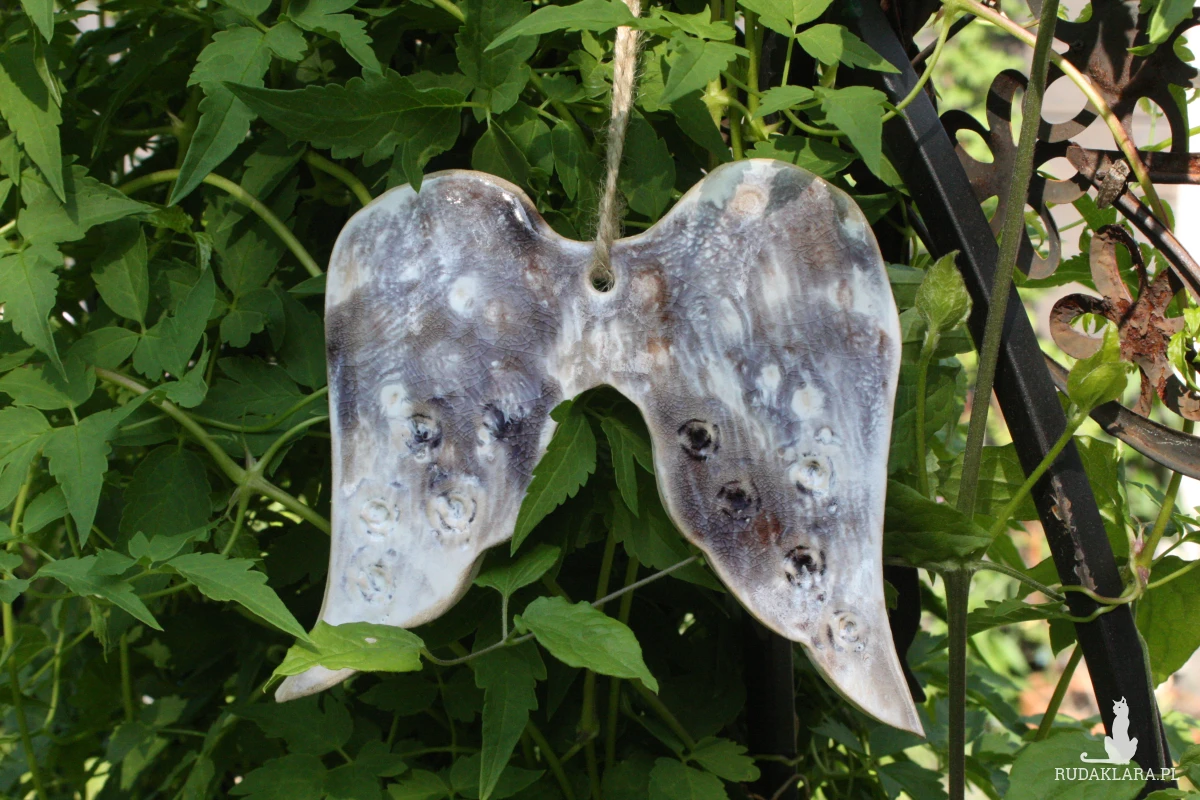 Ceramiczne skrzydła - zawieszka, wykonane z jasnej gliny, szkliwione i 2-krotnie wypalane w piecu ceramicznym w wysokiej temperaturze. Polecam, będą ozdobą Twojego ogrodu lub domu.