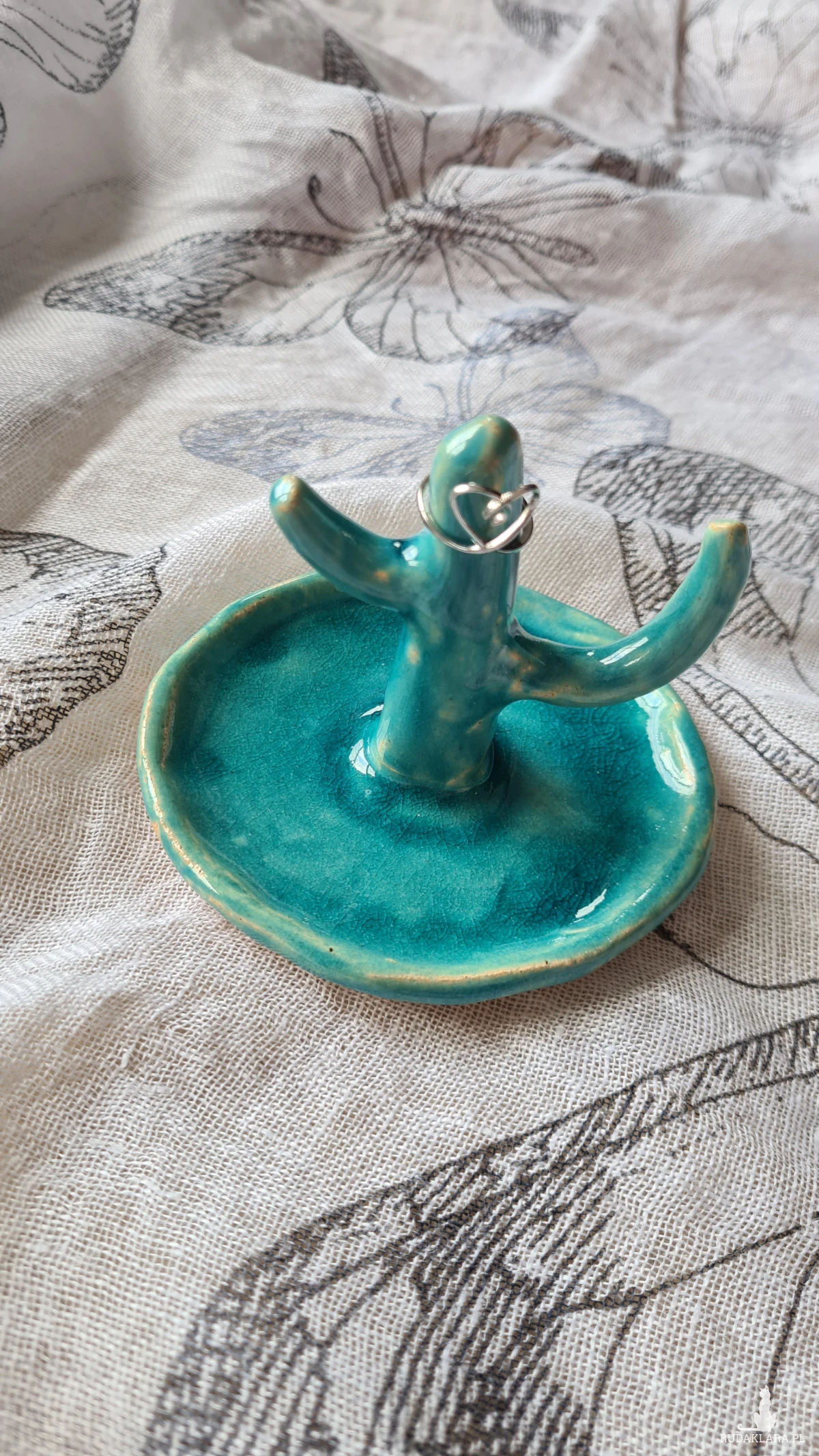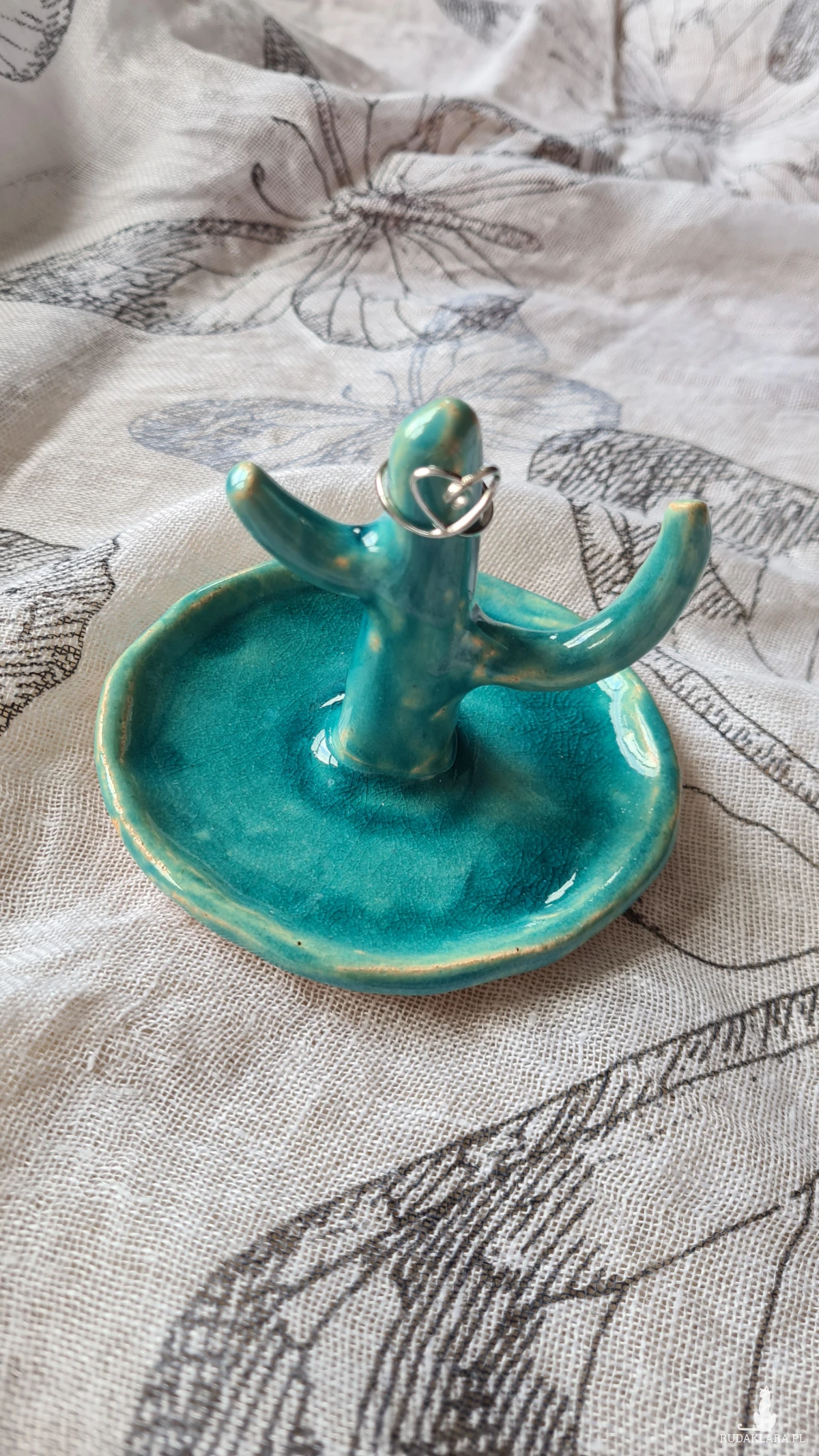 Ceramiczny kaktus na biżuterię w kolorze turkusowym. Wykonany z gliny szamotowej, szkliwiony i wypalany 2-krotnie w piecu ceramicznym. Wysokość 7 cm. Piękny prezent okazjonalny.