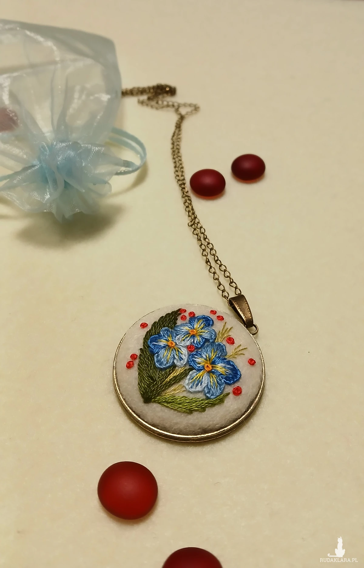 Perfekcyjnie dopracowany haft na filcu wykonałam polską bawełnianą muliną za pomocą igły. Jest on zabezpieczony impregnatem do tkanin ale po dłuższym użytkowaniu można go odświeżyć przy pomocy delikatnego mydła i letniej wody.