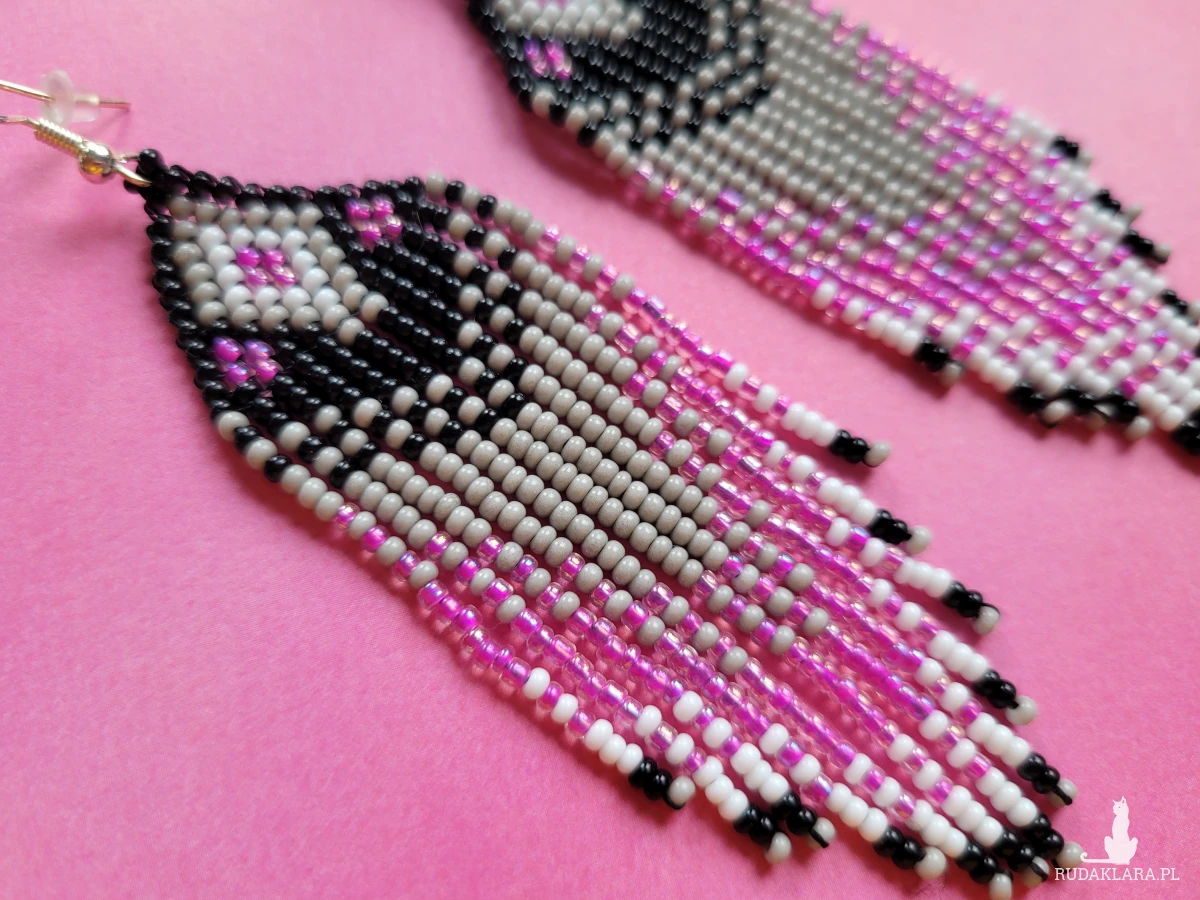 Kolczyki frędzle cieniowane szaro-różowe z motywem geometrycznym z koralików Preciosa