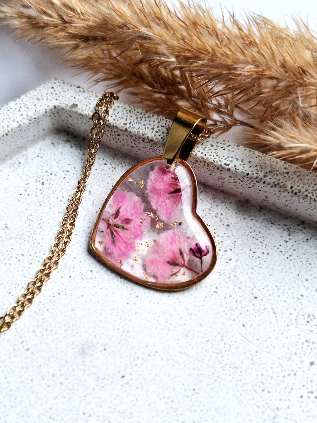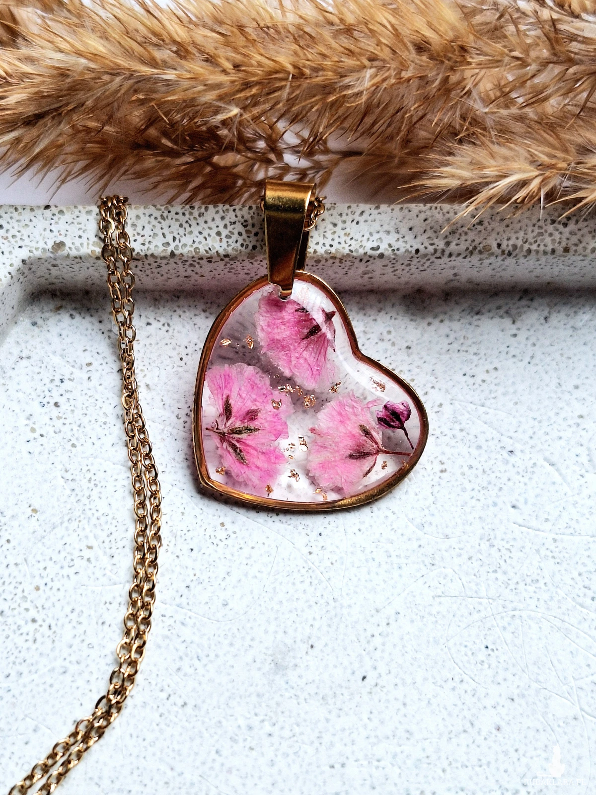Uroczy wisiorek w kształcie serca z zatopionymi kwiatami gipsówki i złotem. Wykonany z wysokiej klasy żywicy, która nie zmienia koloru pod wpływem promieniowania uv oraz wysokiej jakości stali chirurgicznej.