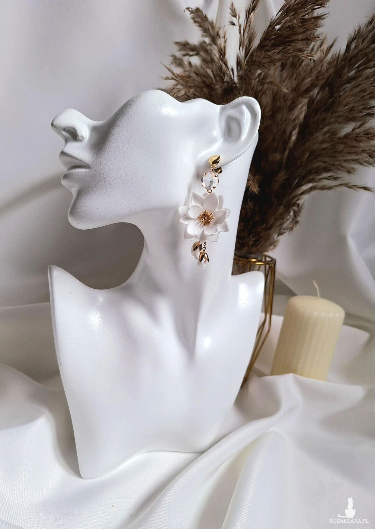 Długie wiszące kolczyki kwiaty w białym kolorze.