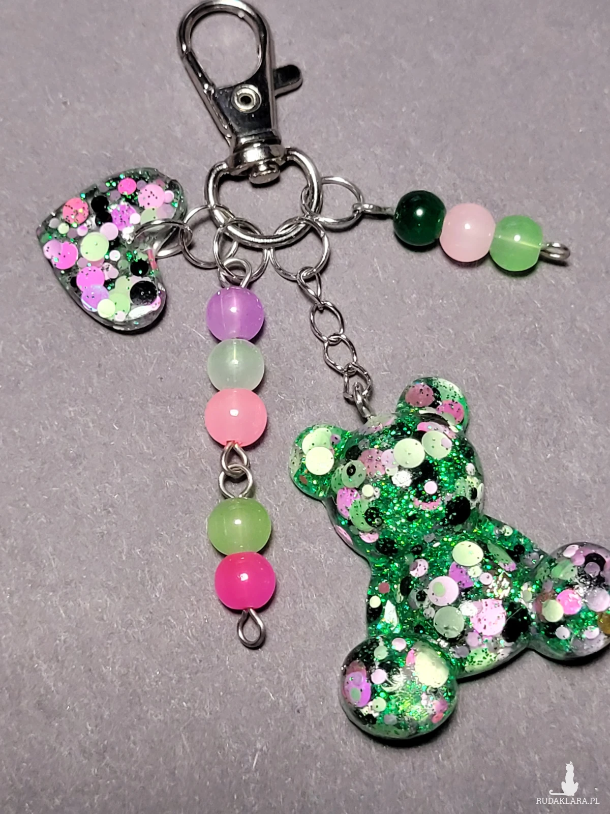 Brelok zawieszka zielony z Misiem i sercem z żywicy do kluczy, torebki, plecaka