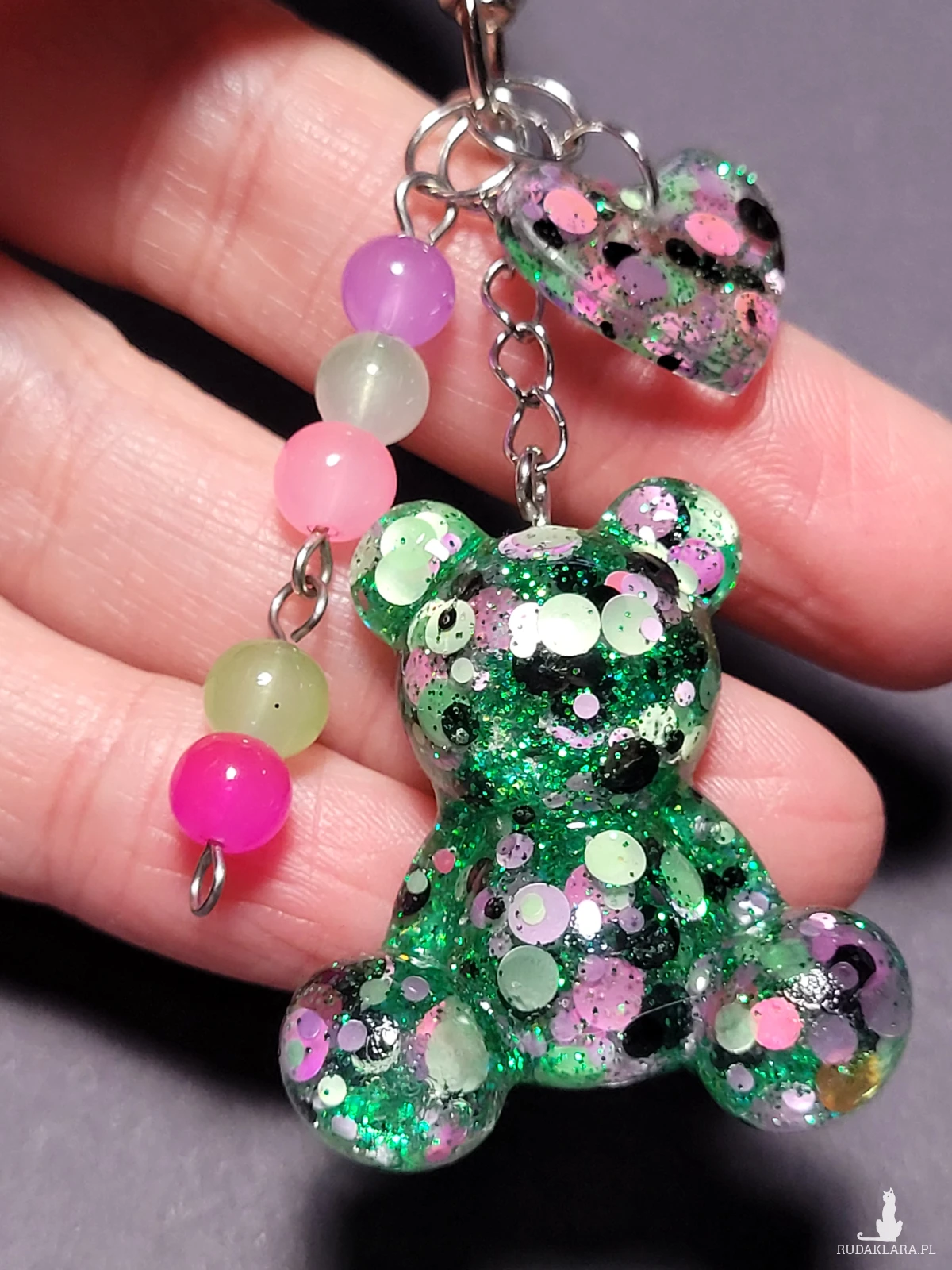 Brelok z Misiem i sercem, którego główne elementy są ręcznie zrobione z żywicy epoksydowej z dodaniem brokatów i cekinów, ręcznie wykonany z koralików szklanych.