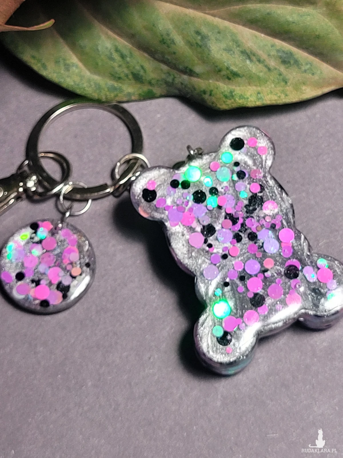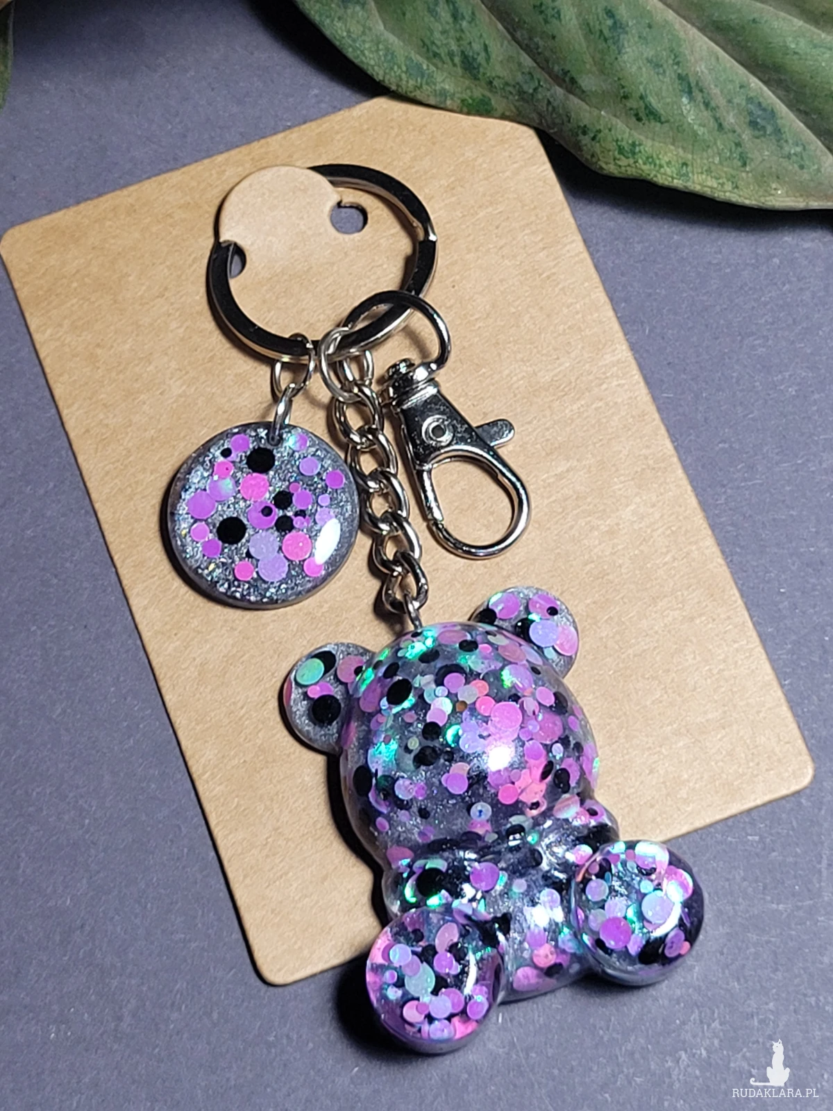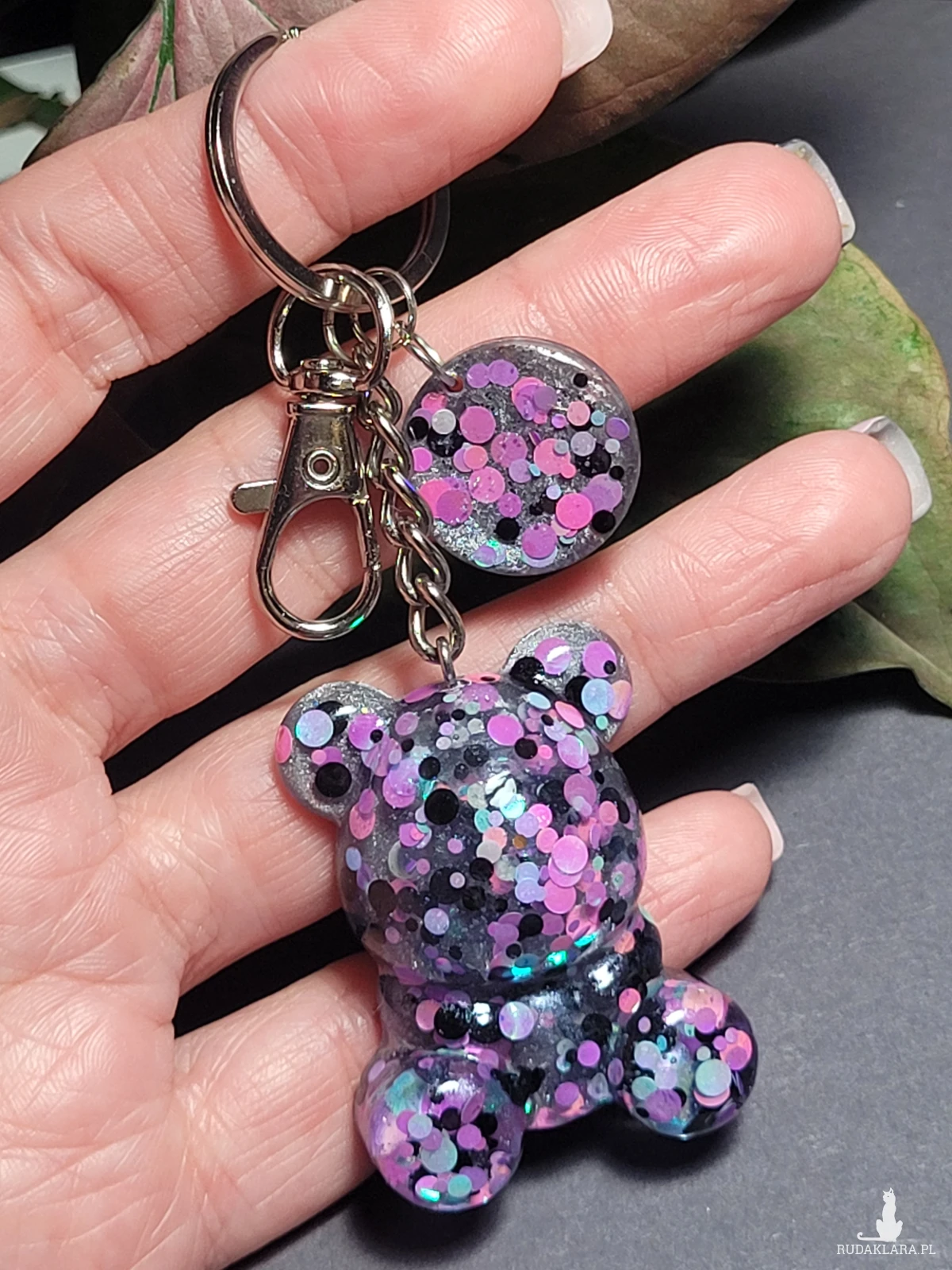 Brelok fioletowy z Misiem i kołkiem, którego główne elementy są ręcznie zrobione z żywicy epoksydowej z dodaniem brokatów i cekinów, ręcznie wykonany z koralików szklanych.