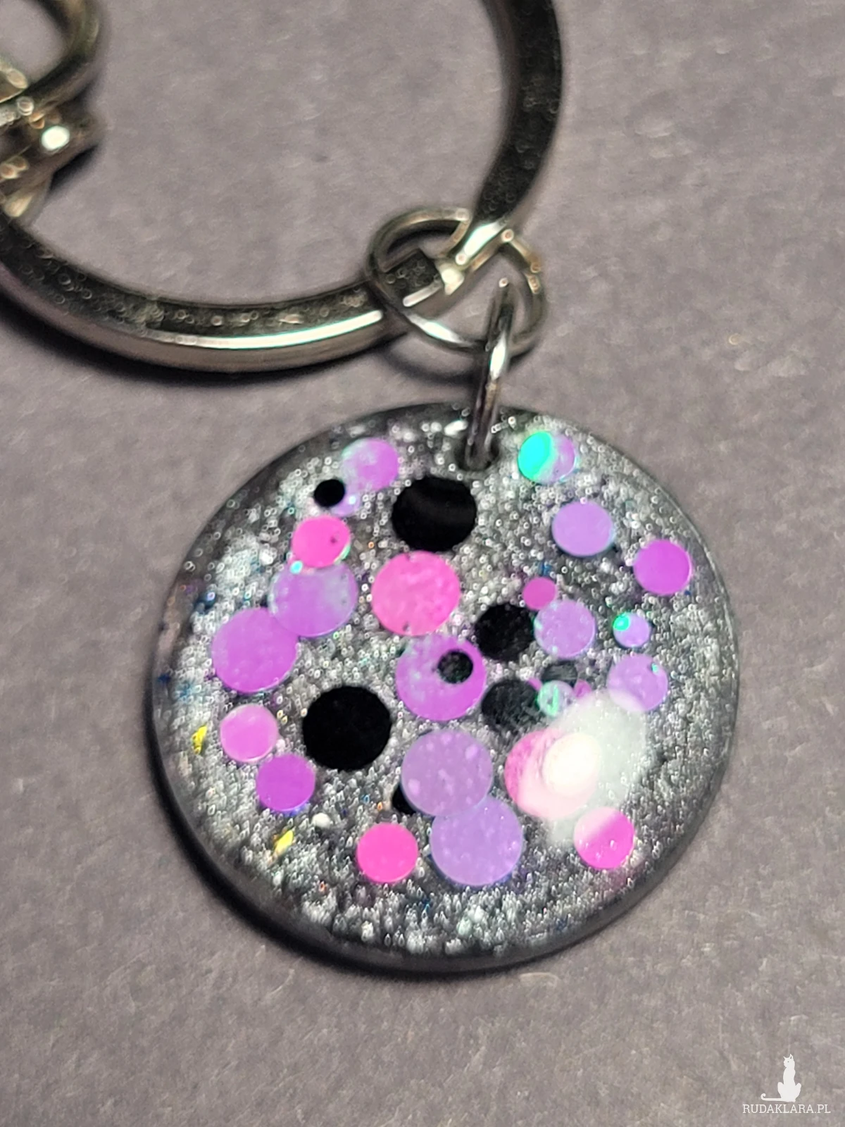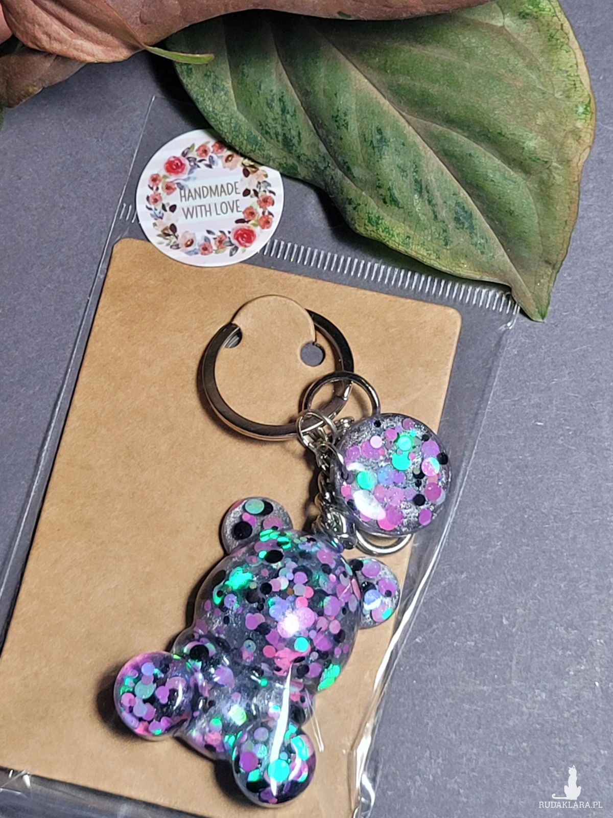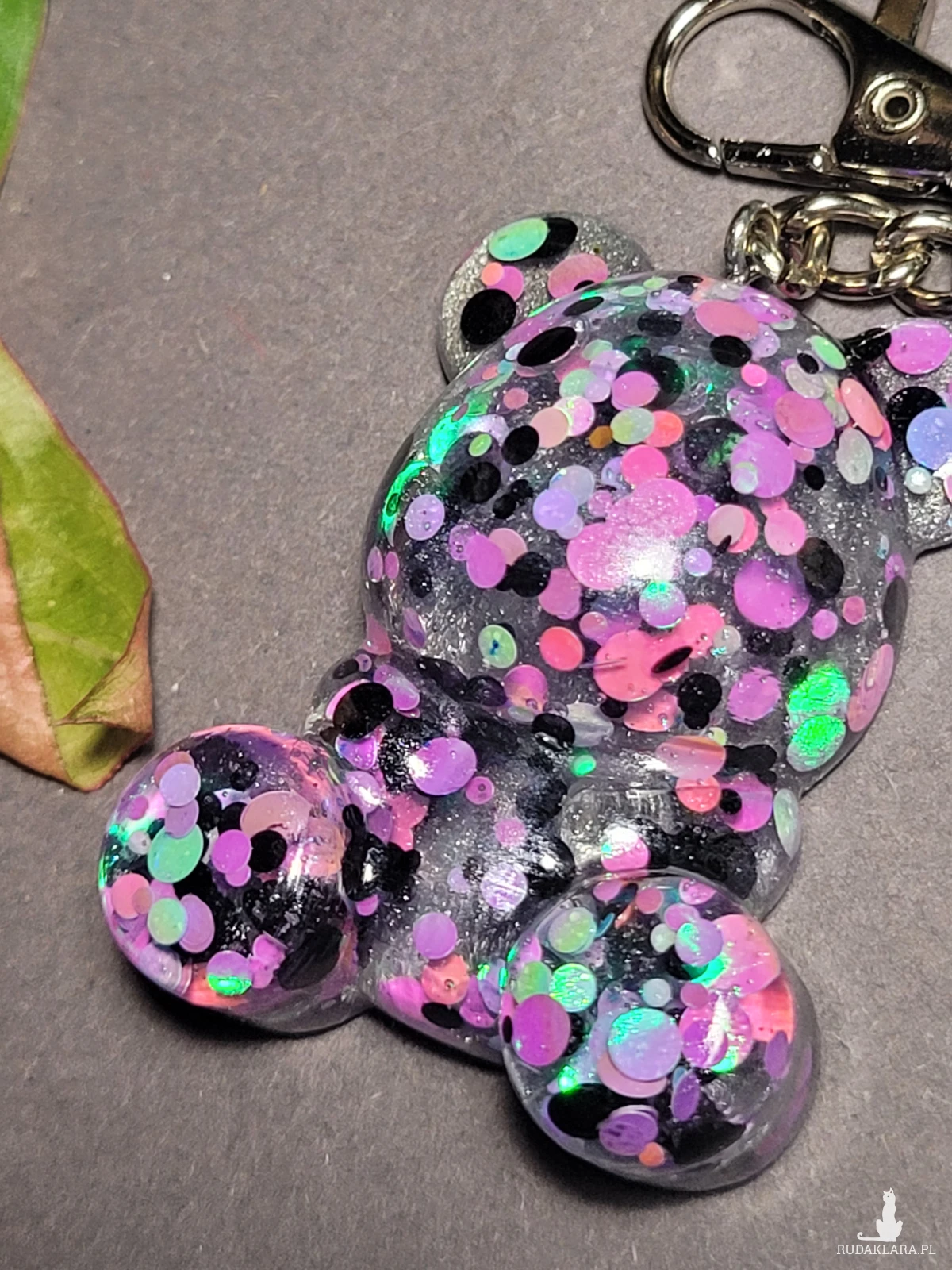 Brelok fioletowy z Misiem i kołkiem, którego główne elementy są ręcznie zrobione z żywicy epoksydowej z dodaniem brokatów i cekinów, ręcznie wykonany z koralików szklanych.