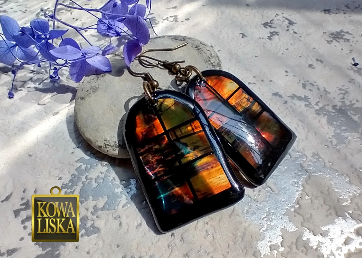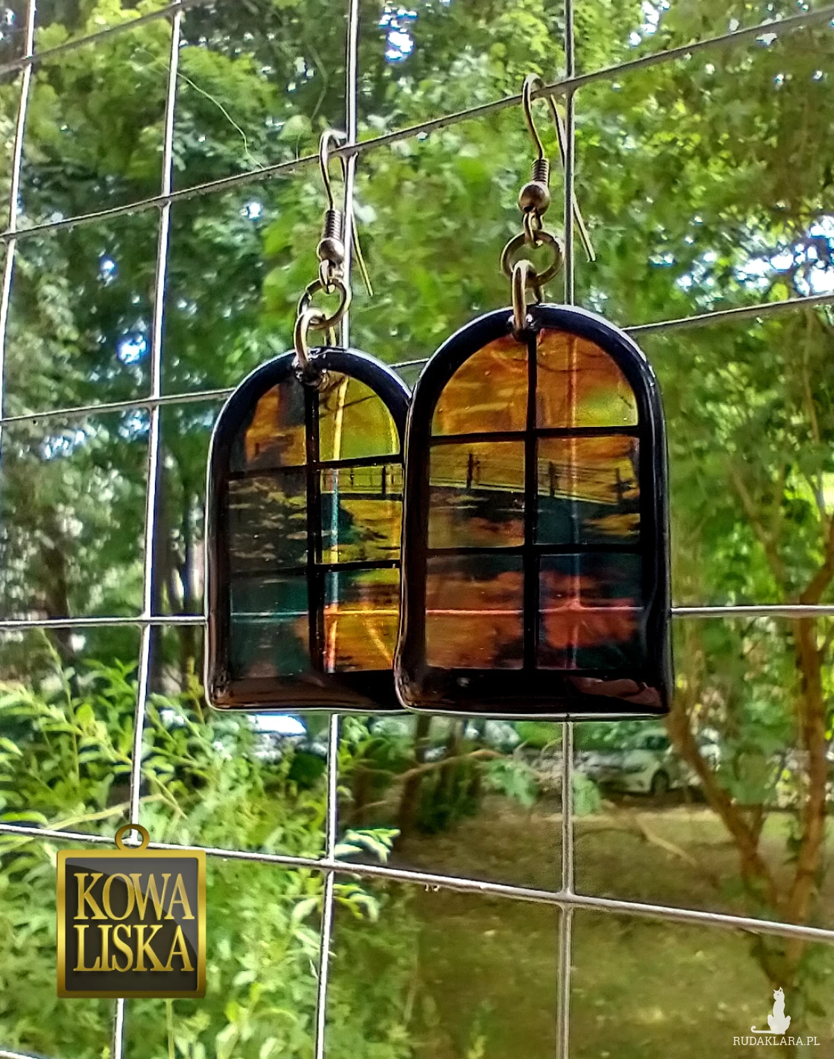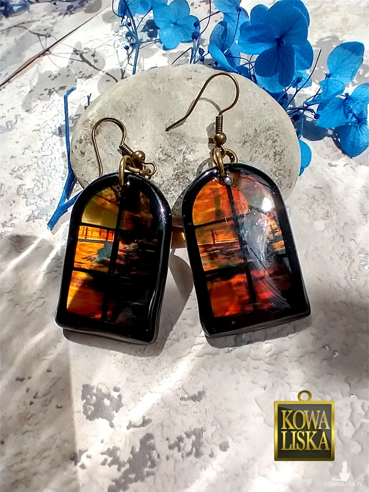 Ciemnobursztynowy, przejrzysty pejzażyk zamknięty w obramowaniu czarnej, okiennej framugi. Ciekawe, błyszczące, utrzymane w ciemnej tonacji efektowne kolczyki.
