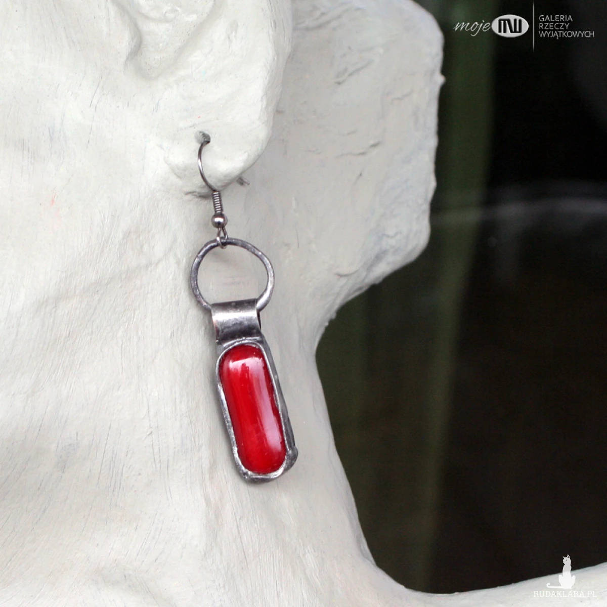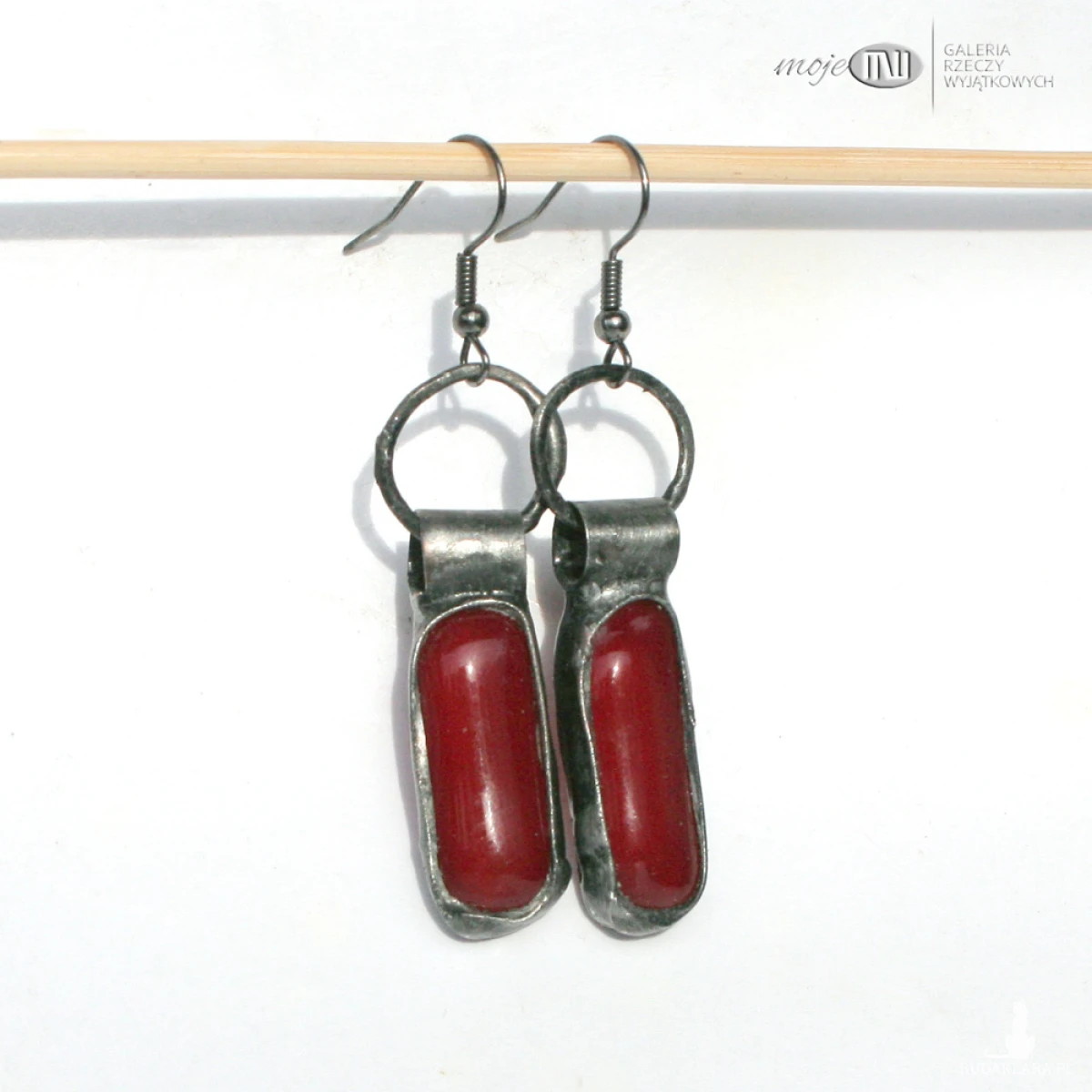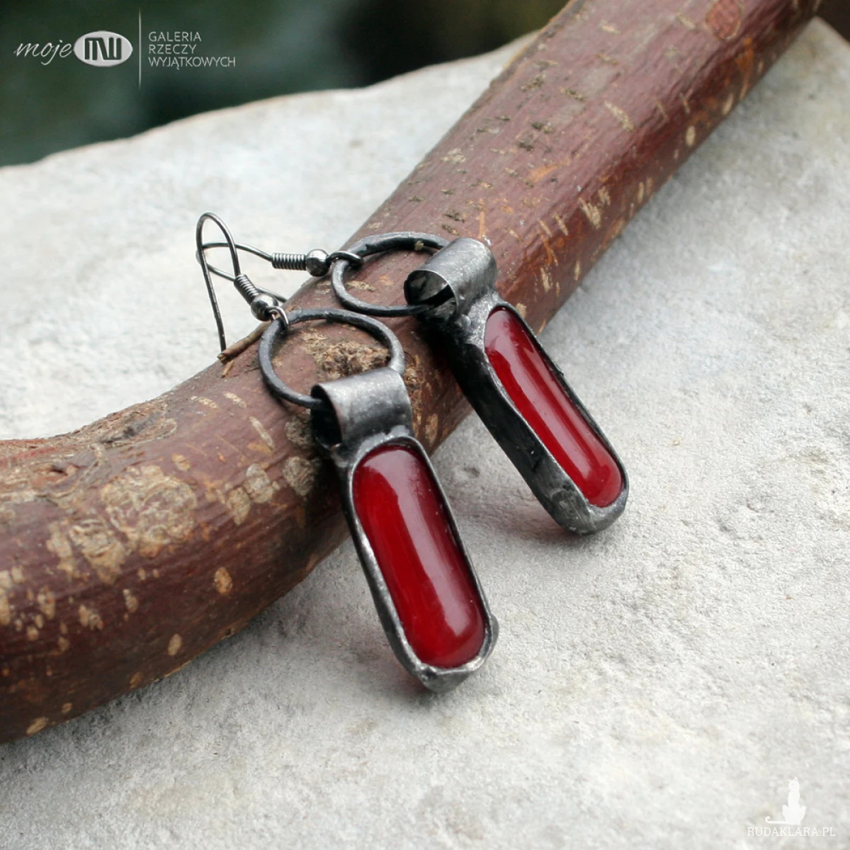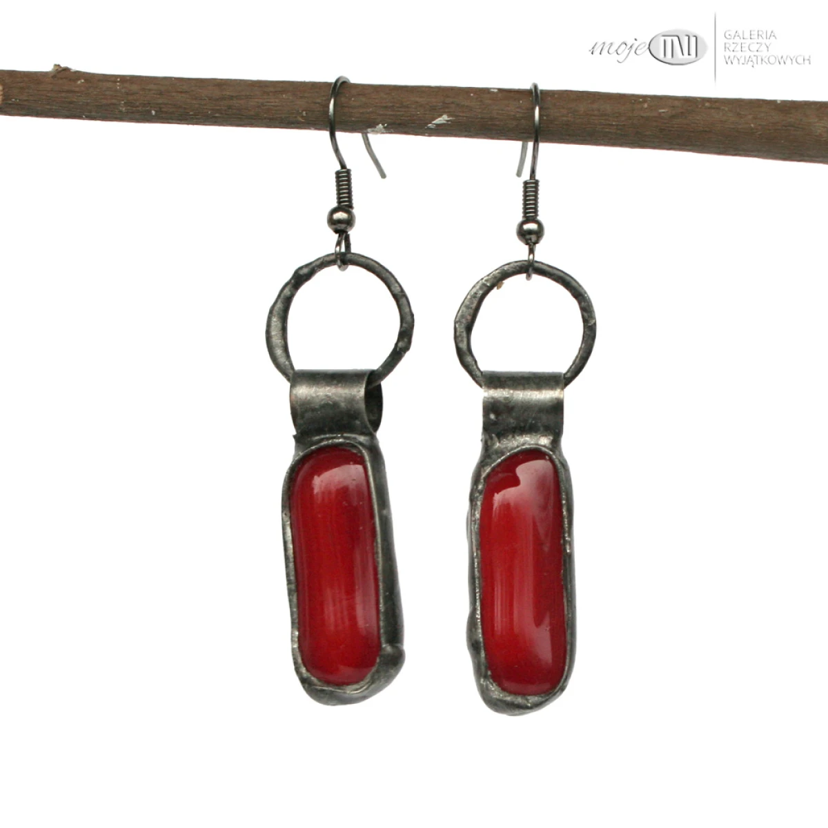 Kolczyki z ciemnoczerwonego szklanego, podłużnego paluszka, wytopionego przeze mnie metodą fusingu w temperaturze min. 800 stopni. Szkło oprawione jest w miedź - cynowaną, patynowaną i przecieraną.