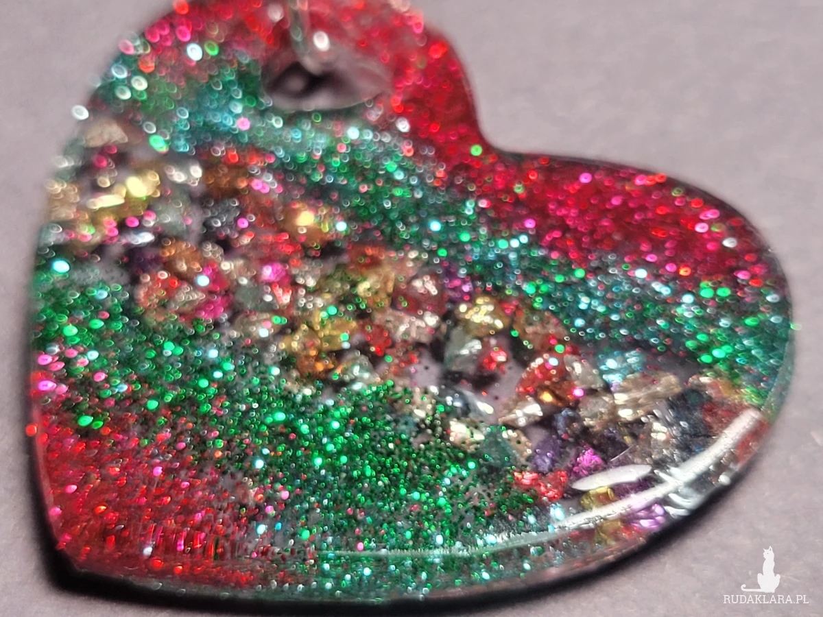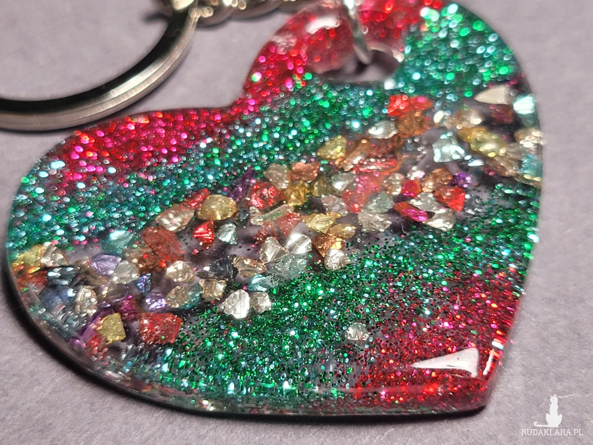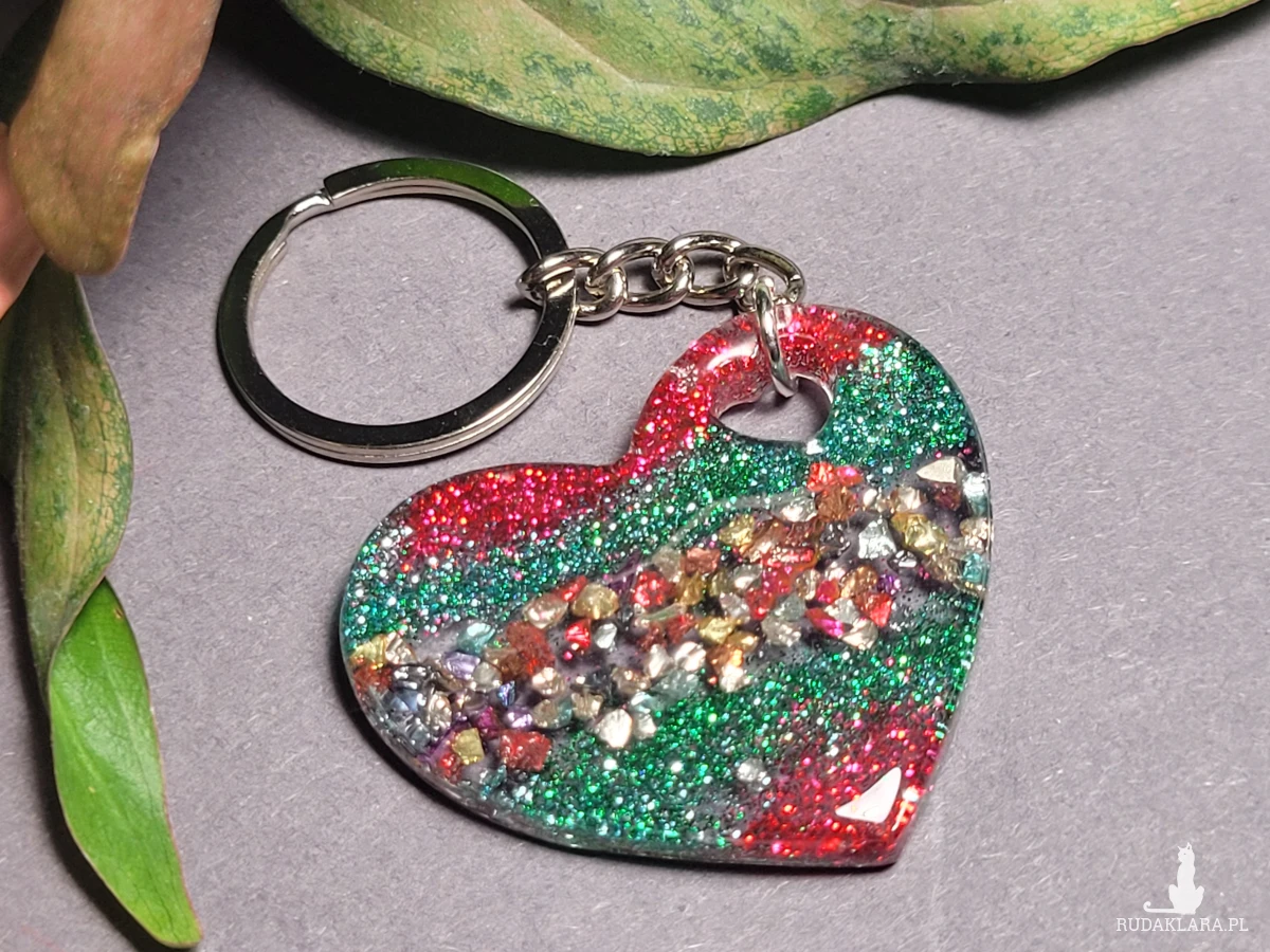 Brelok zawieszka "Serce" z brokatem czerwonych i zielonych odcieni zrobiony własnoręcznie z żywicy to subtelny miły dodatek do kluczy lub torebki.