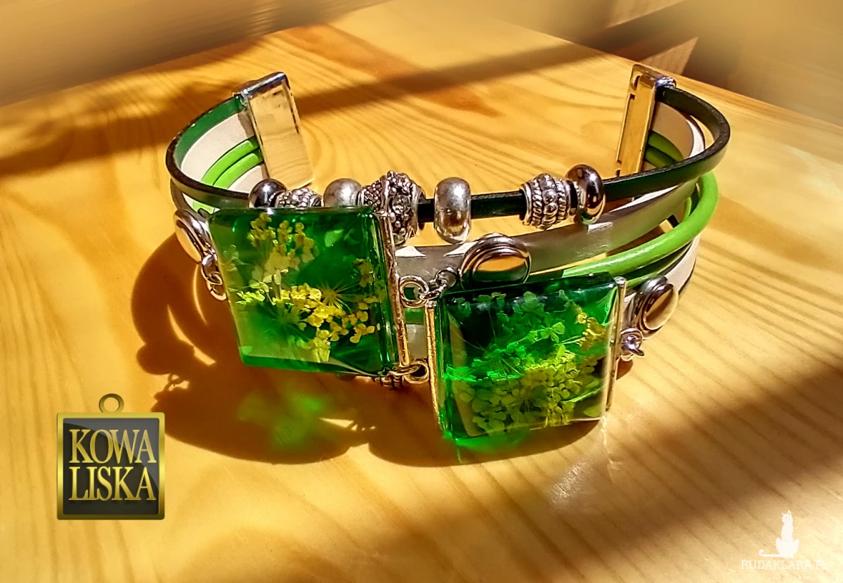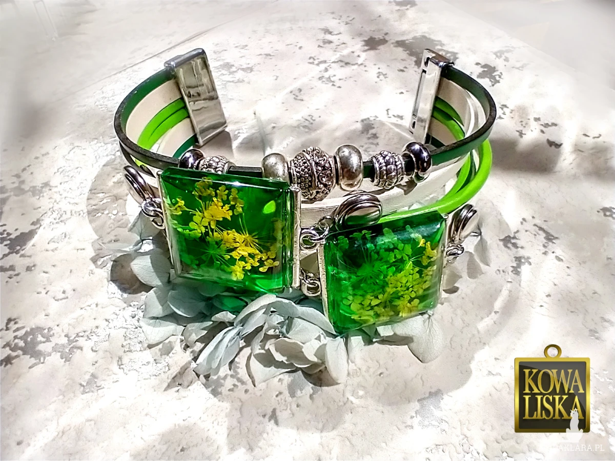 Ciężkość rzemieni i metalu pięknie się uzupełnia z eterycznością żywicy i kwiatów. Bransoleta pięknie odbija światło, jest widoczna z daleka. Srebrzyste przekładki nadają charakteru i blasku - można je dowolnie przesuwać i układać po swojemu.