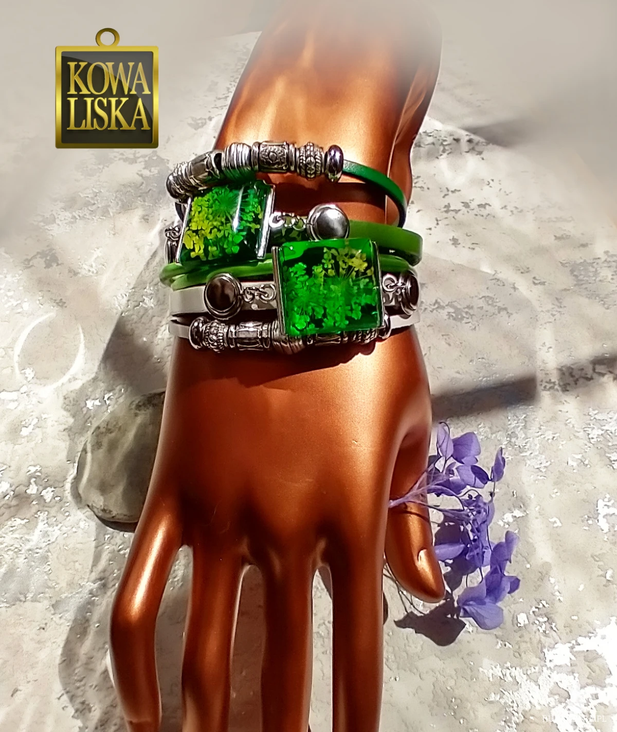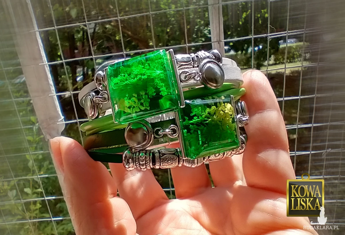 Efektowna, asymetryczna bransoleta, której centralnym elementem są zielone kwadraty z zatopionymi kwiatami, zamontowane na skórzanych pasach.