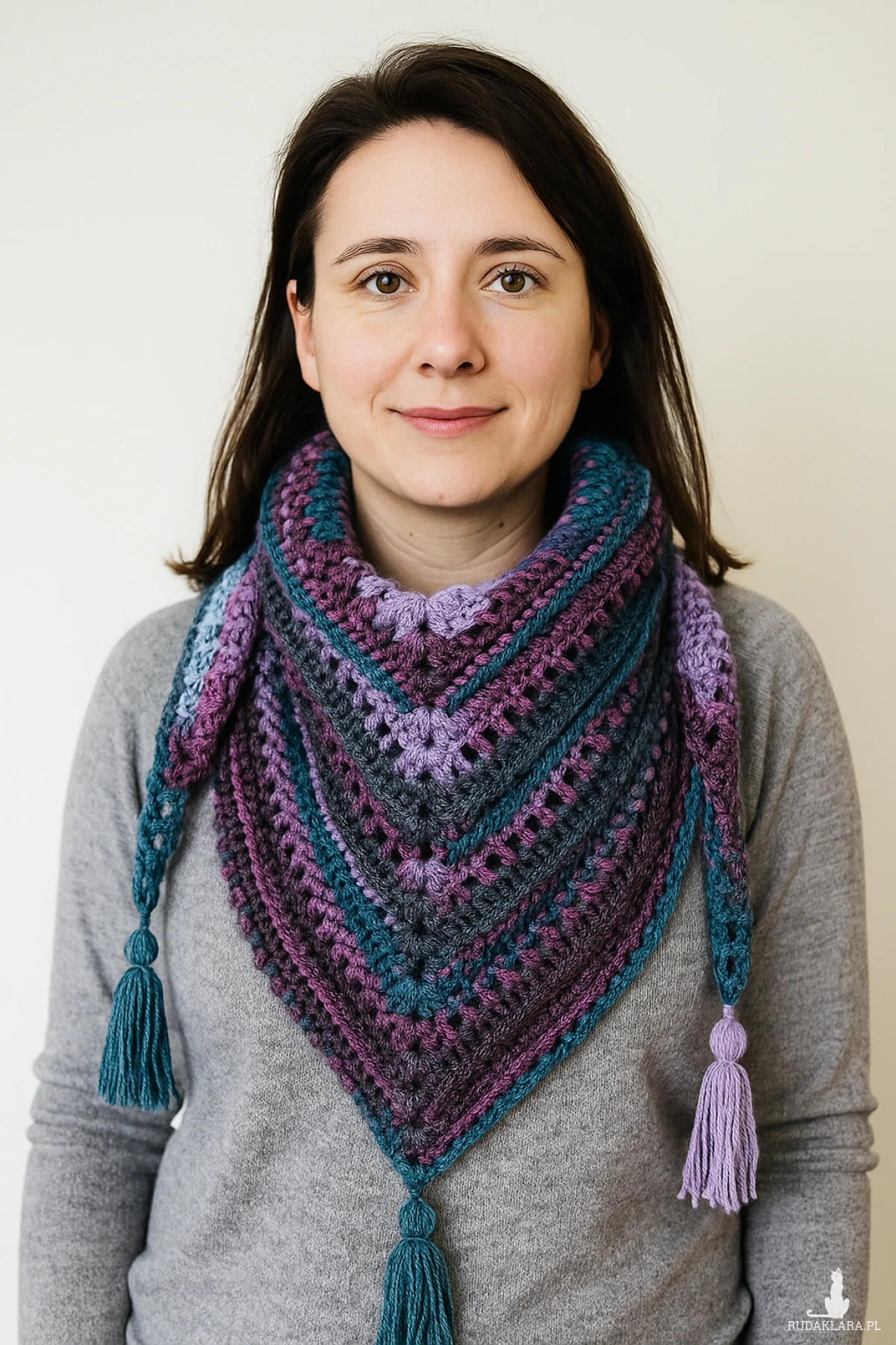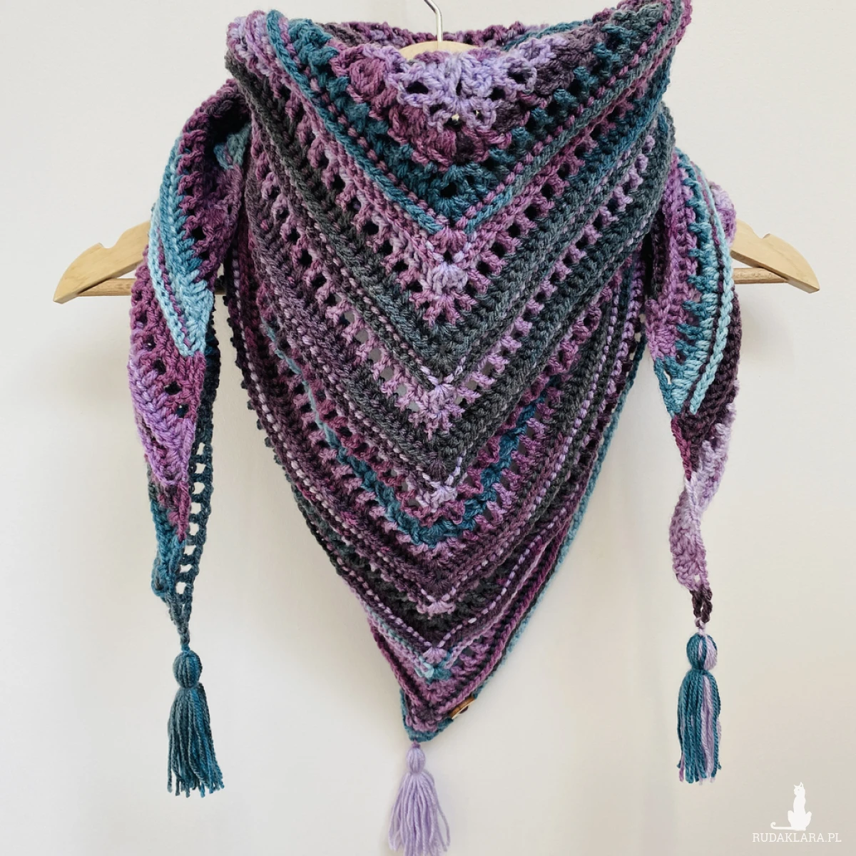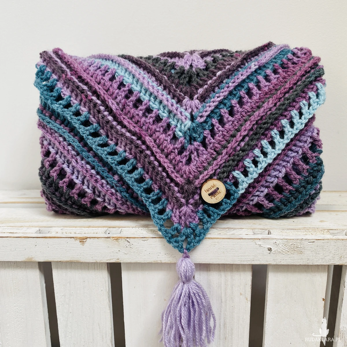 Chustę wykonałam na szydełku z miękkiej włóczki akrylowej, która zachwyca intensywnością koloru i delikatnością. Certyfikat OEKO-TEX® Standard 100 potwierdza, że jest bezpieczna dla a zdrowia materiały użyte do jej produkcji są wolne od szkodliwych substancji chemicznych.
