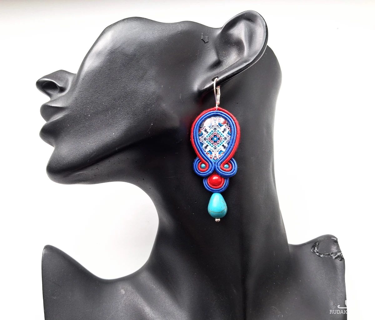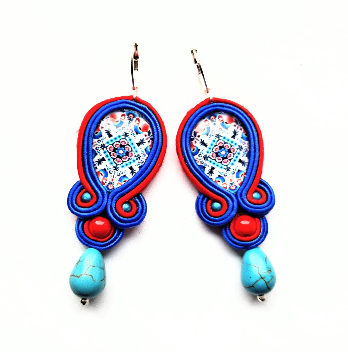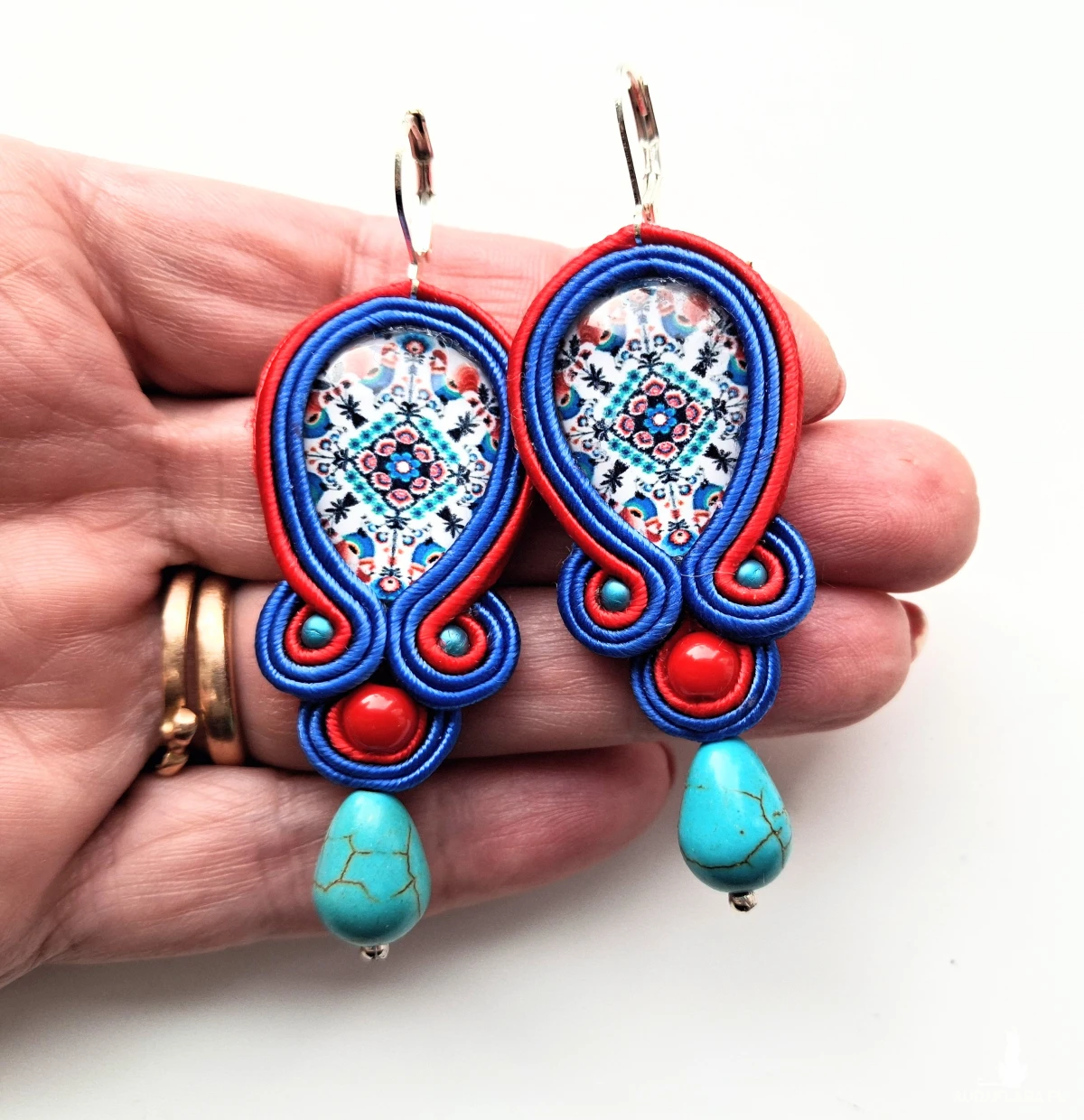 Materiał: turkusowy howlit, sutasz, koraliki szklane, kaboszon z wzorem tradycyjnej polskiej wycinanki
