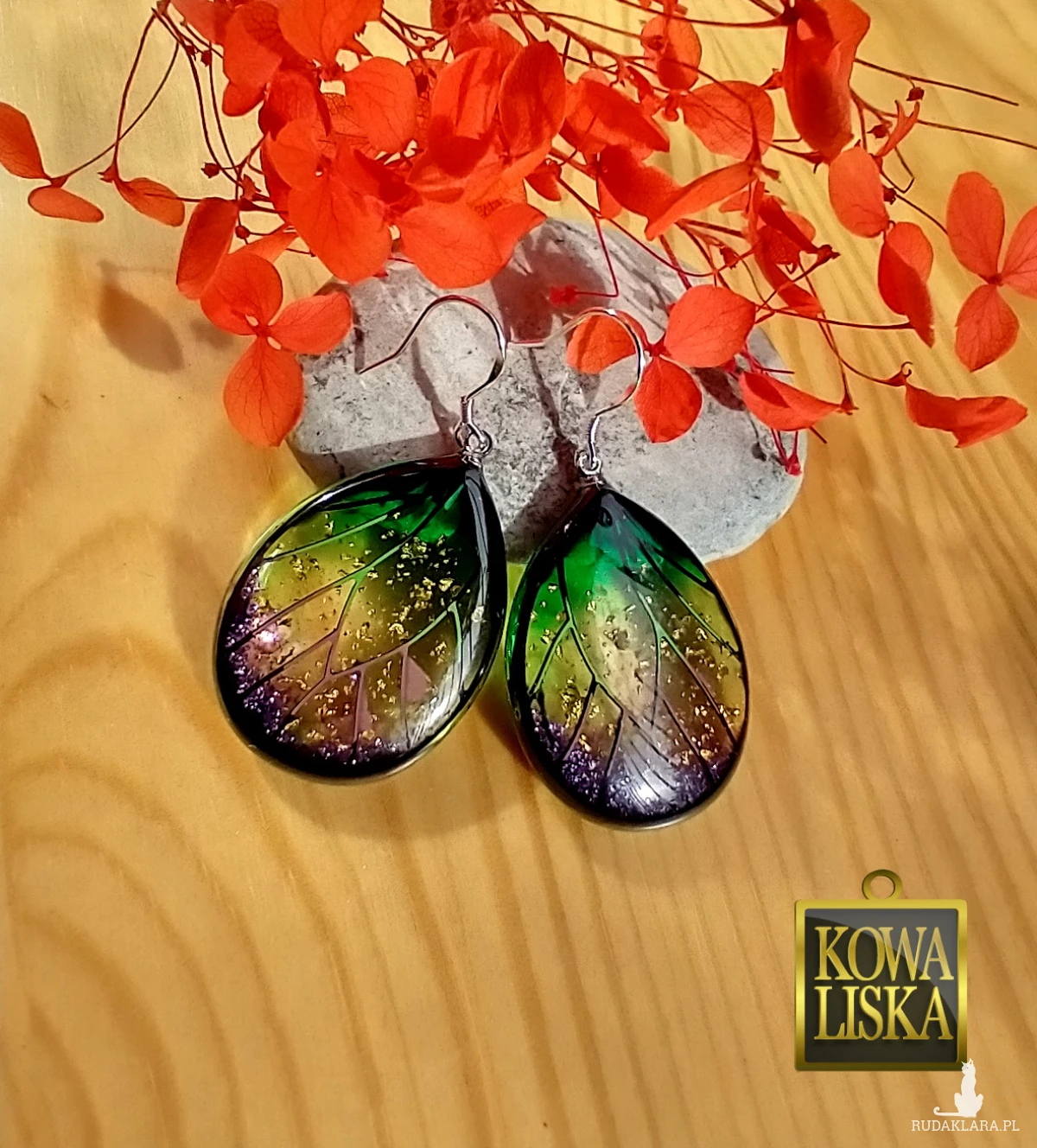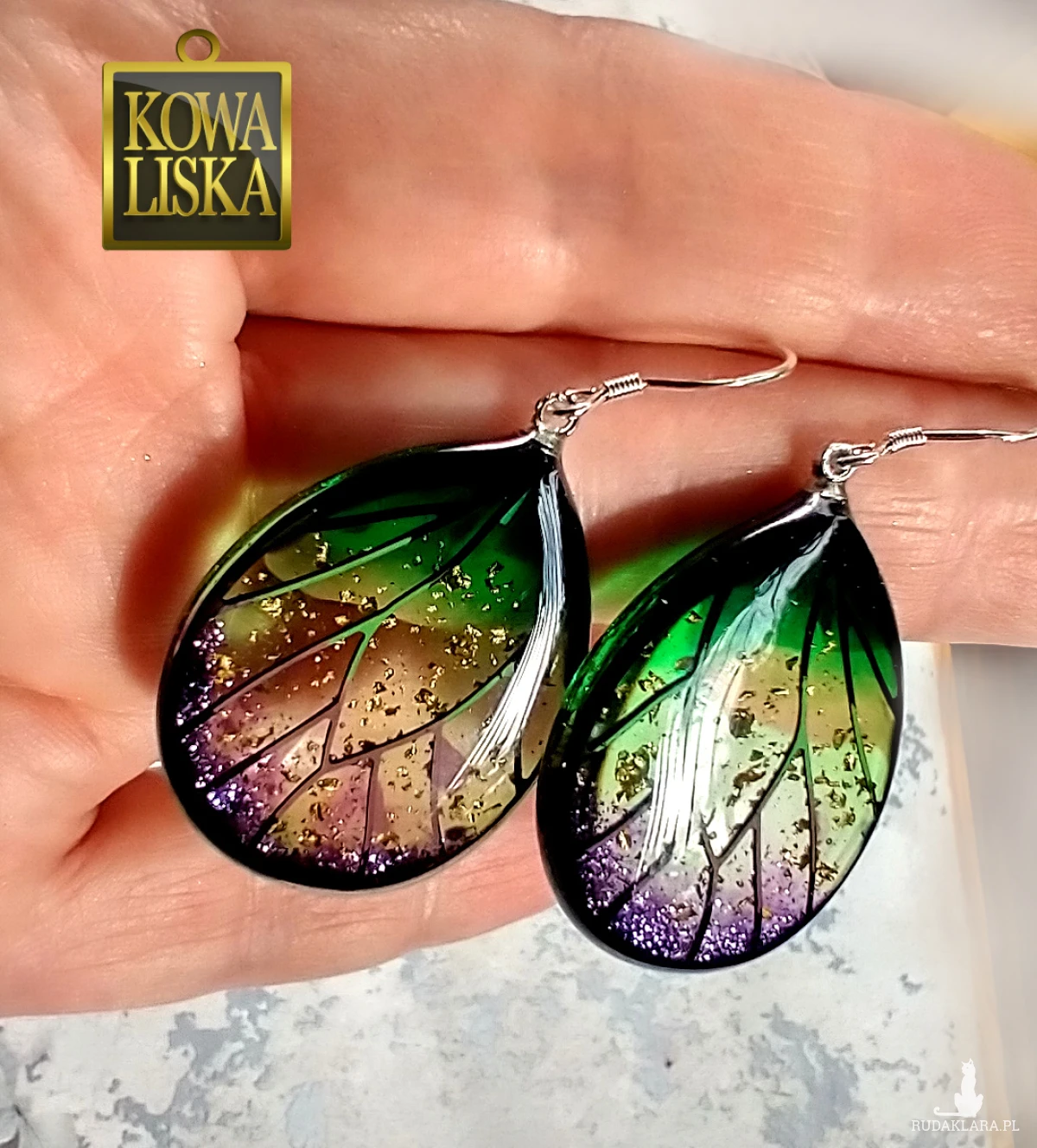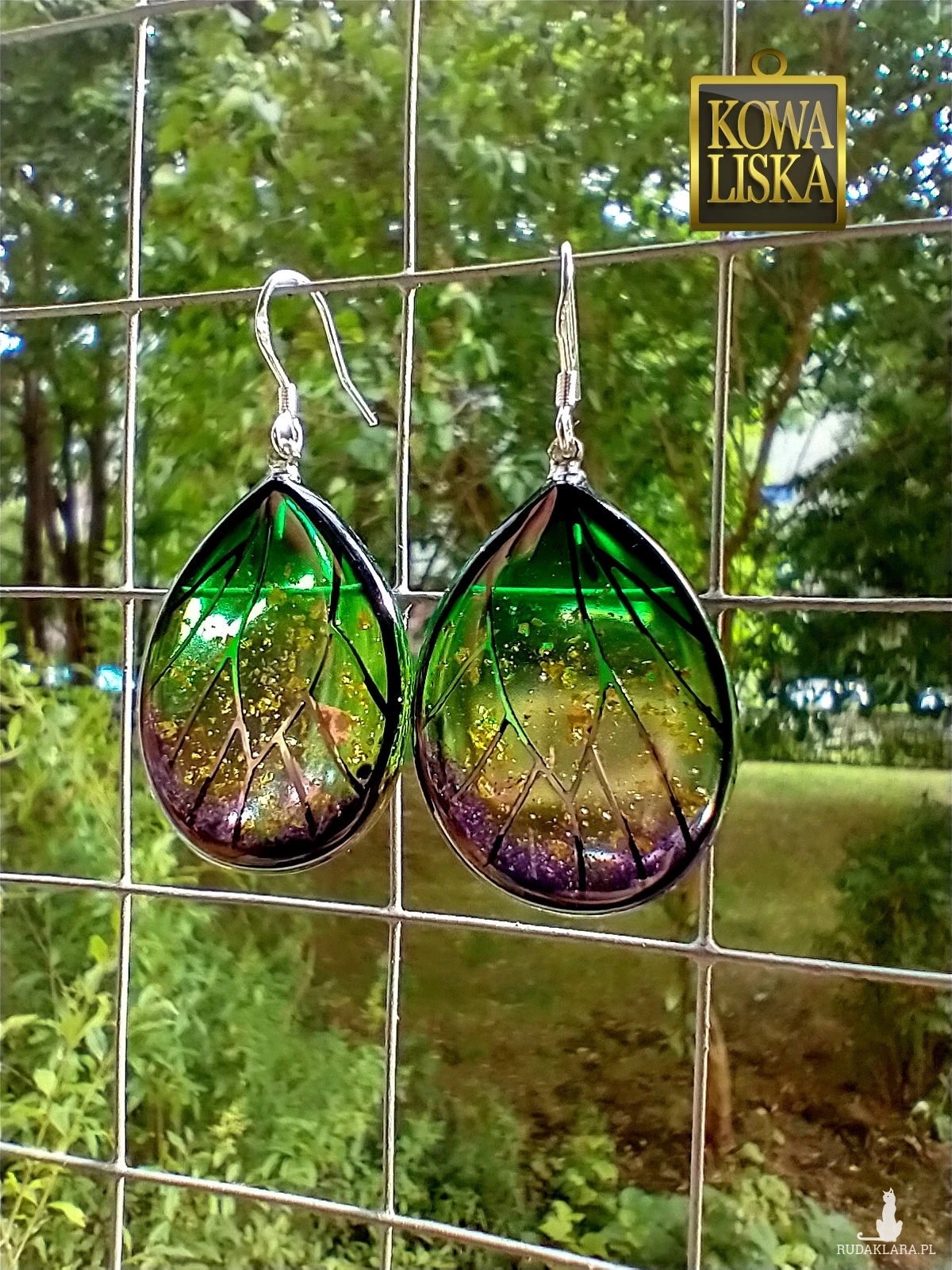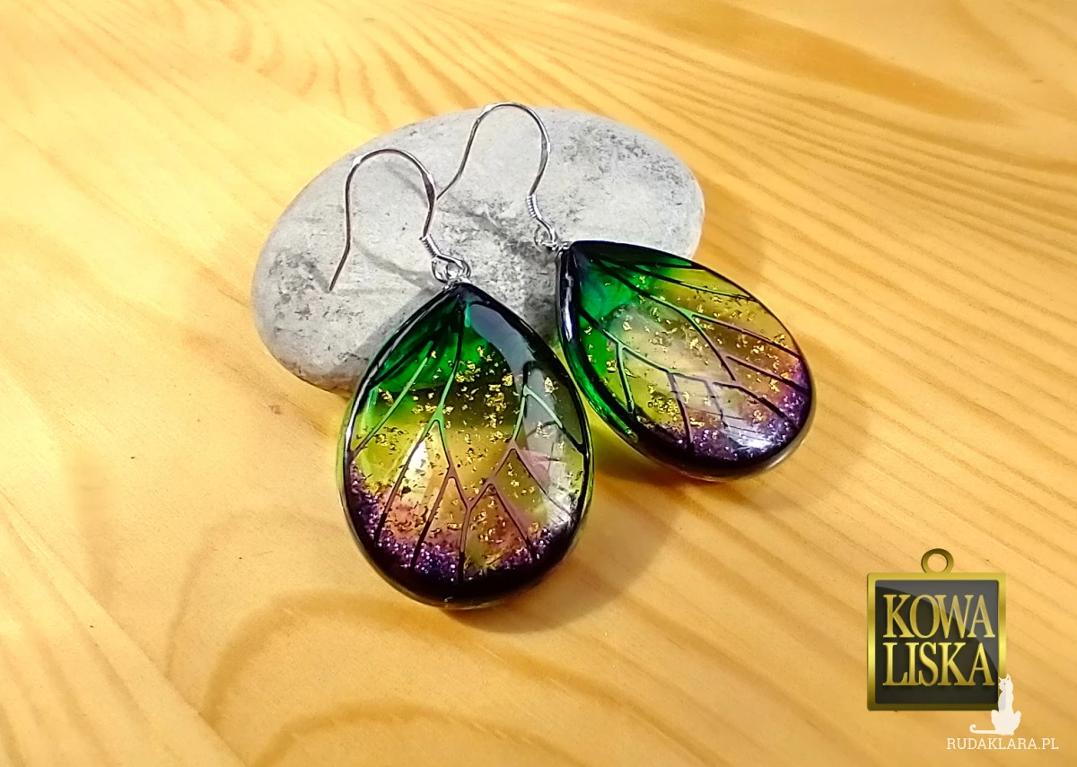 Lśniące fioletowo-zielonym blaskiem skrzydła motyla przepięknie podkreślą Twoją urodę, zarówno w ciepłe, słoneczne dni, jak i podczas wieczornego wyjścia. Złote żyłowania mienią się w słońcu... Skuś się...
