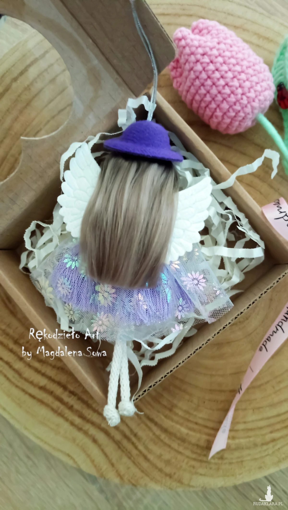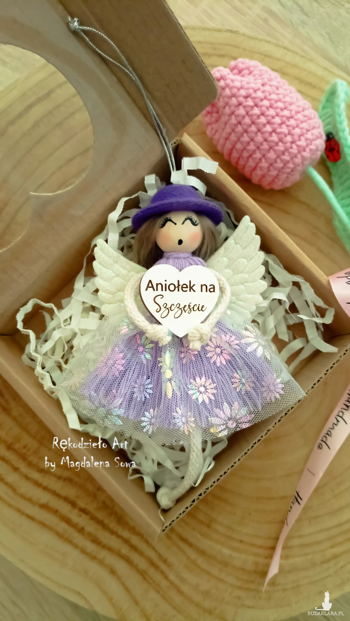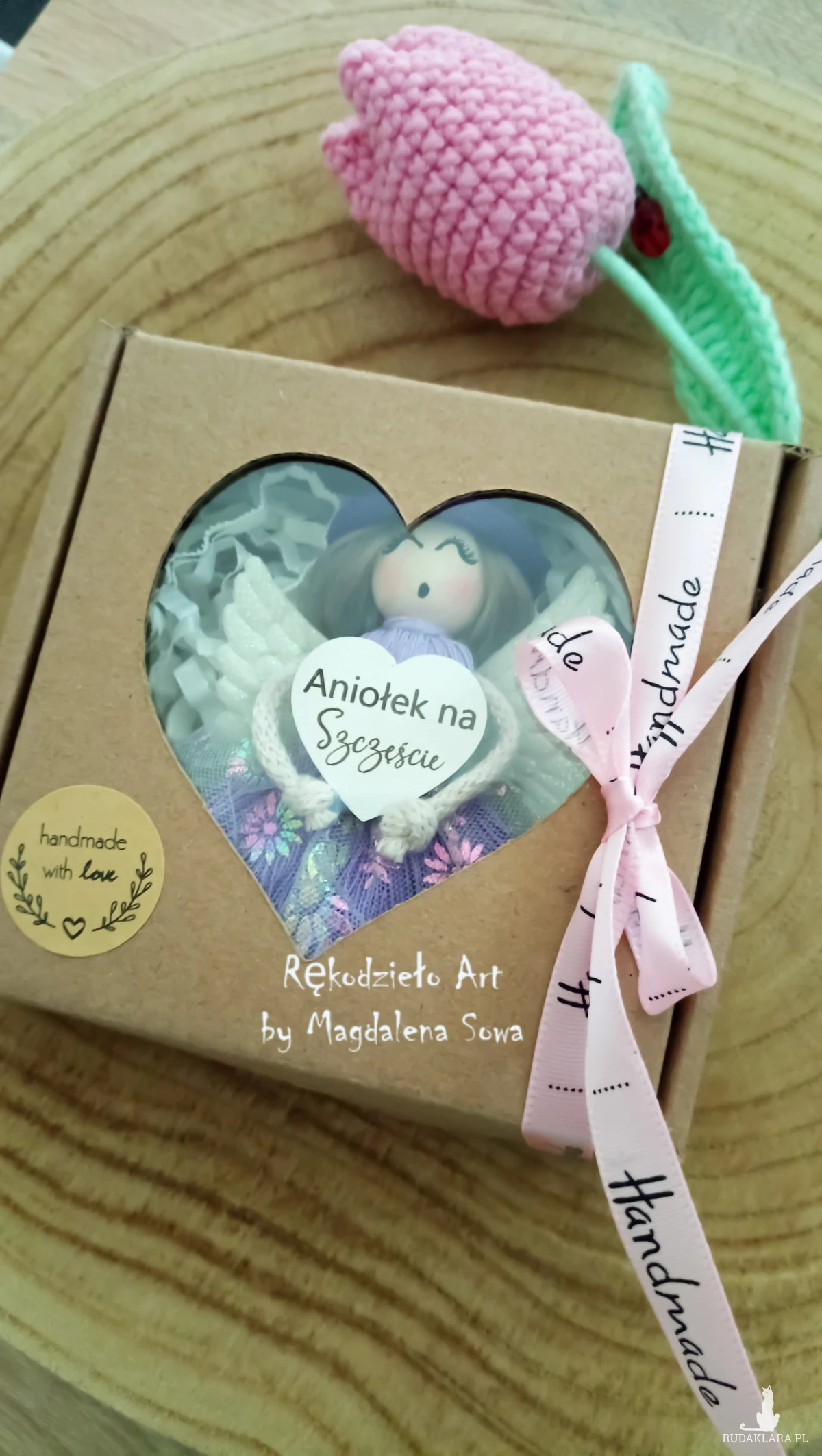 Aniołek zostanie zapakowany w kartonik z okienkiem w kształcie serduszka, przewiązany wstążeczką, gotowy do wręczenia jako prezent (zdjęcia).