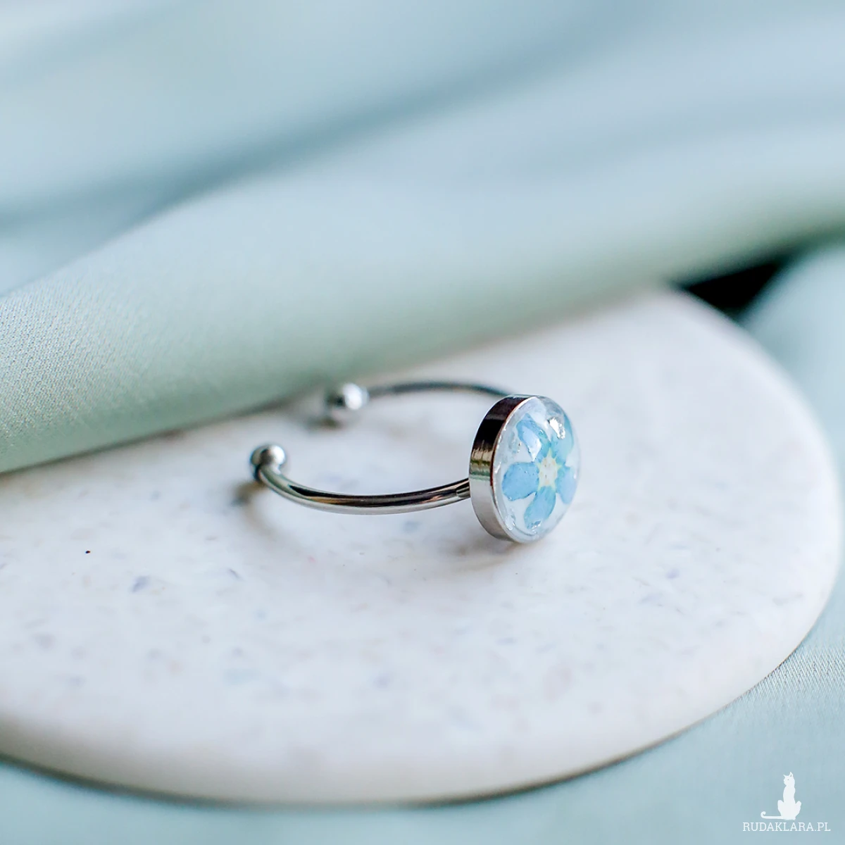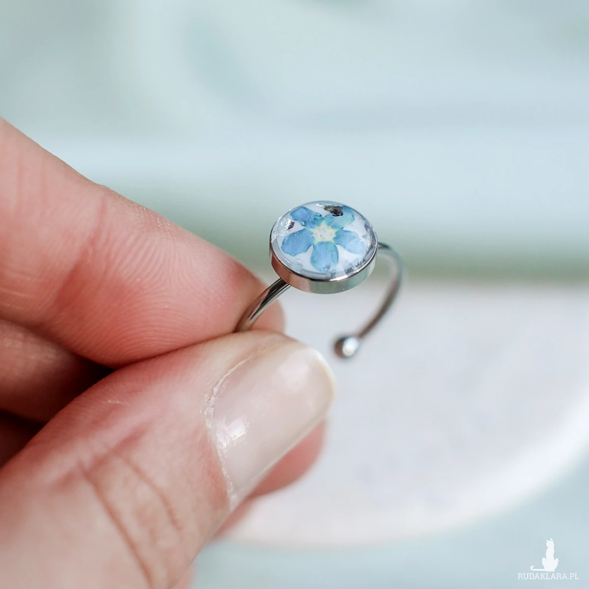Pierścionek wykonany jest z żywicy epoksydowej z wykorzystaniem suszonych kwiatów. Metalowe elementy to stal nierdzewna szlachetna chirurgiczna.