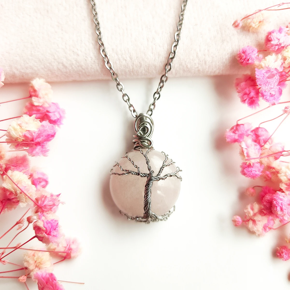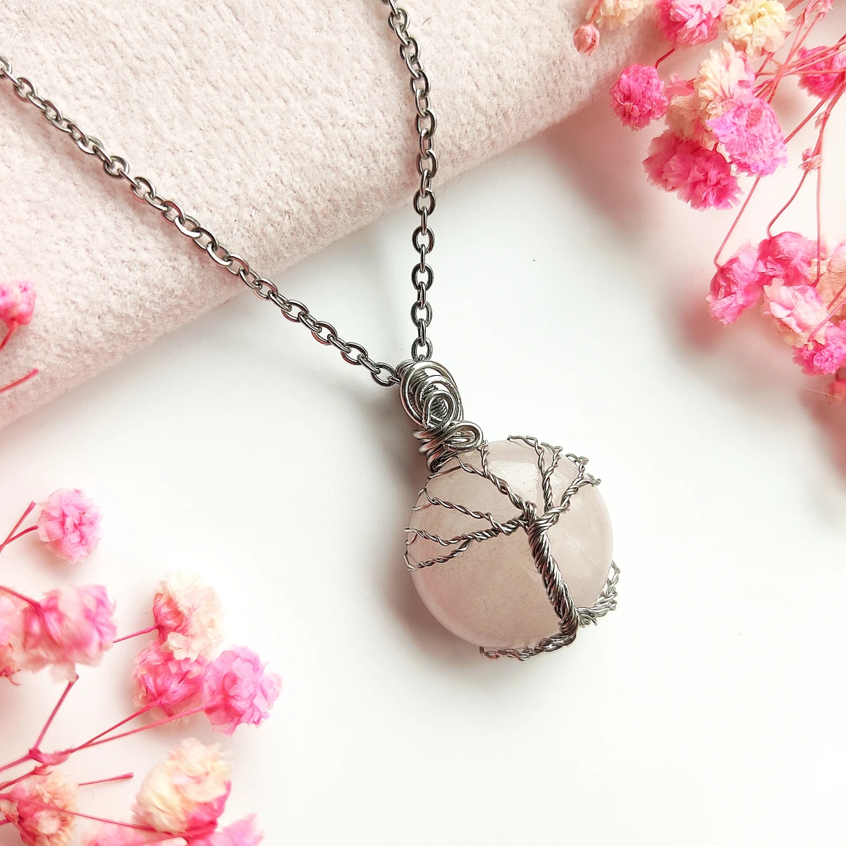 Naszyjnik Drzewo Życia z Kwarcem Różowym – stal chirurgiczna, wire wrapping, ręcznie wykonana biżuteria z naturalnym kamieniem