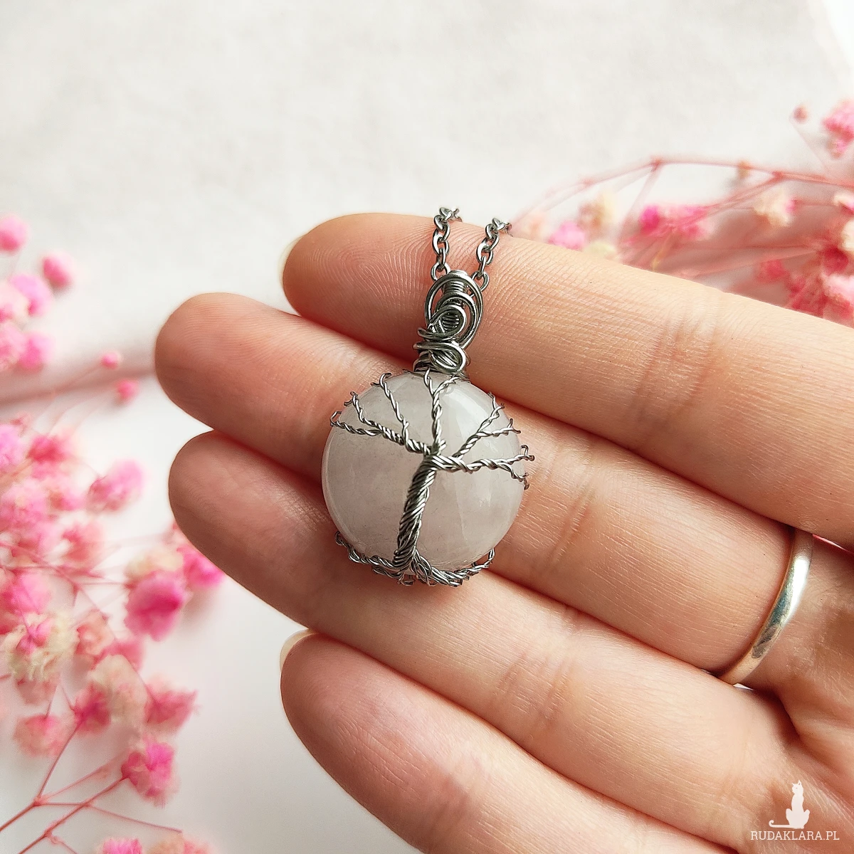 Głównym elementem naszyjnika jest kwarc różowy, naturalny kamień znany ze swoich właściwości wspierających miłość, harmonię i wewnętrzny spokój. Kamień ten został starannie oszlifowany i oprawiony ręcznie, tworząc w jego centrum symboliczne Drzewo Życia – znak siły, wzrostu i połączenia z naturą.