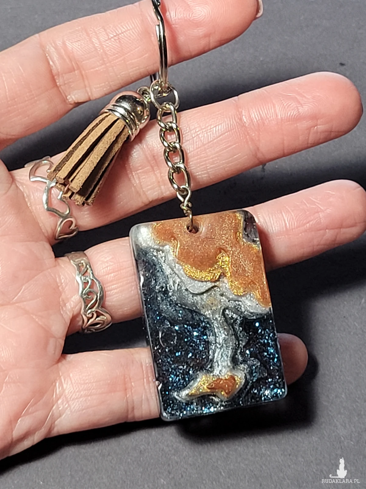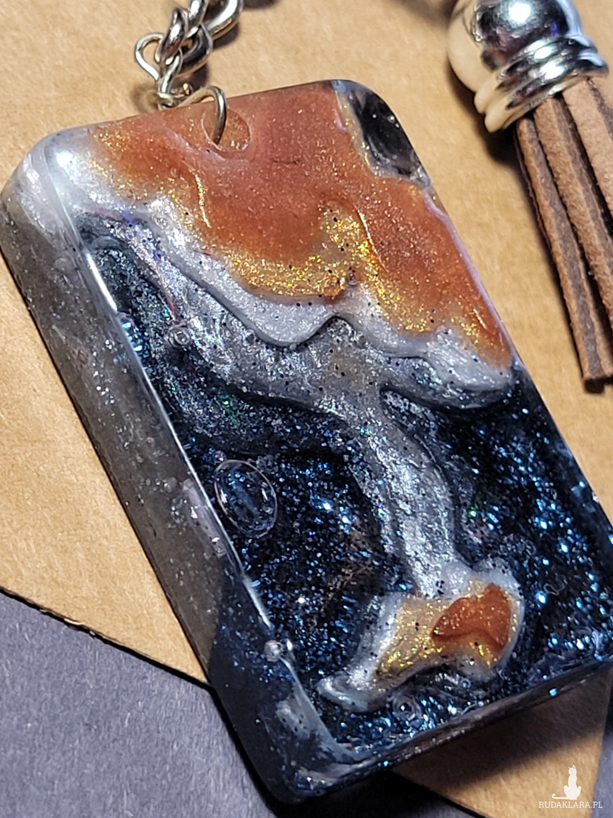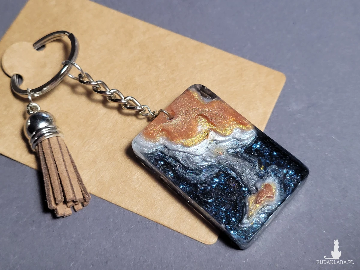 • Brelok zawieszka Wyspa czarno-brązowy to unikatowy stylowy dodatek do kluczy lub torebki. Jego element główny jest własnoręcznie zrobiony z żywicy epoksydowej z dodaniem pyłków różnych odcieni na rożnych etapach pracy dla odzyskania efektu warsw i głęmbi. Prostokątny kształt i ciemne kolory dodają breloku poważnego, powściągliwego charakteru, a designerski styl sprawia, że wyróżnia się spośród innych akcesoriów. Idealny dla miłośników oryginalnych i nietypowych dodatków.