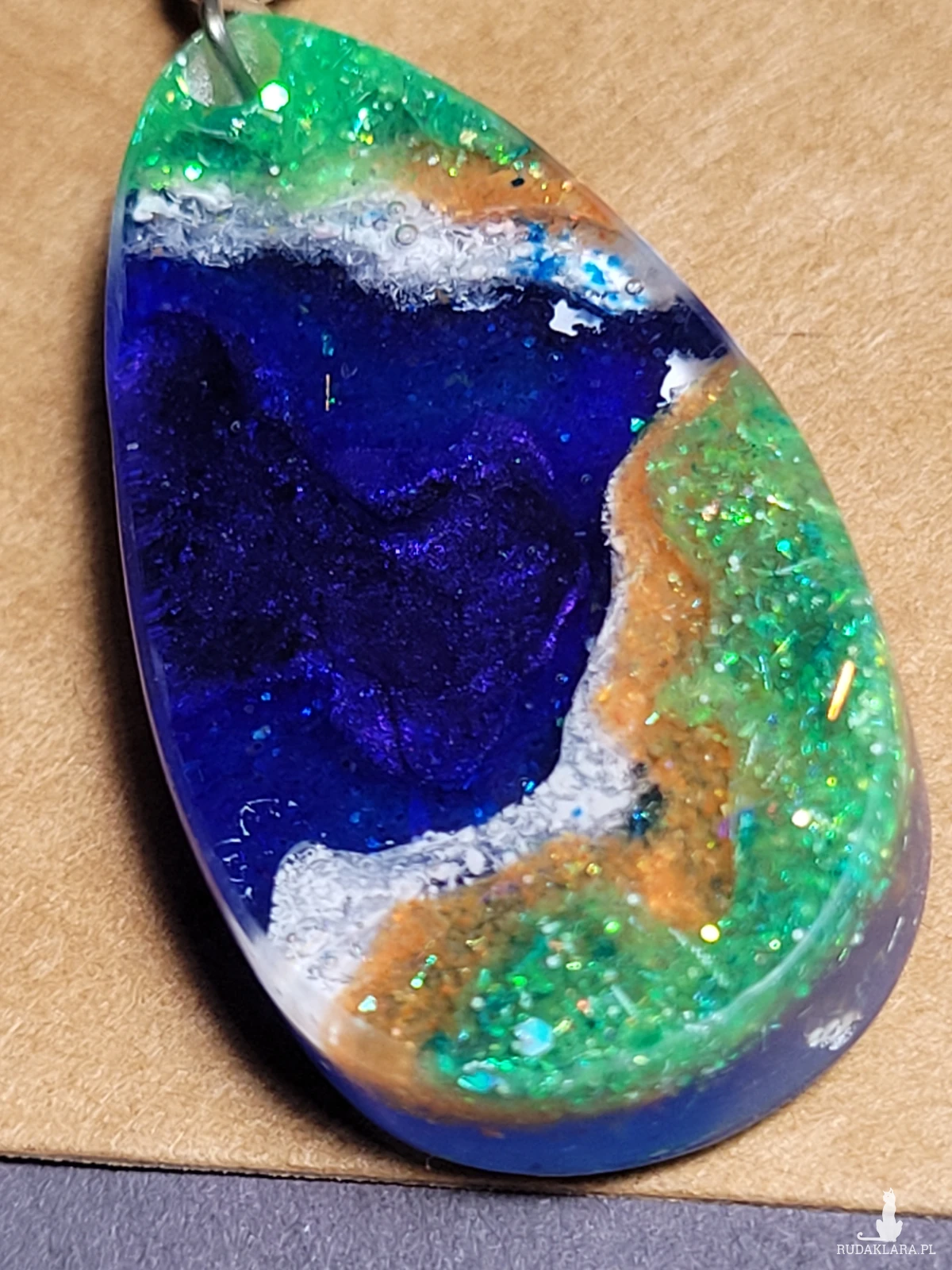 Jego element główny jest własnoręcznie zrobiony z żywicy epoksydowej z dodaniem pyłków różnych odcieni na rożnych etapach pracy dla odzyskania efektu warsw i głęmbi.