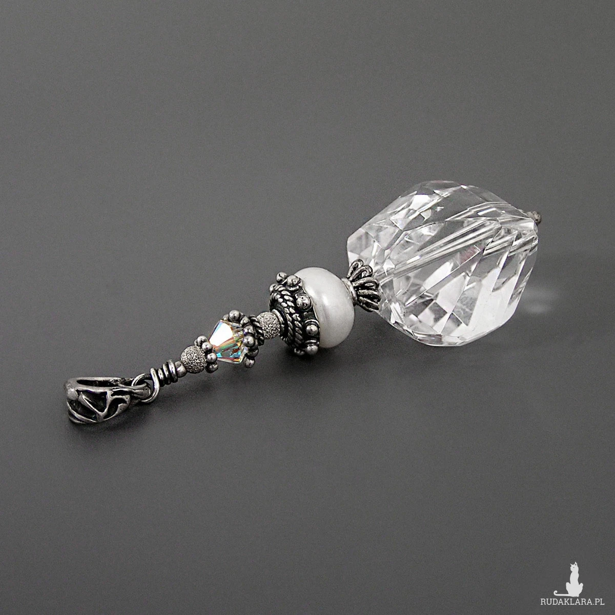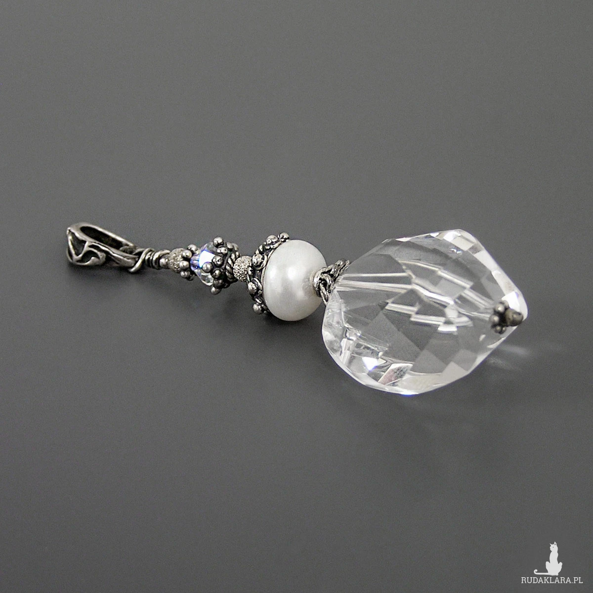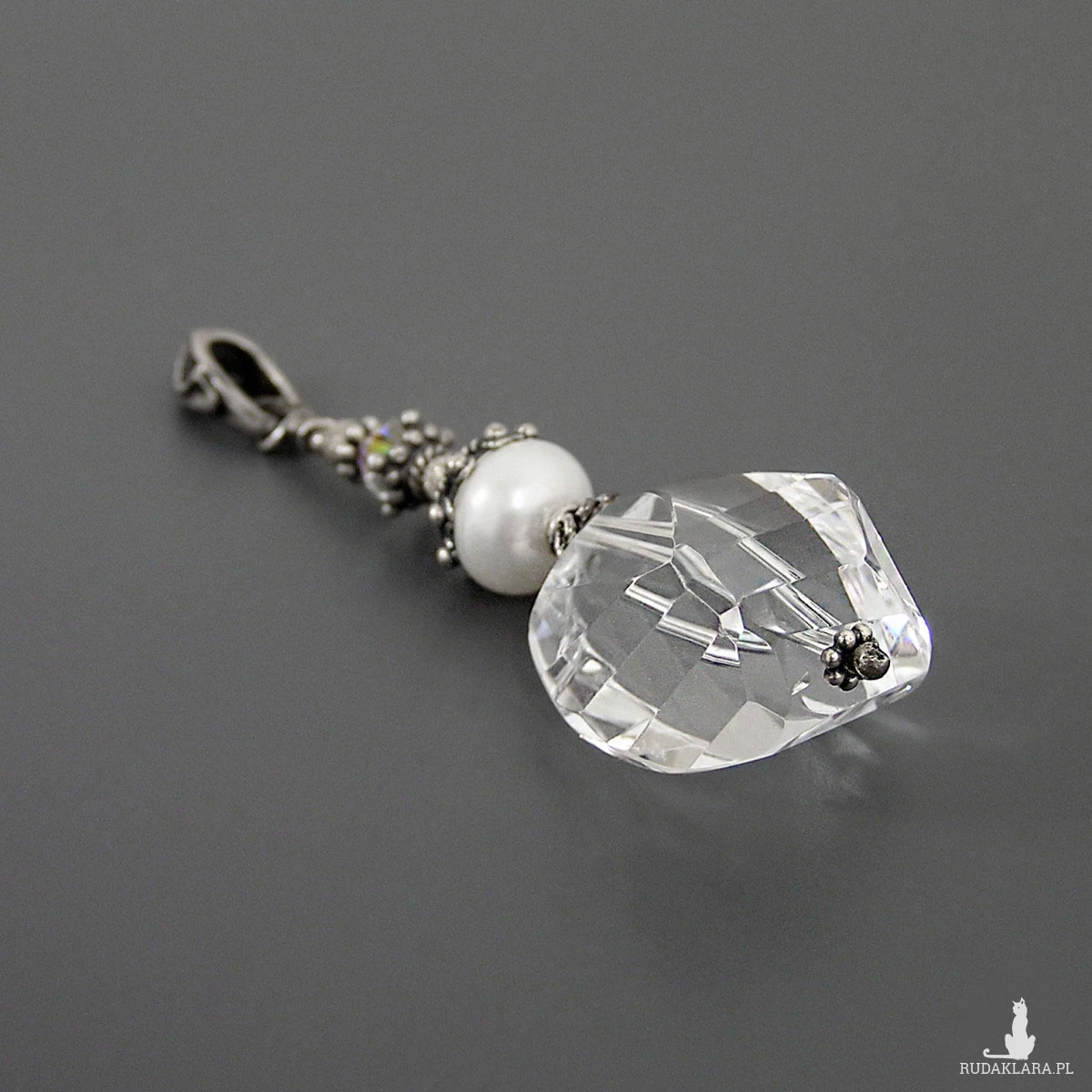 Fasetowany kwarc o wymiarach 20 x 17 x 13 mm. Perła 10 x 6 mm. Opalizujący kryształek 6x6 mm.