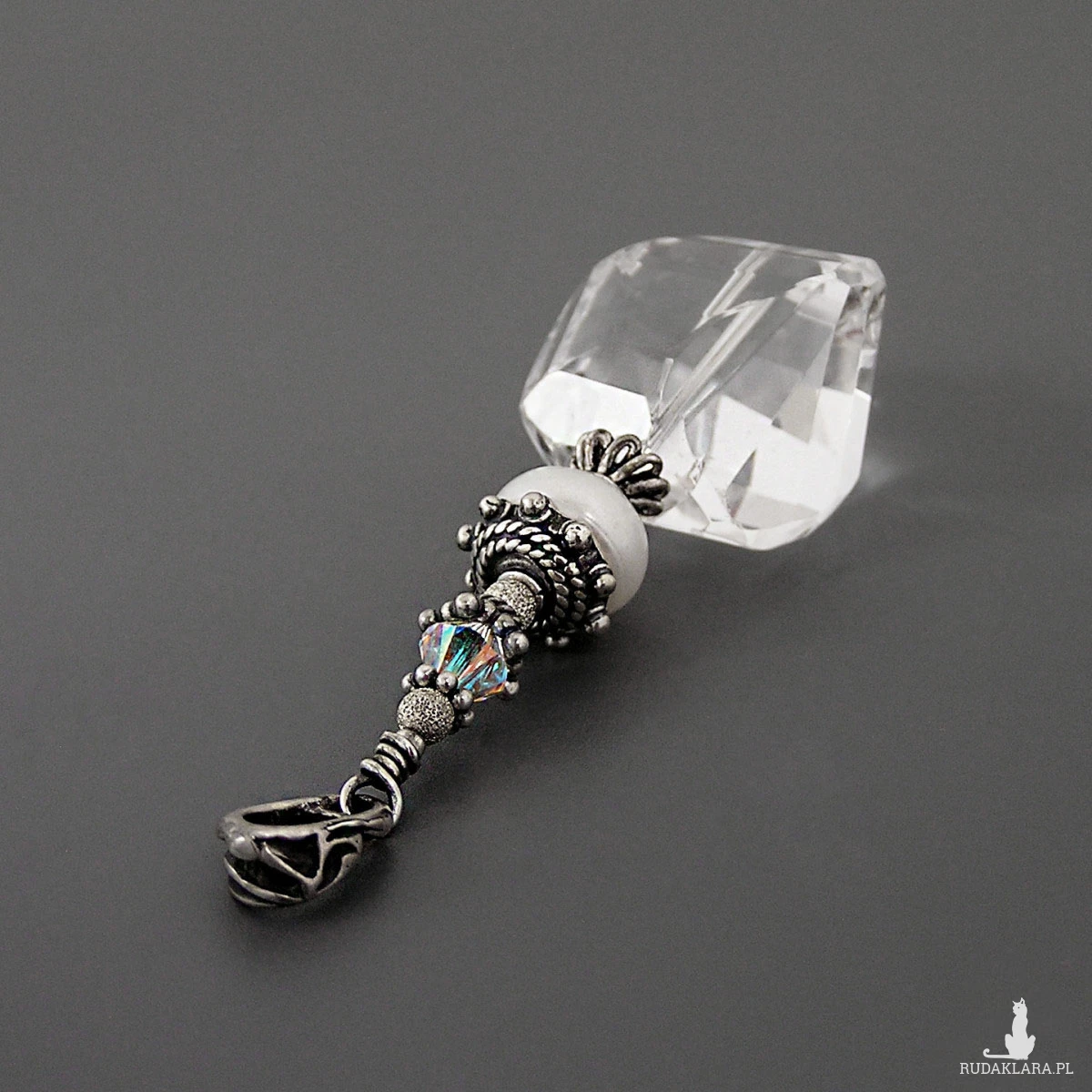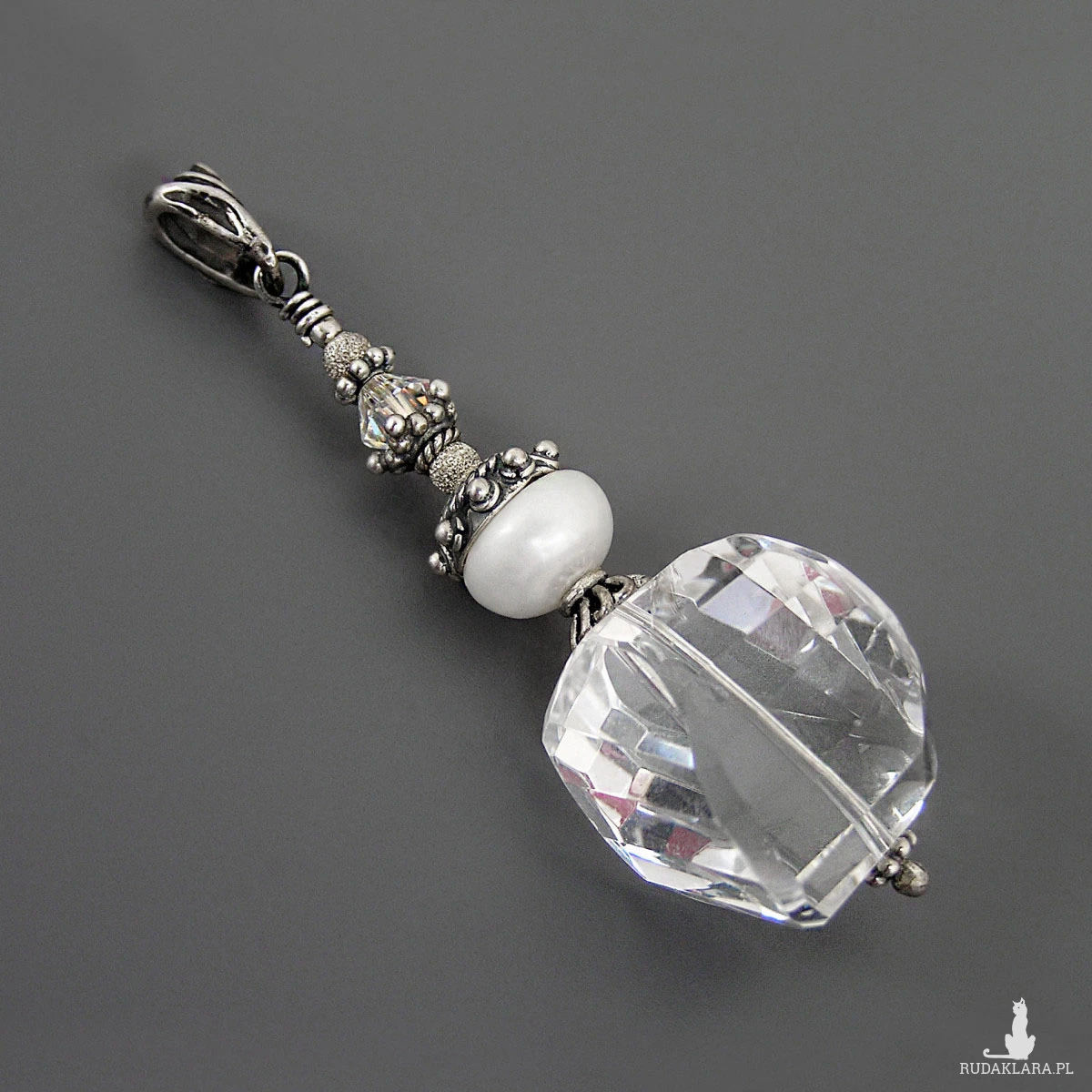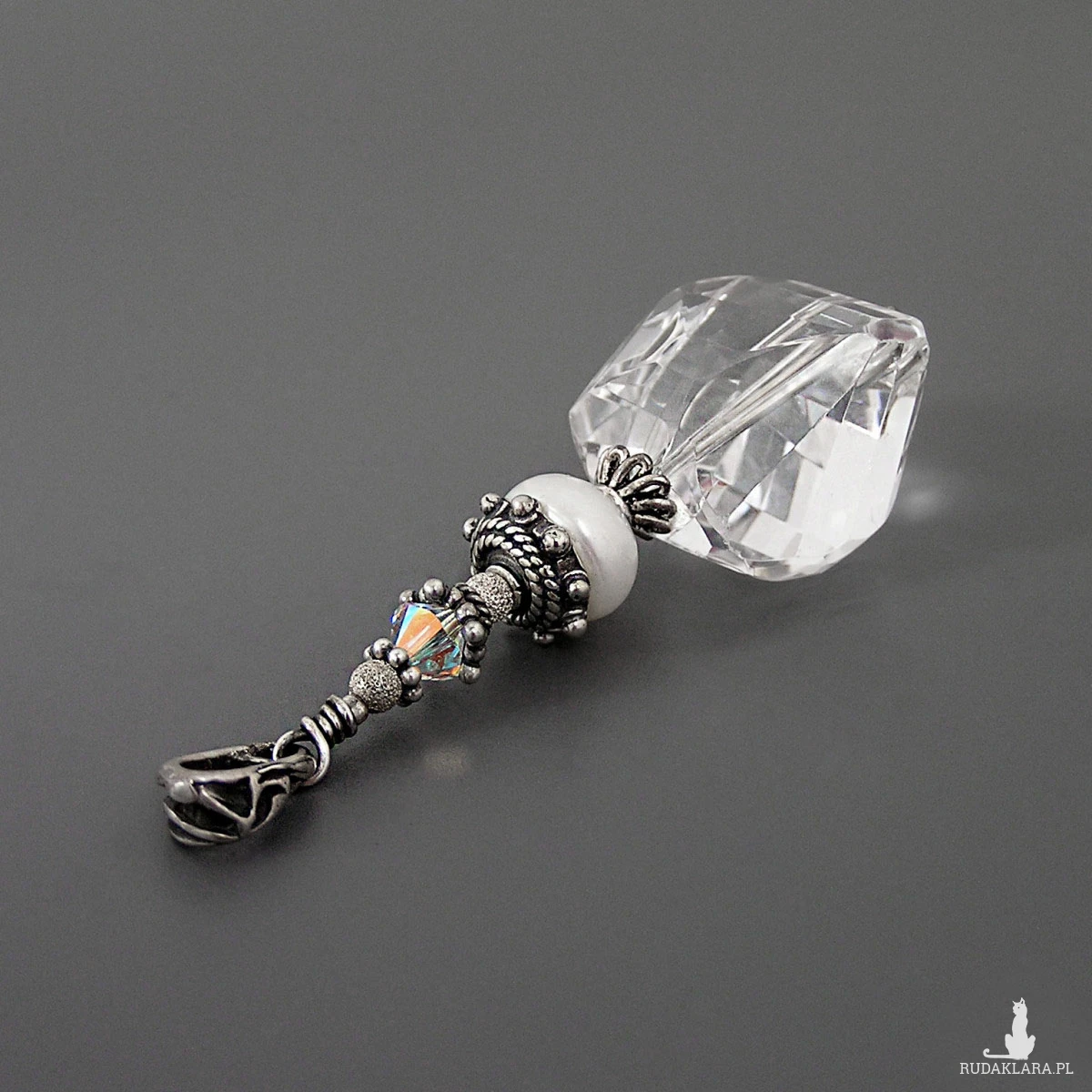 Fasetowany kwarc o wymiarach 20 x 17 x 13 mm. Perła 10 x 6 mm. Opalizujący kryształek 6x6 mm.