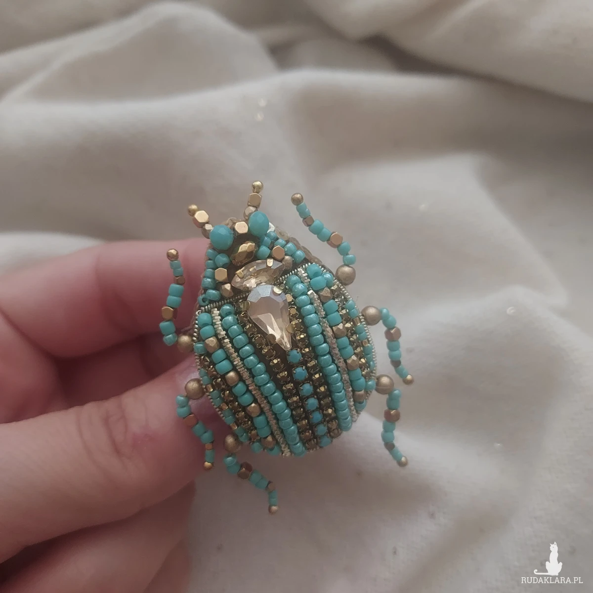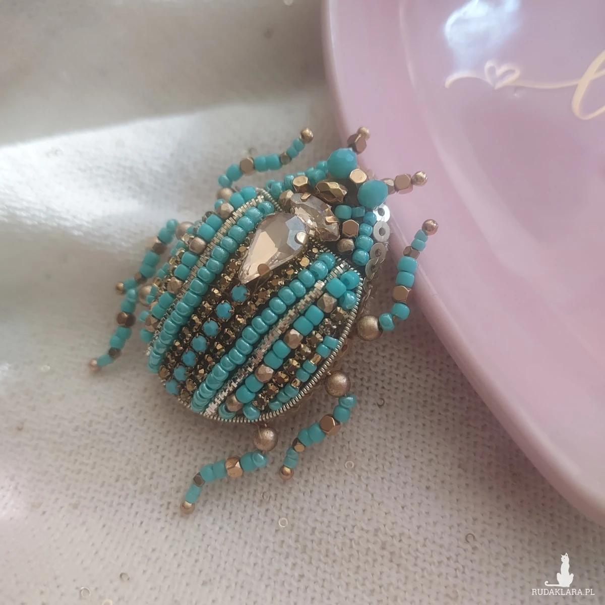 Broszka SKARABEUSZ w uroczym turkusowo-złotym kolorze dla miłośniczek turkusu, złota, owadów oraz natury.