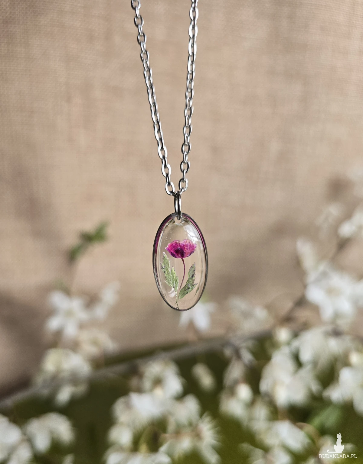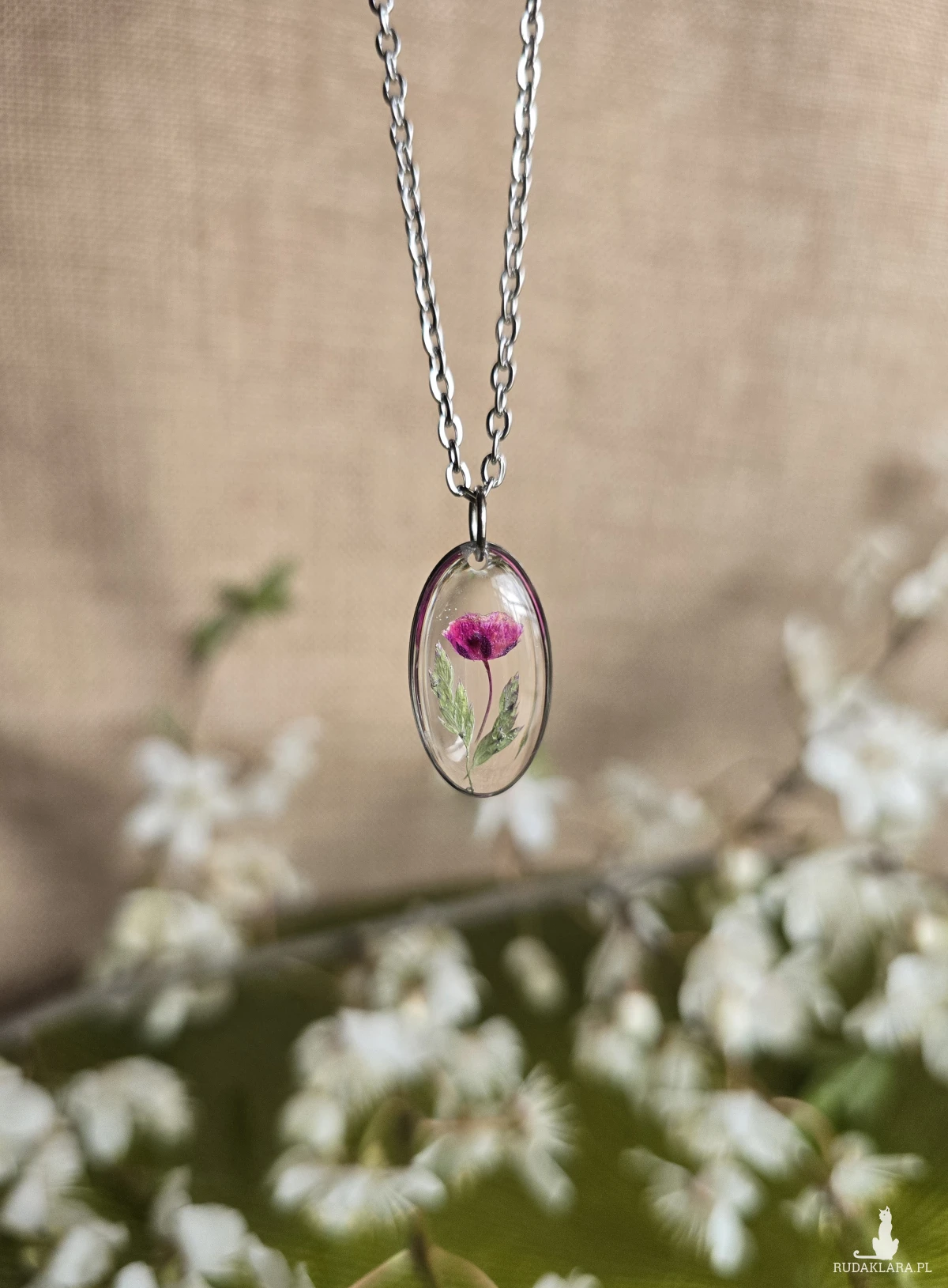Oferuję Państwu unikalną biżuterię. Zawieszka jest wykonana z suszonych kwiatów i żywicy epoksydowej. Biżuteria jest wspaniałym i oryginalnym prezentem na lata.