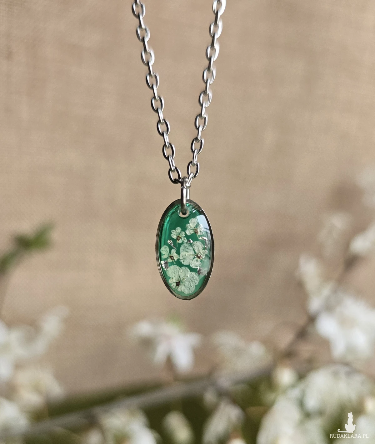 Oferuję Państwu unikalną biżuterię. Zawieszka jest wykonana z suszonych kwiatów i żywicy epoksydowej. Biżuteria jest wspaniałym i oryginalnym prezentem na lata.